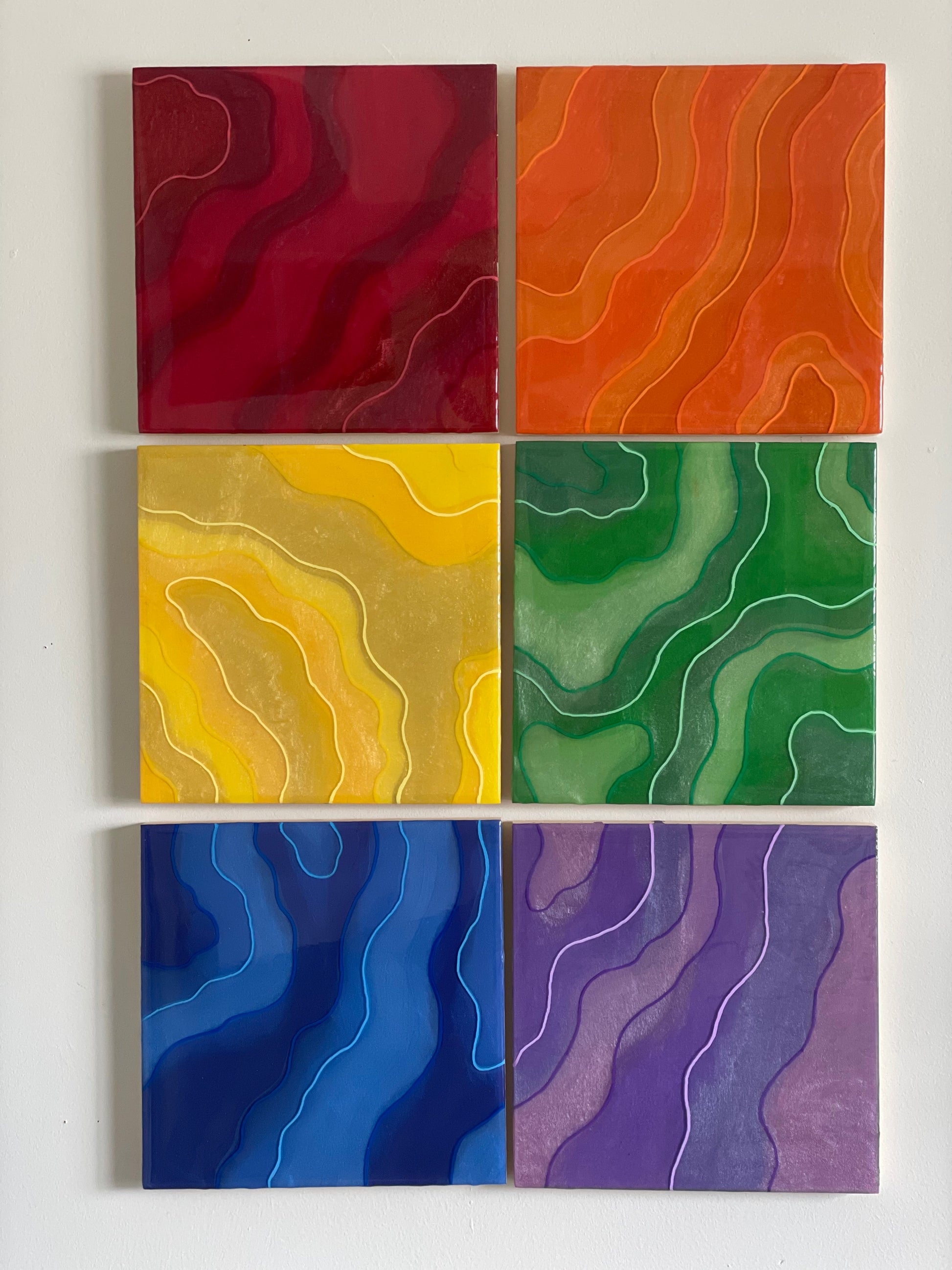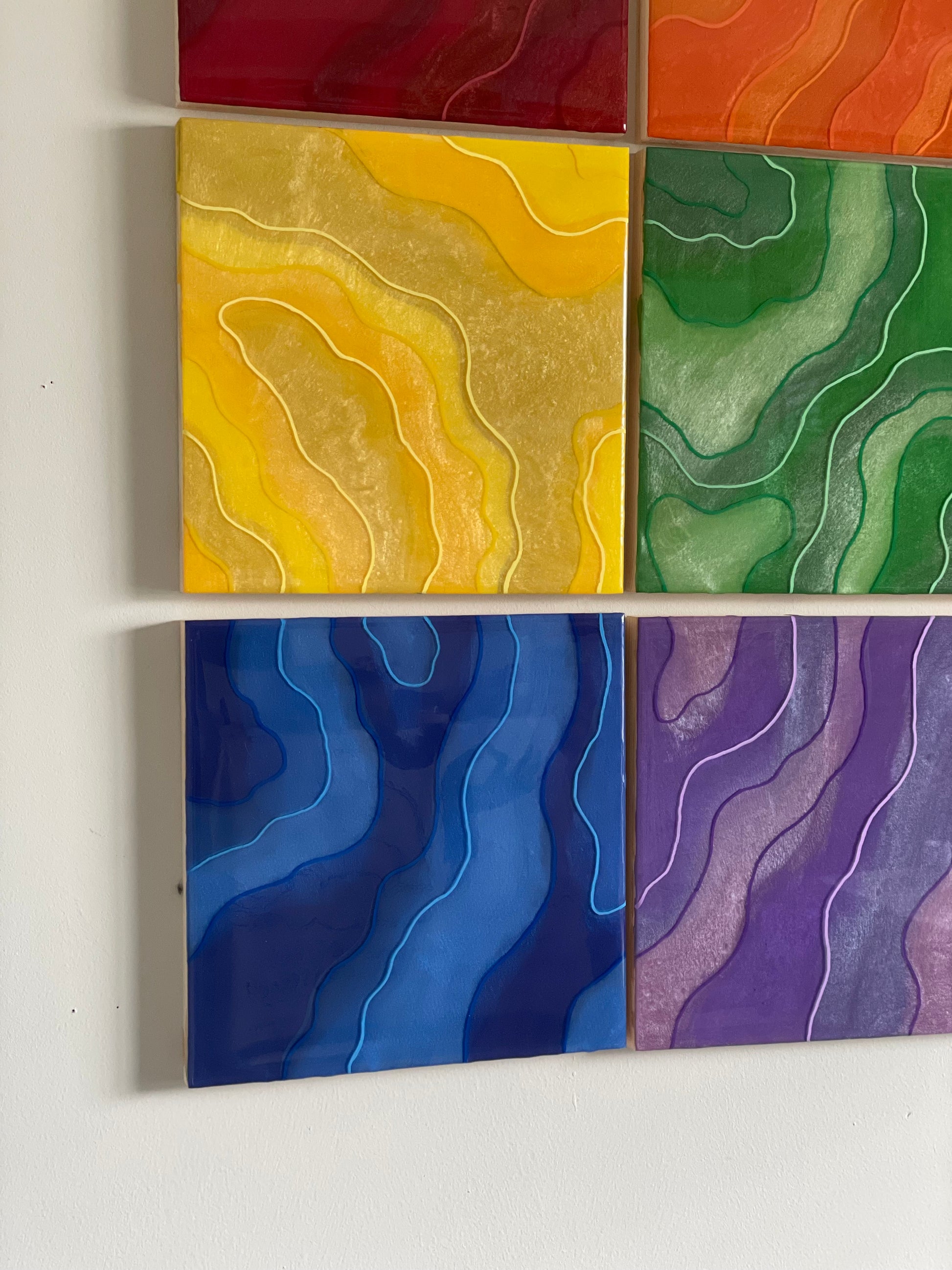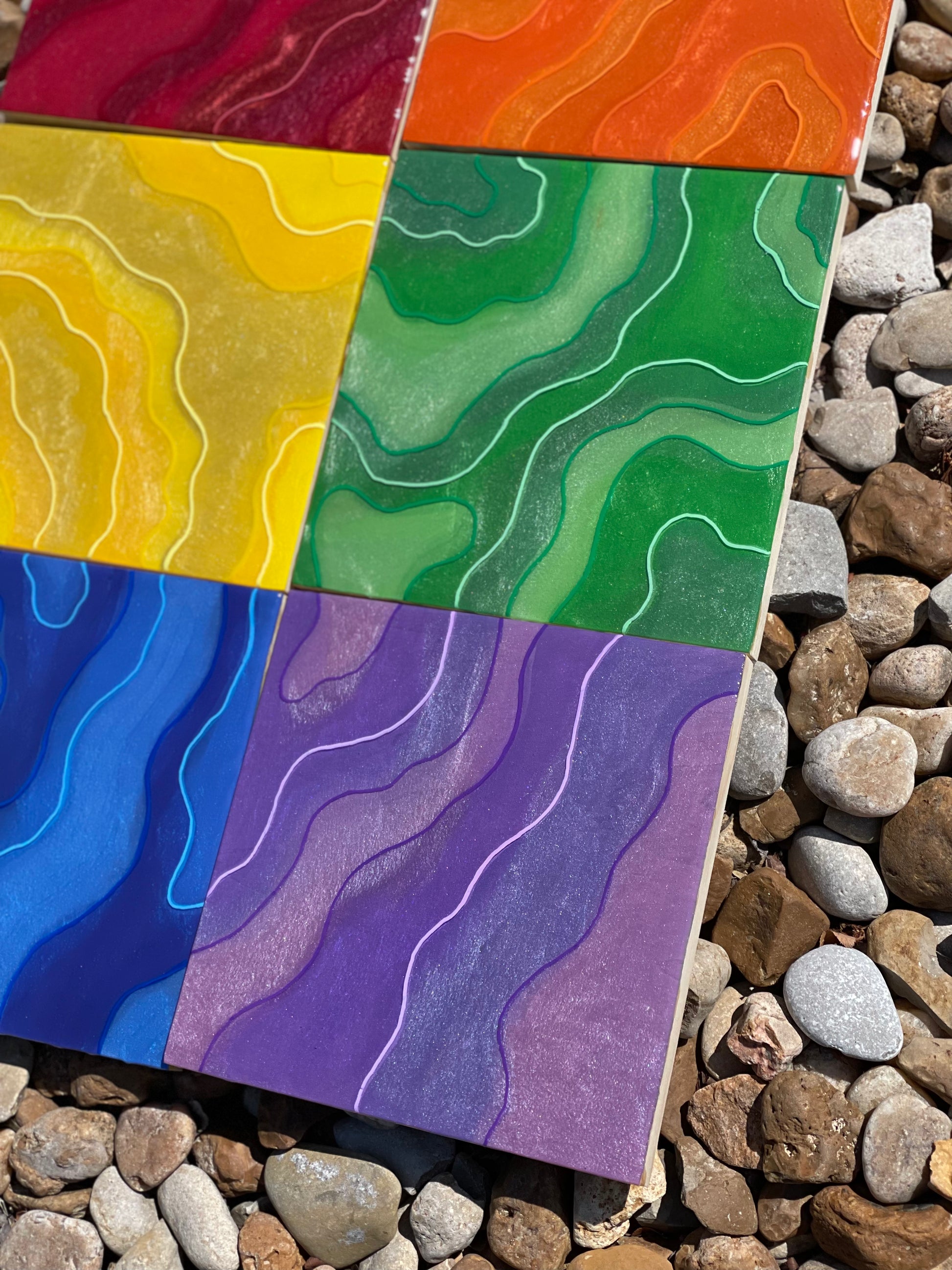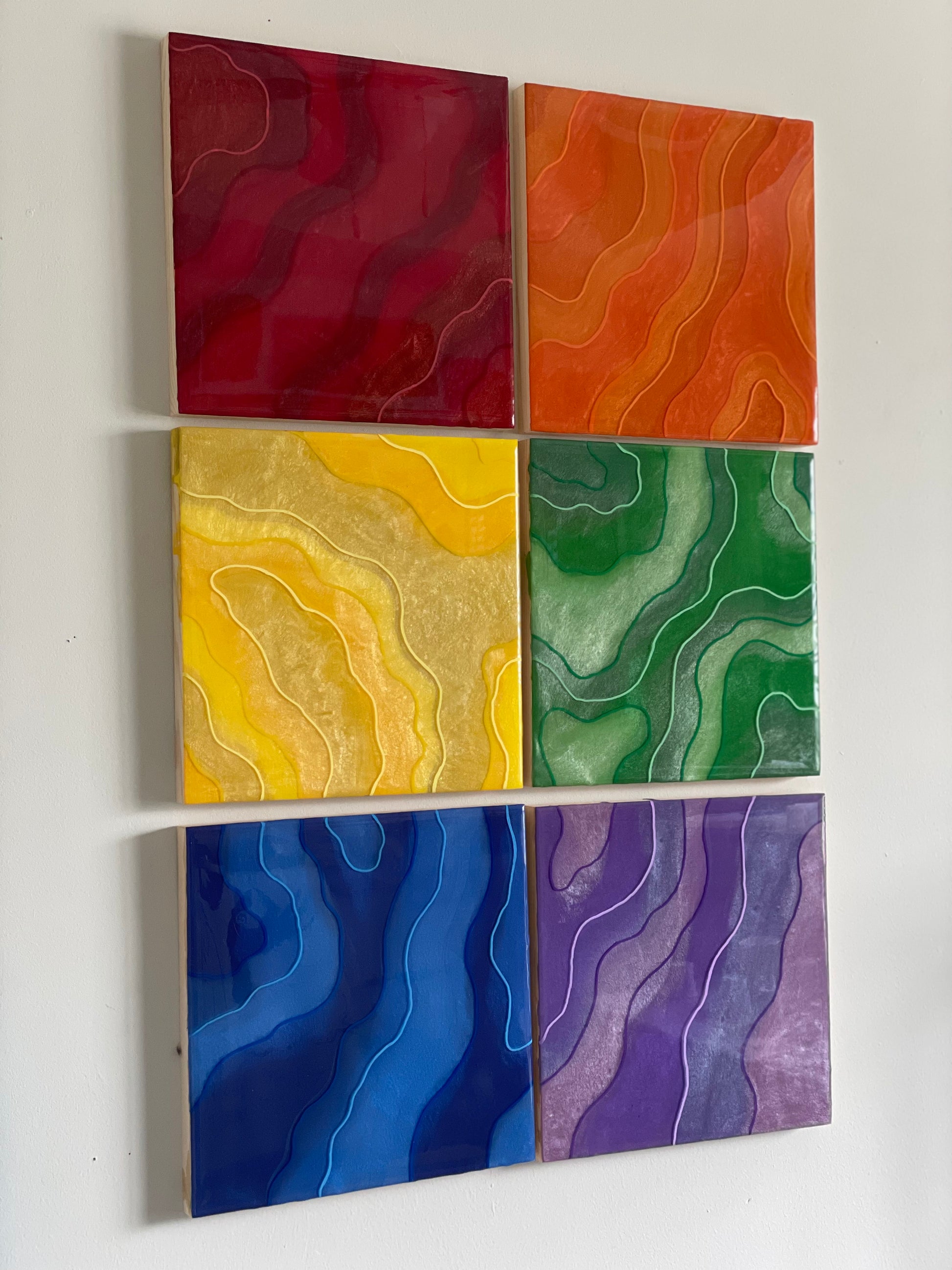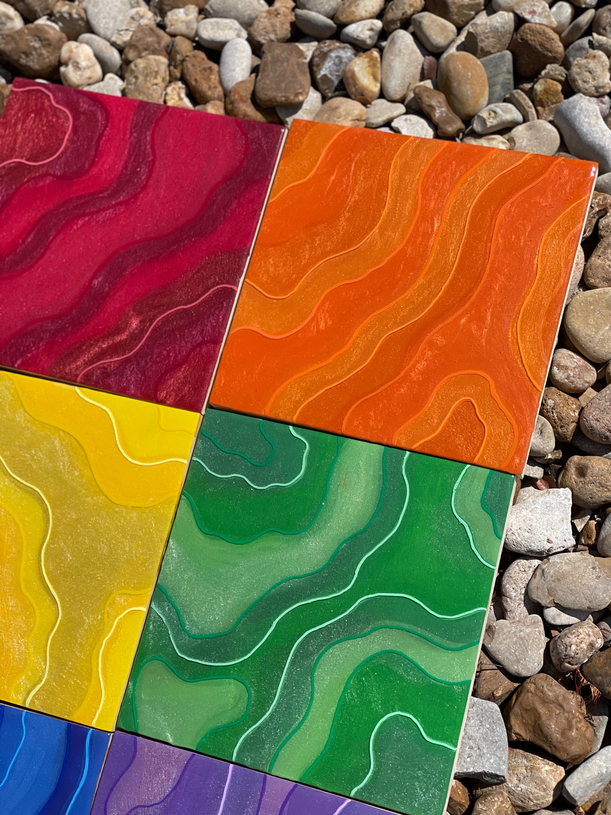 This artwork is made of 6 10x10 inch canvases; each canvas is one color of the rainbow, however the design of the geode matches up to each canvas so they truly go together & flow. (Hanging up these canvases together will be the length of 30x20 inch)