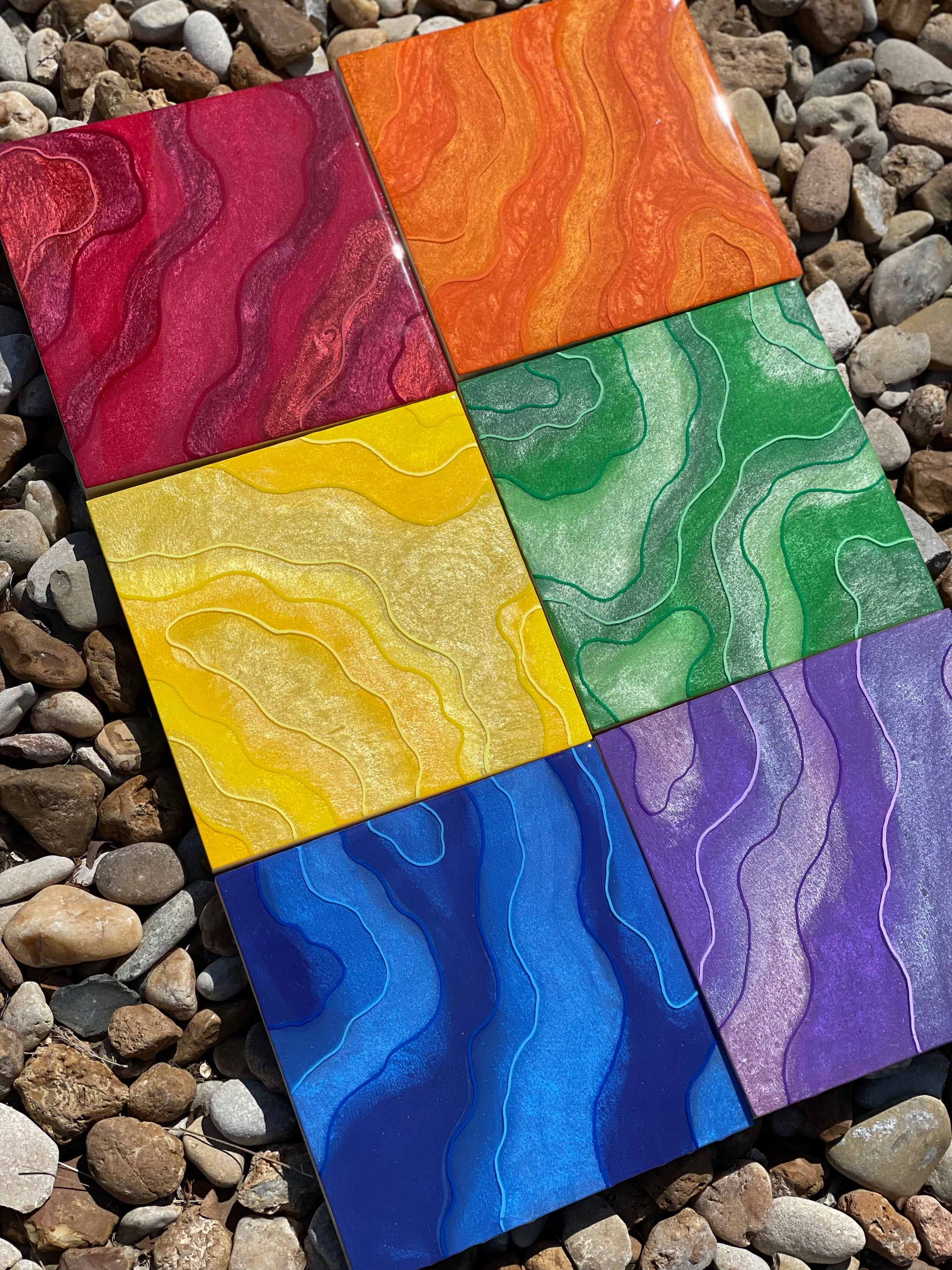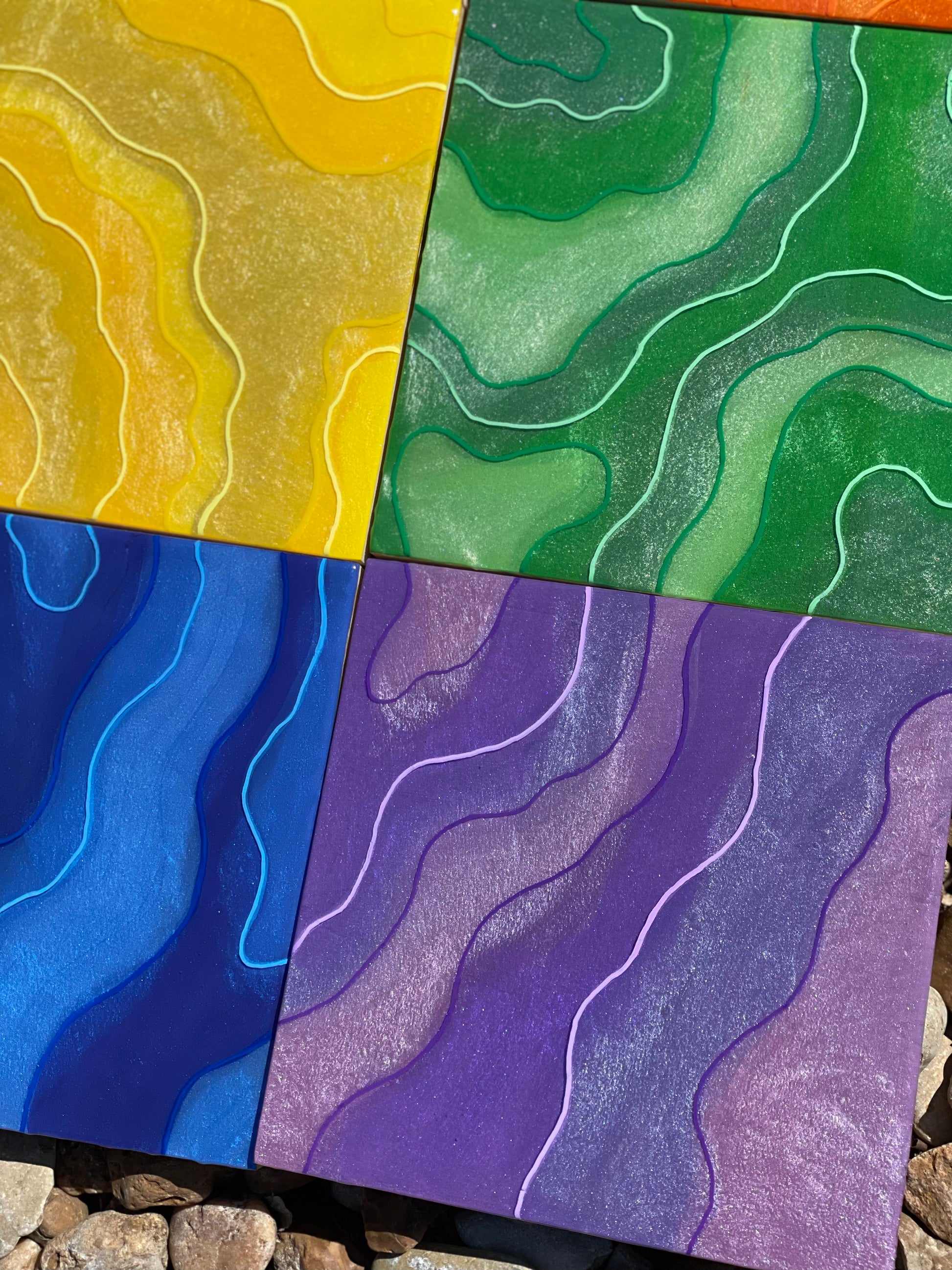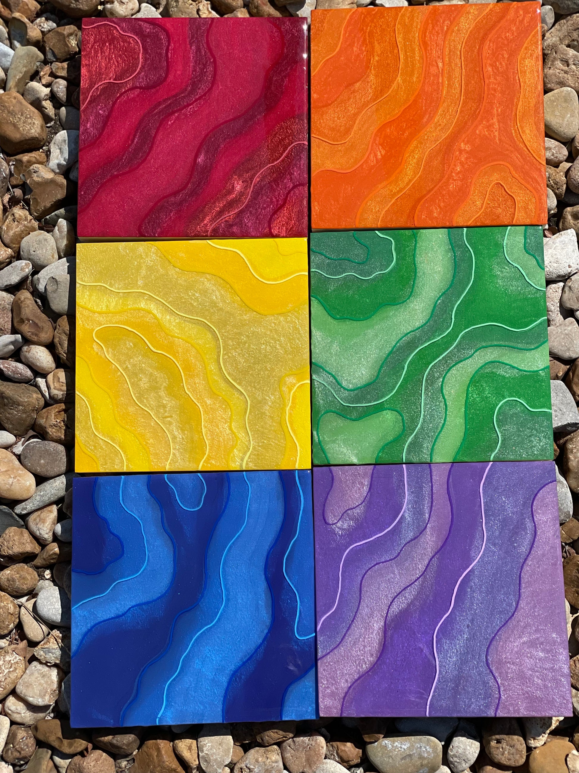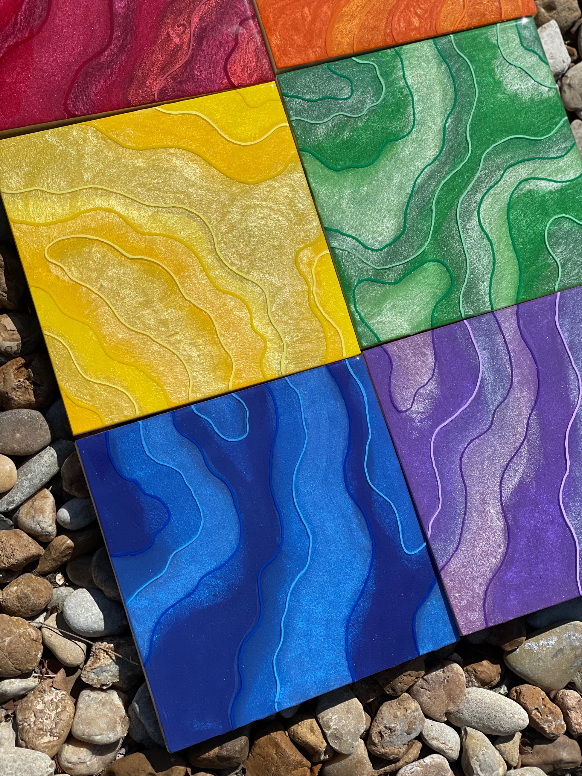 This artwork is made of 6 10x10 inch canvases; each canvas is one color of the rainbow, however the design of the geode matches up to each canvas so they truly go together & flow. (Hanging up these canvases together will be the length of 30x20 inch)