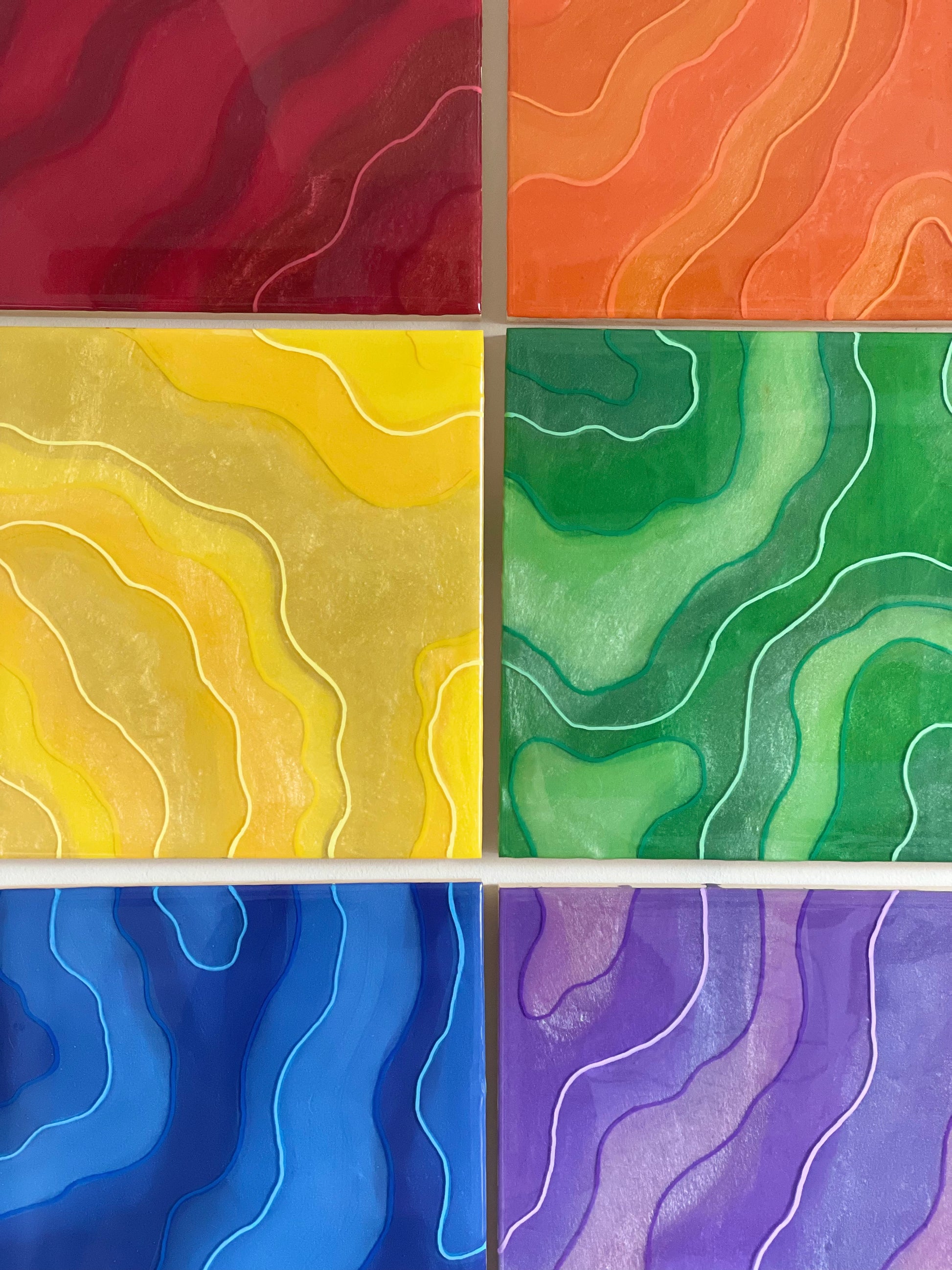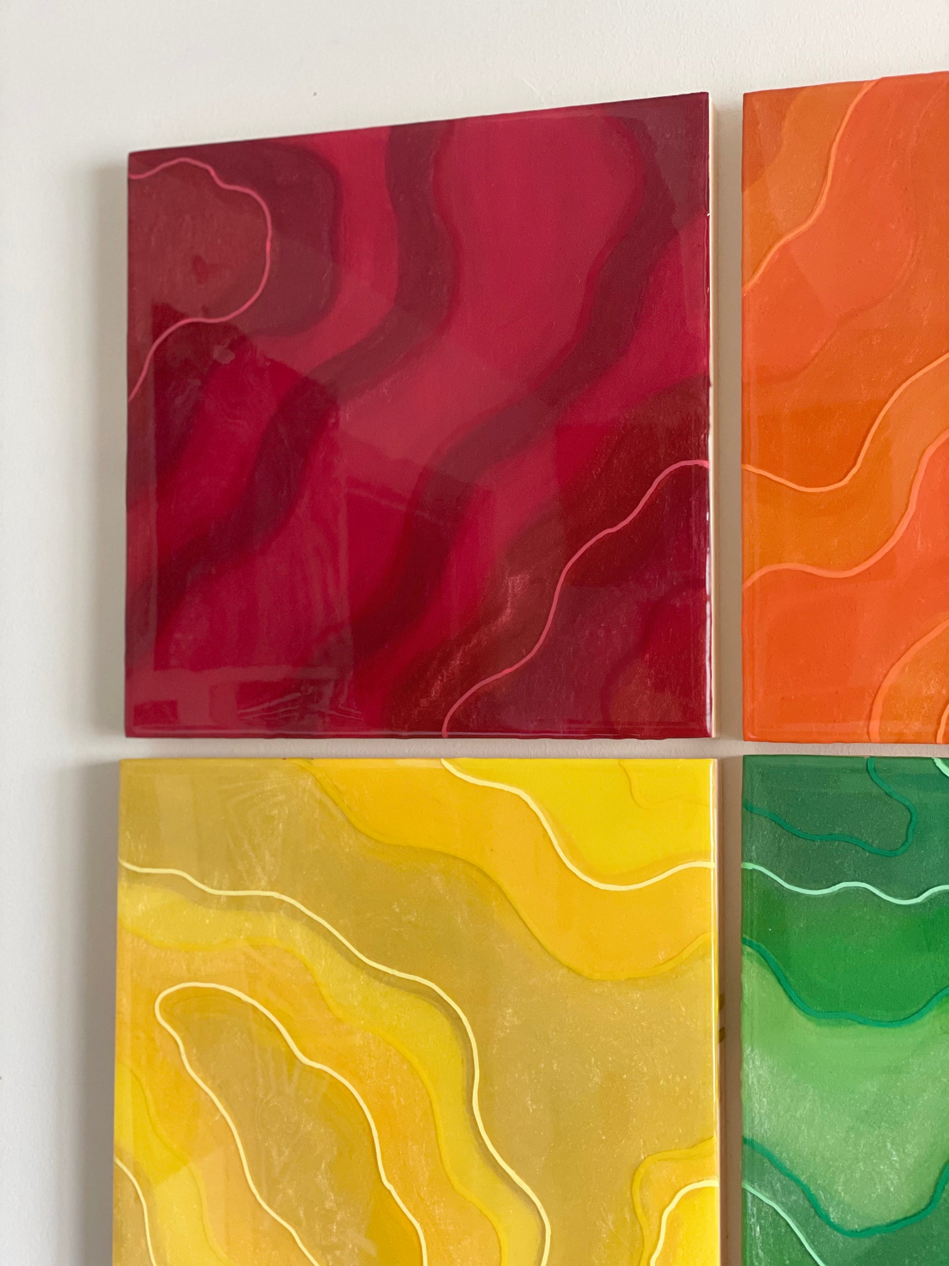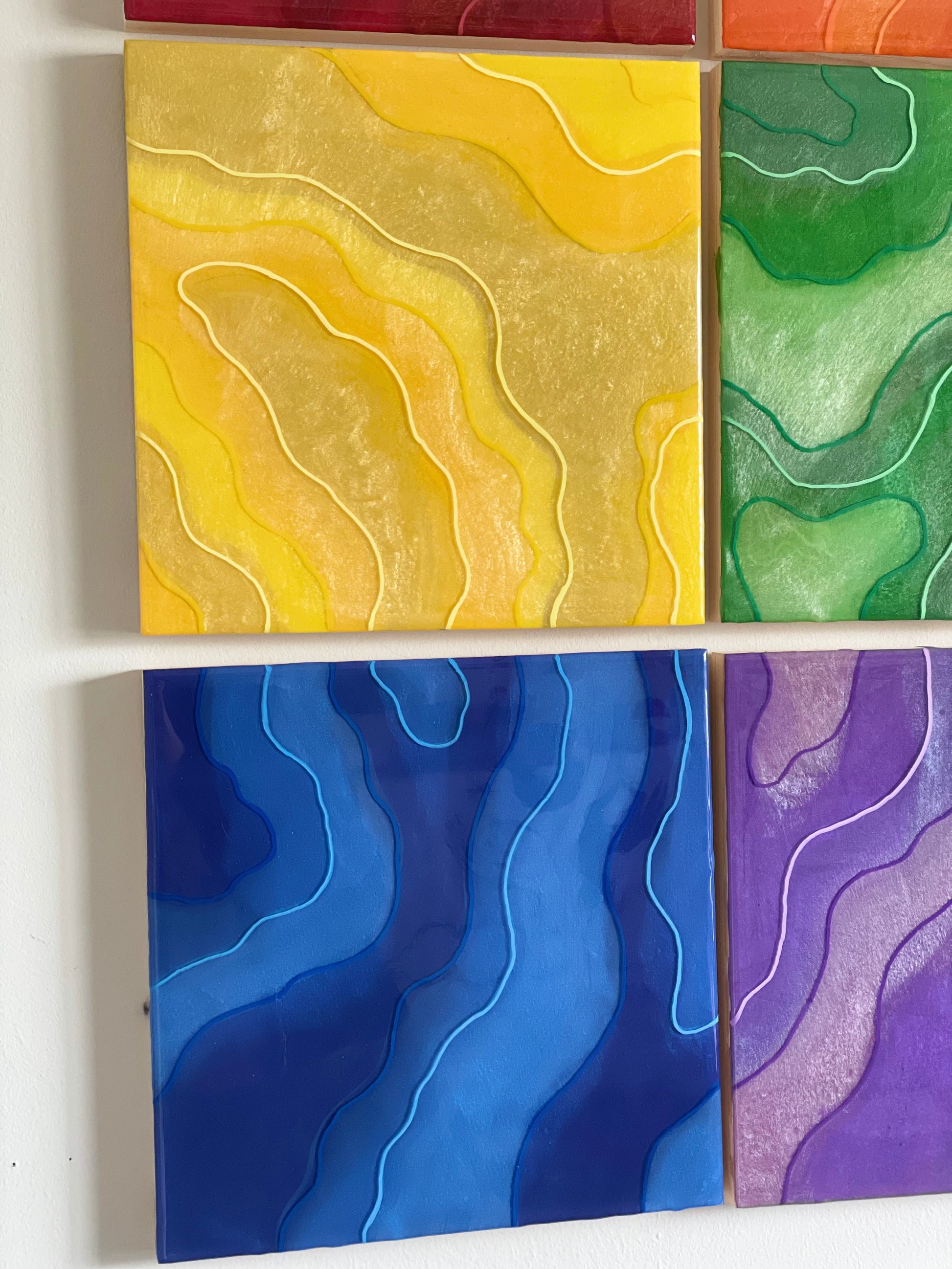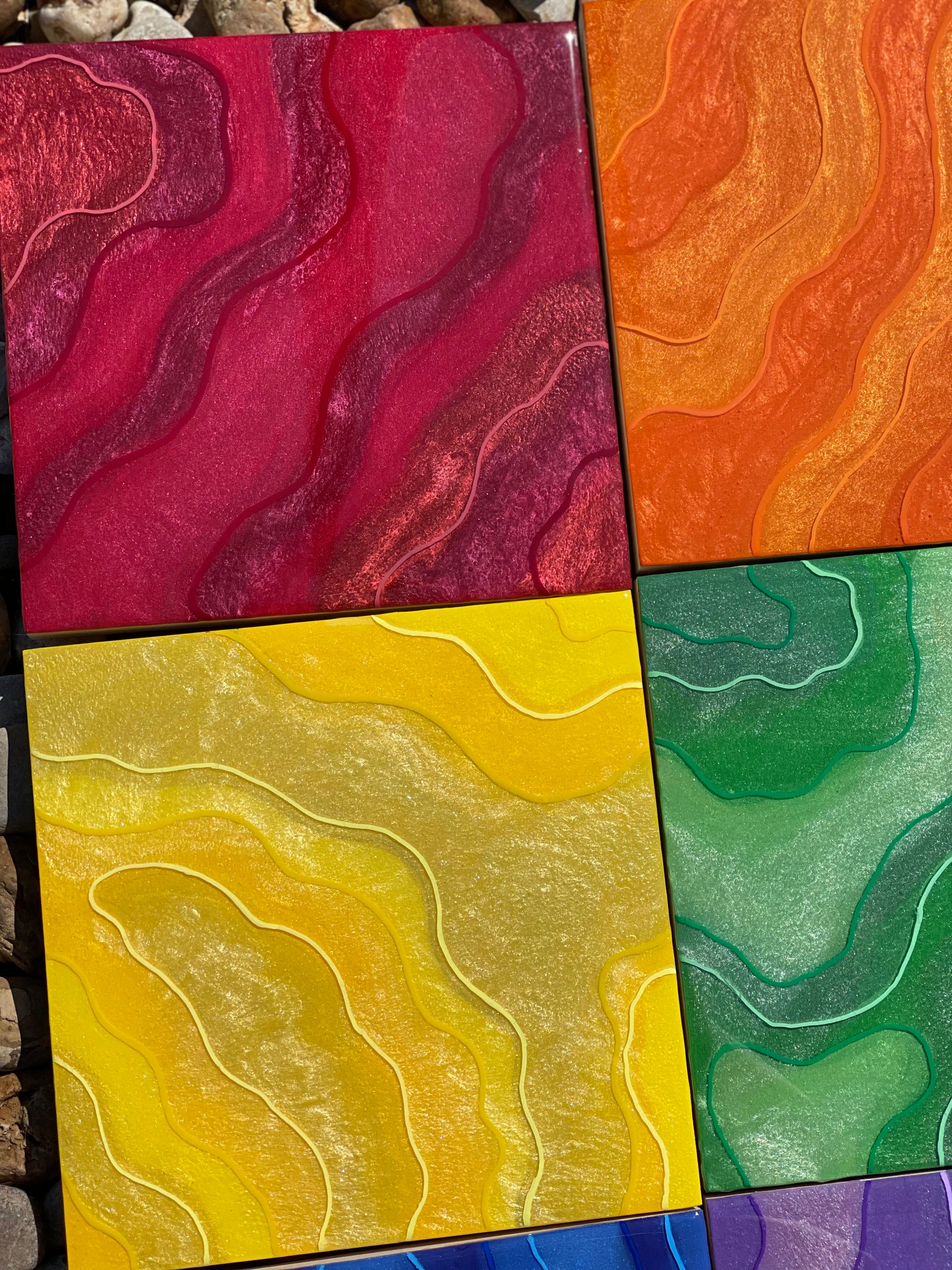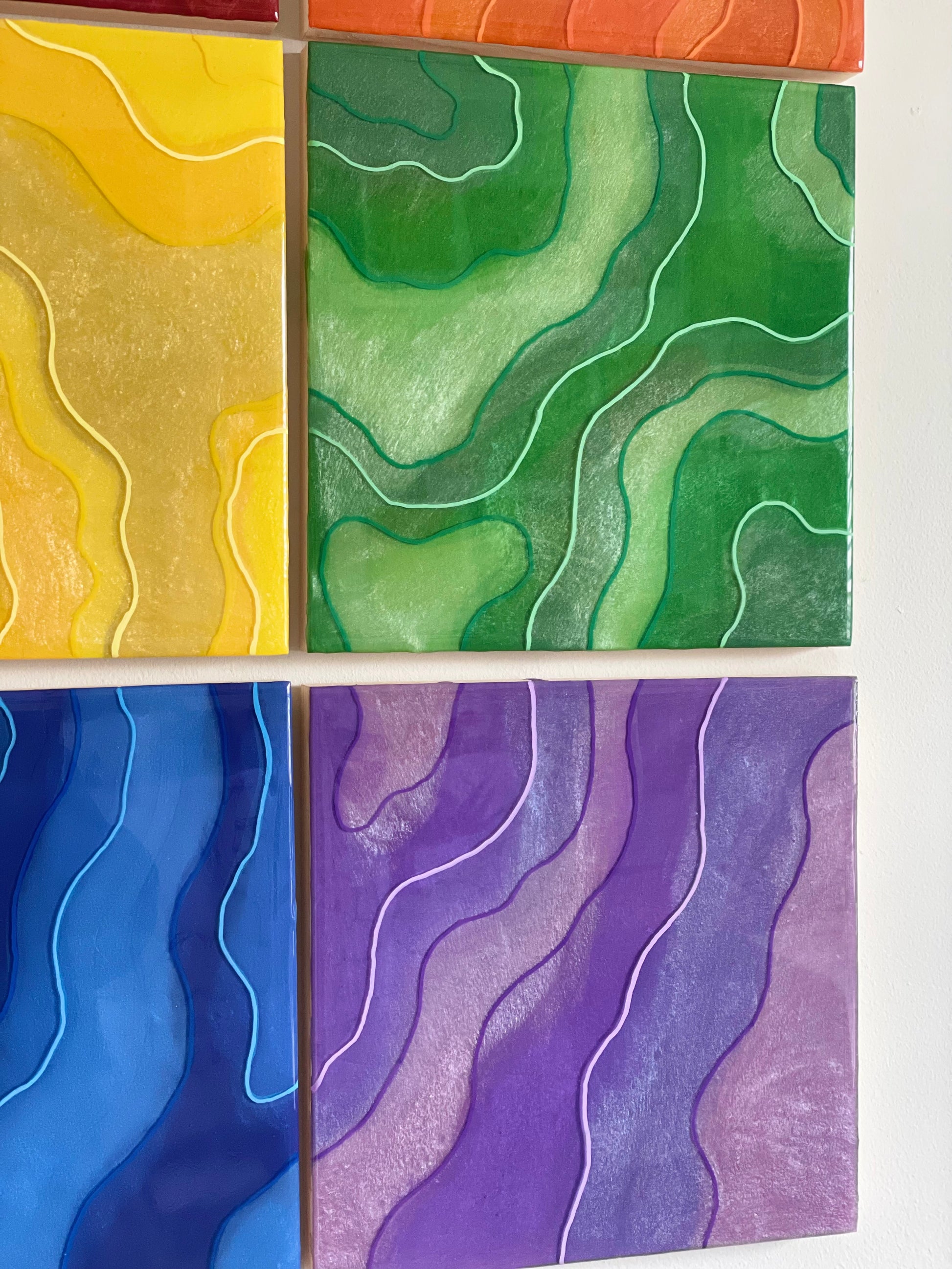 This artwork is made of 6 10x10 inch canvases; each canvas is one color of the rainbow, however the design of the geode matches up to each canvas so they truly go together & flow. (Hanging up these canvases together will be the length of 30x20 inch)