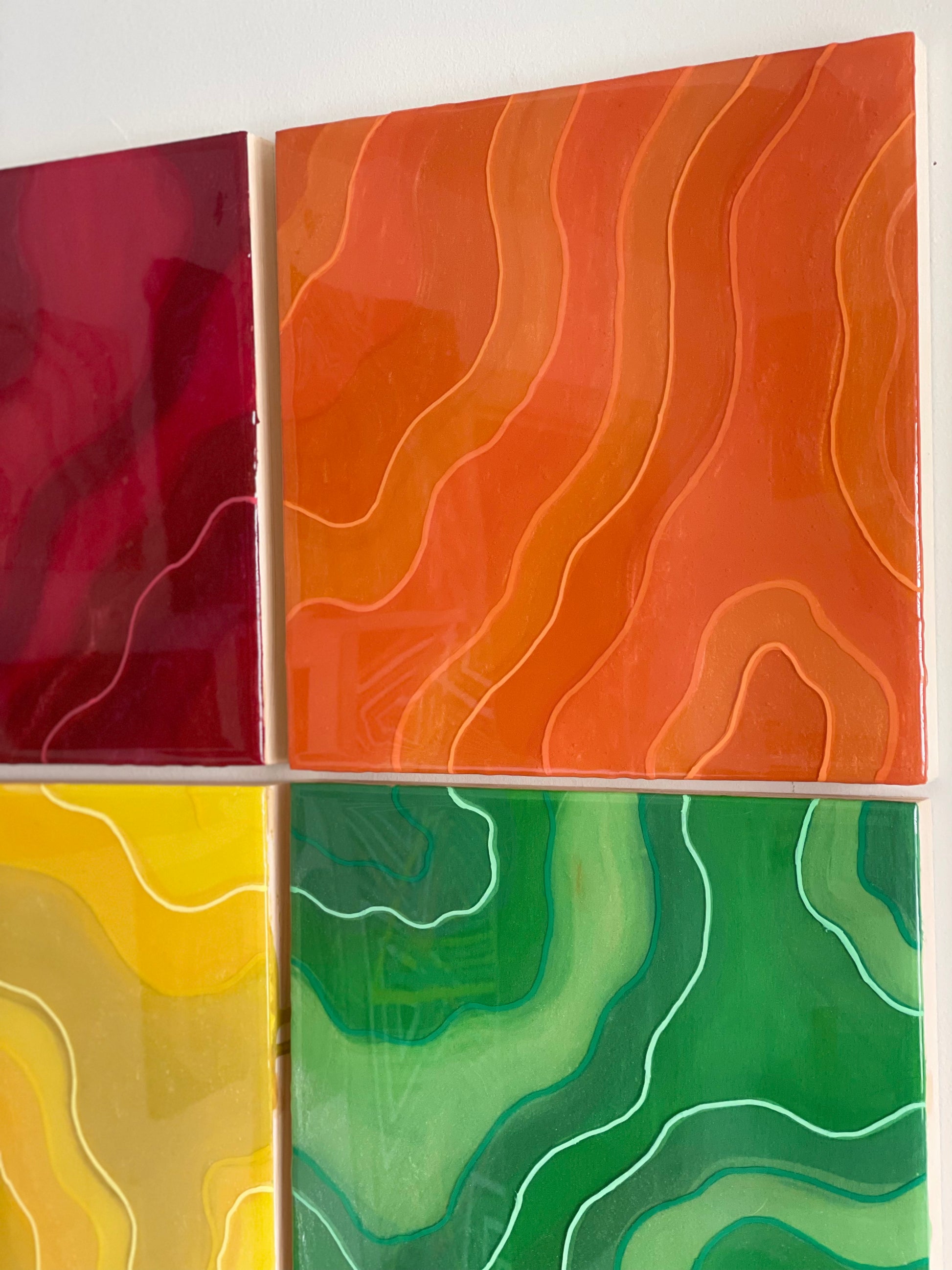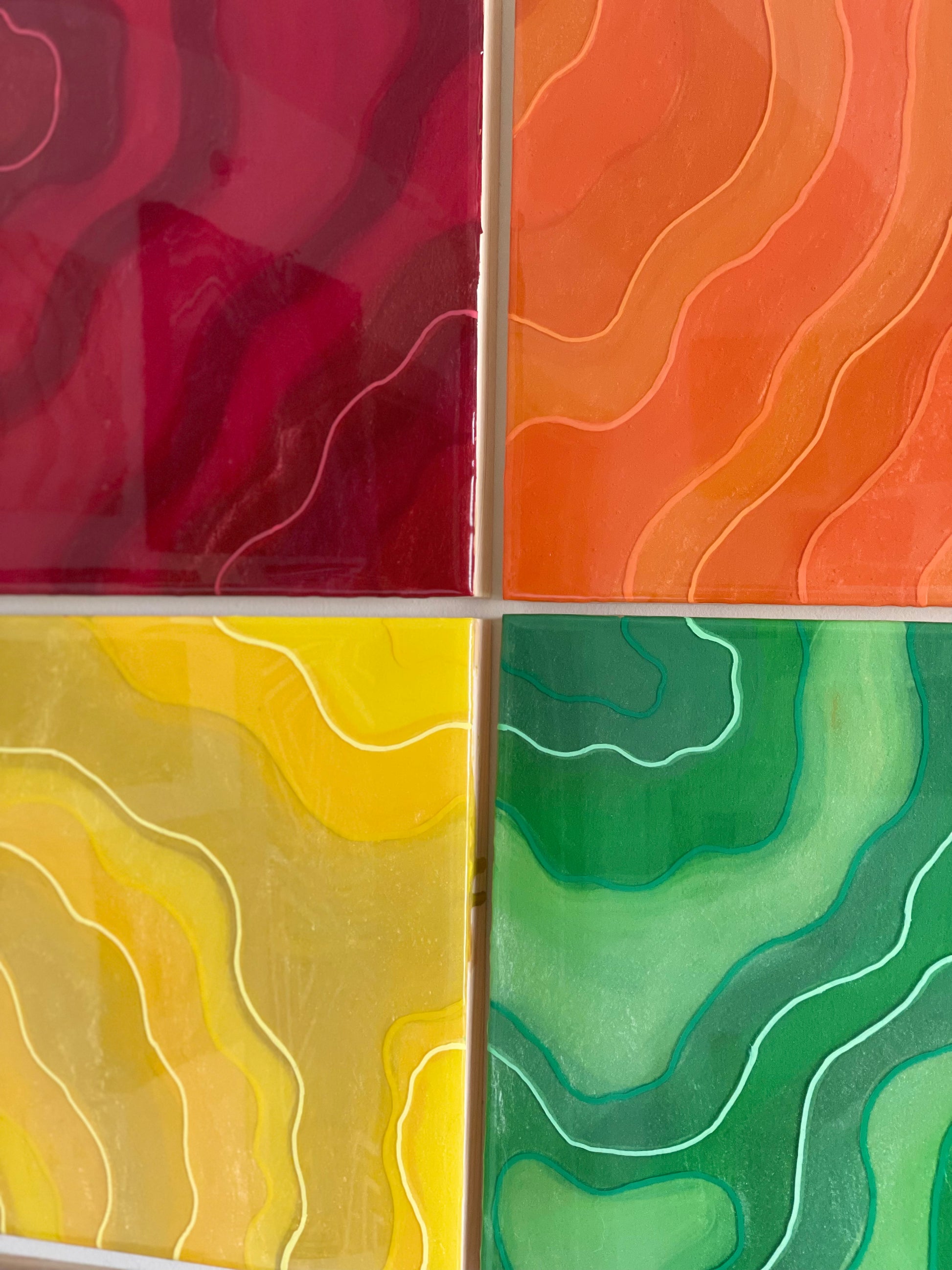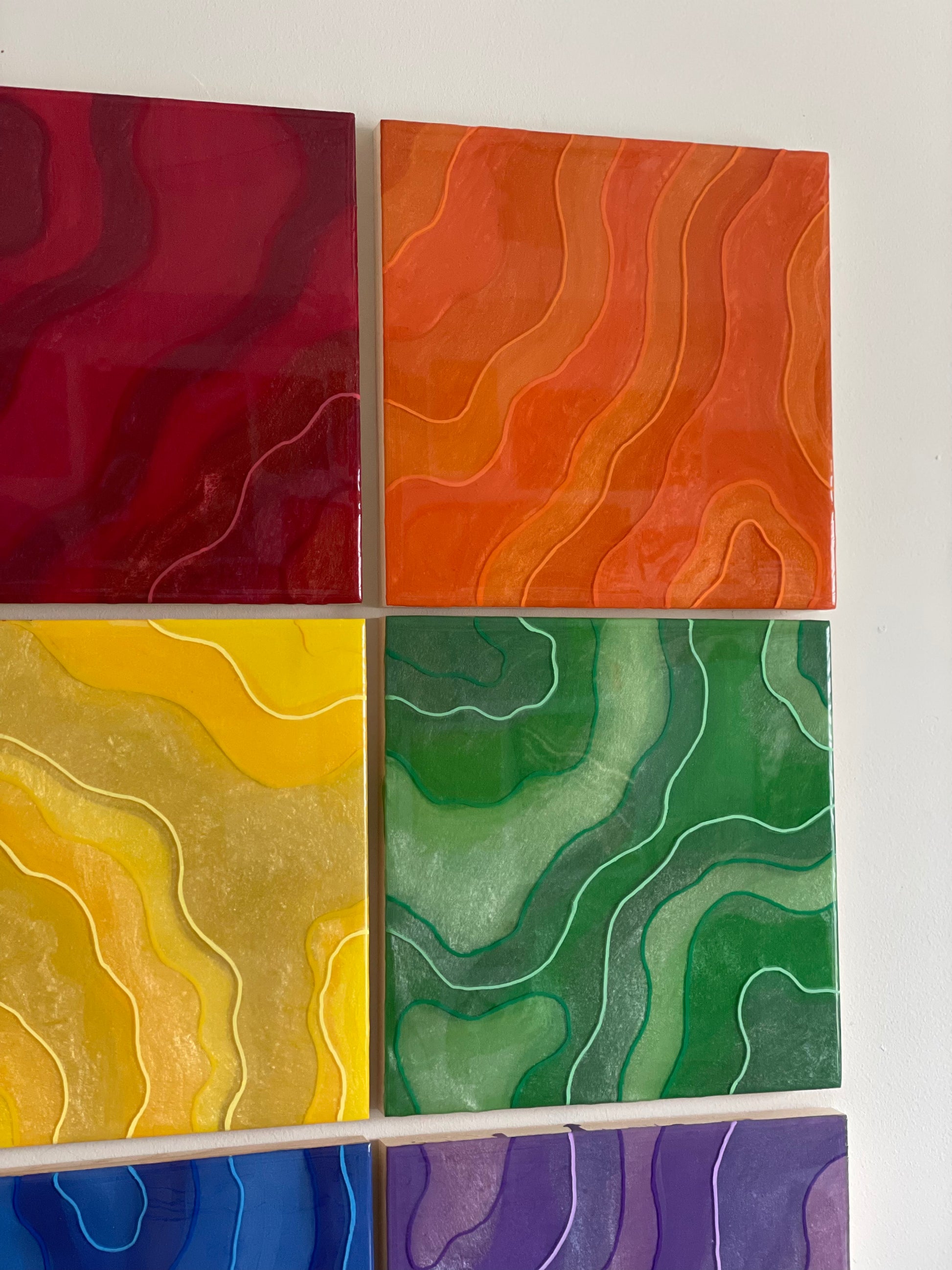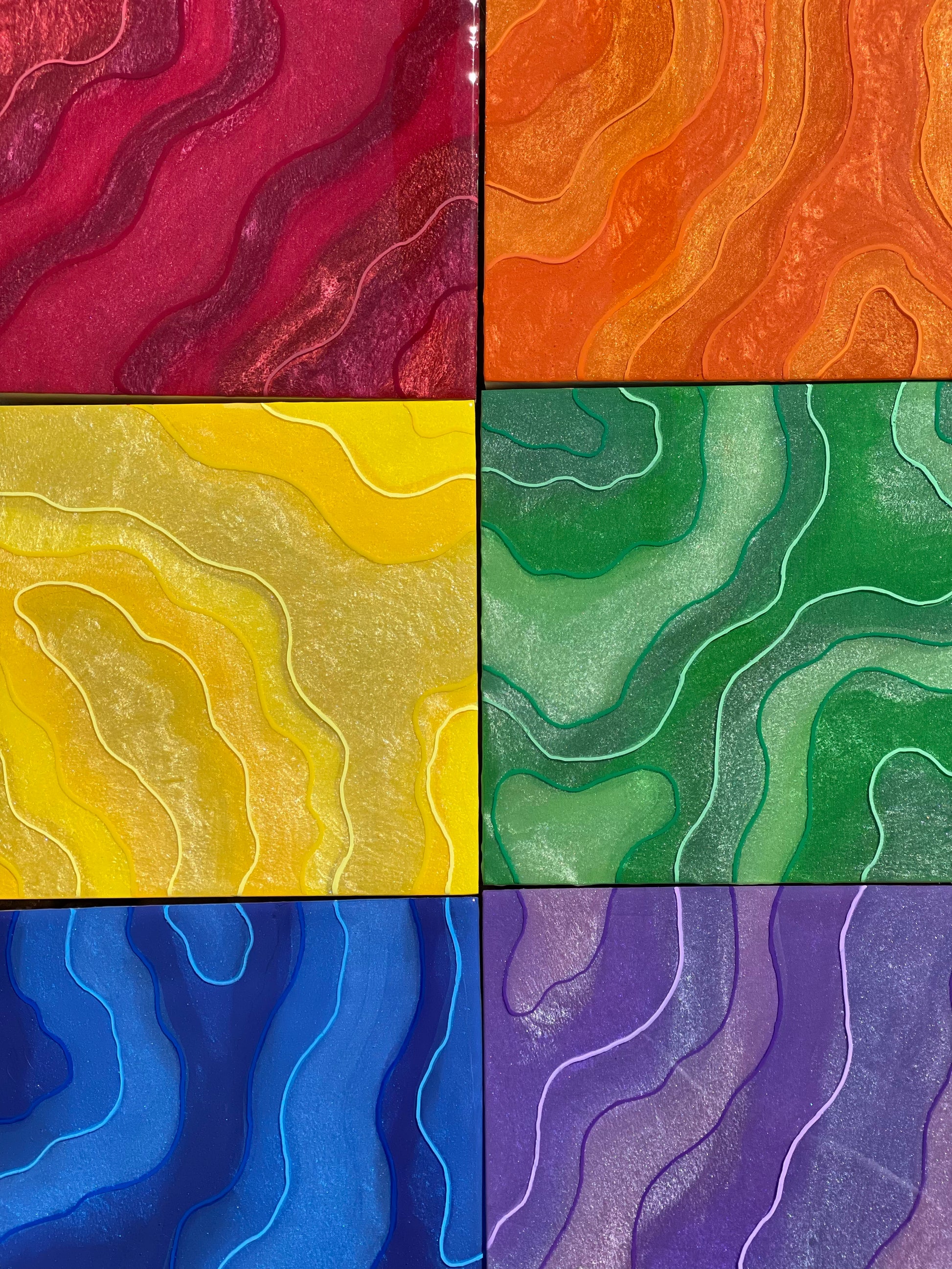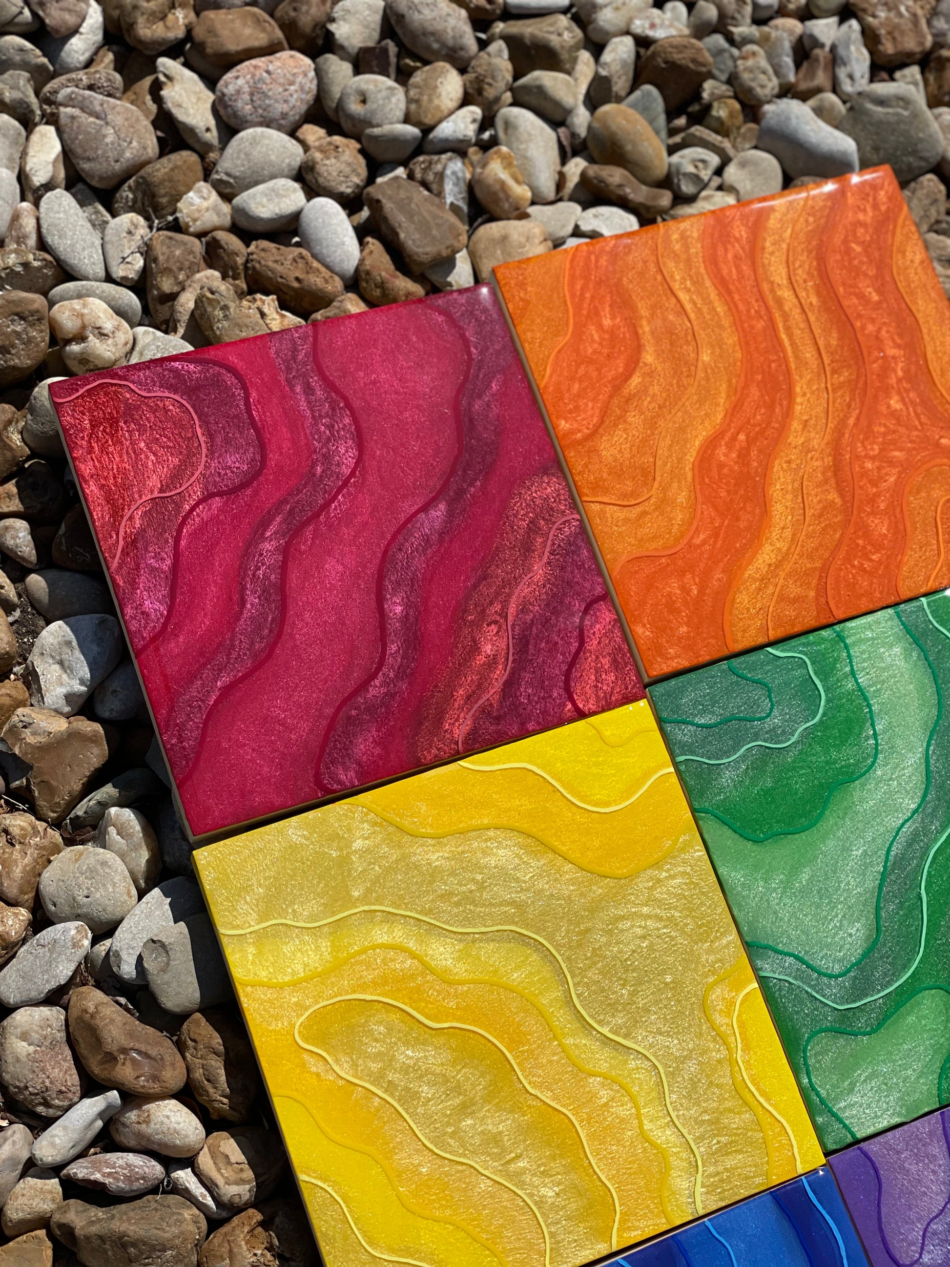 This artwork is made of 6 10x10 inch canvases; each canvas is one color of the rainbow, however the design of the geode matches up to each canvas so they truly go together & flow. (Hanging up these canvases together will be the length of 30x20 inch)