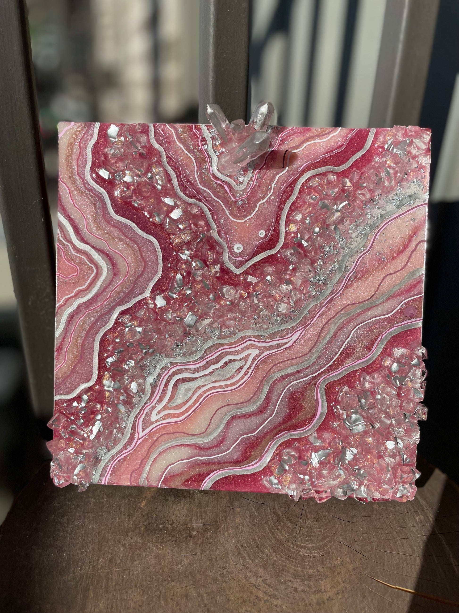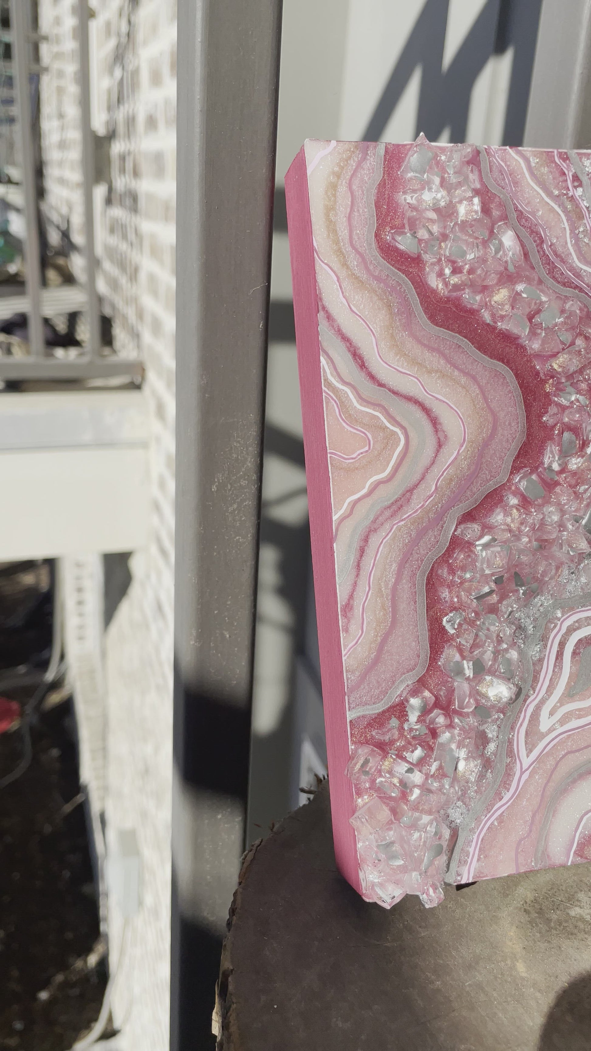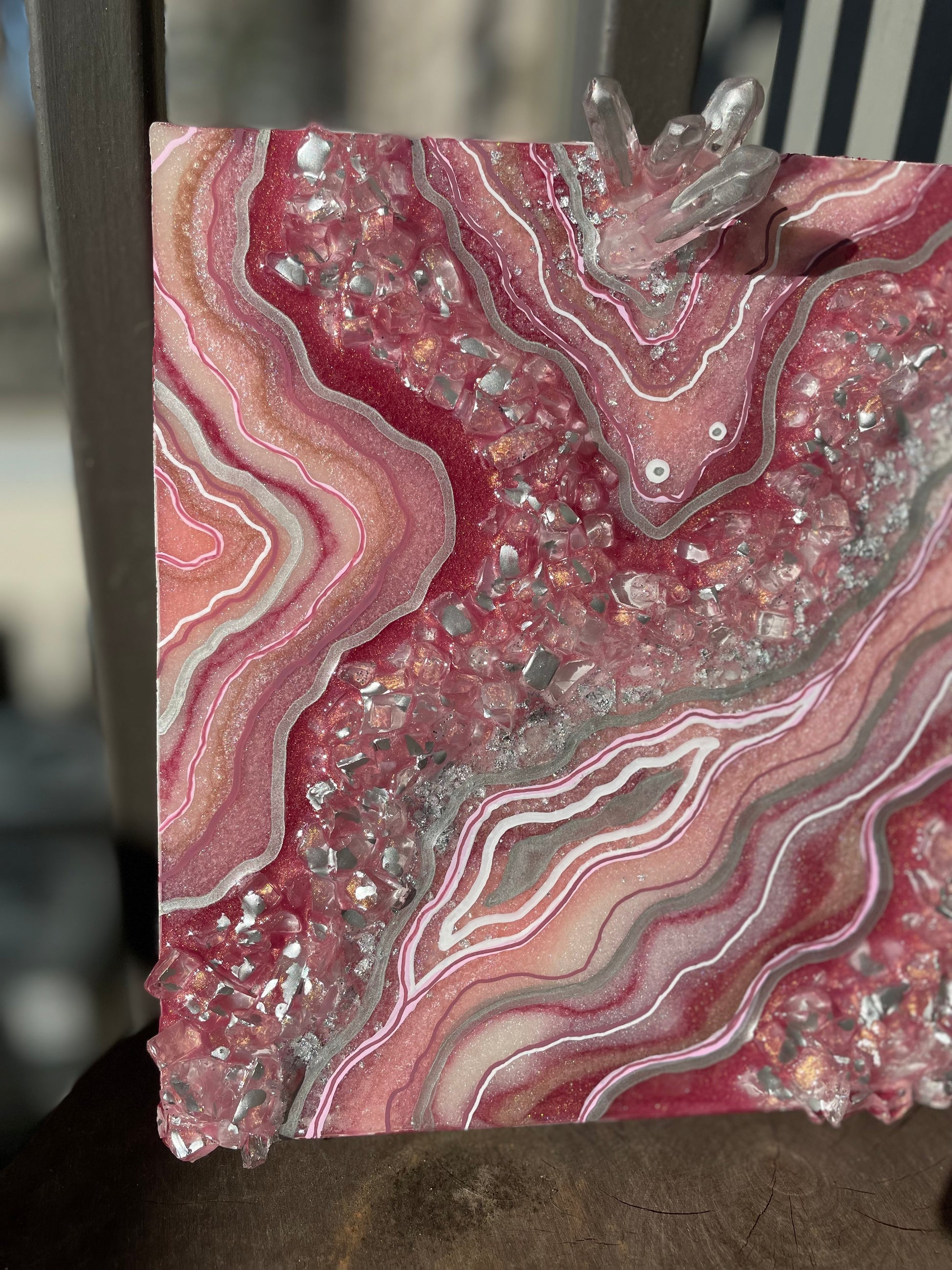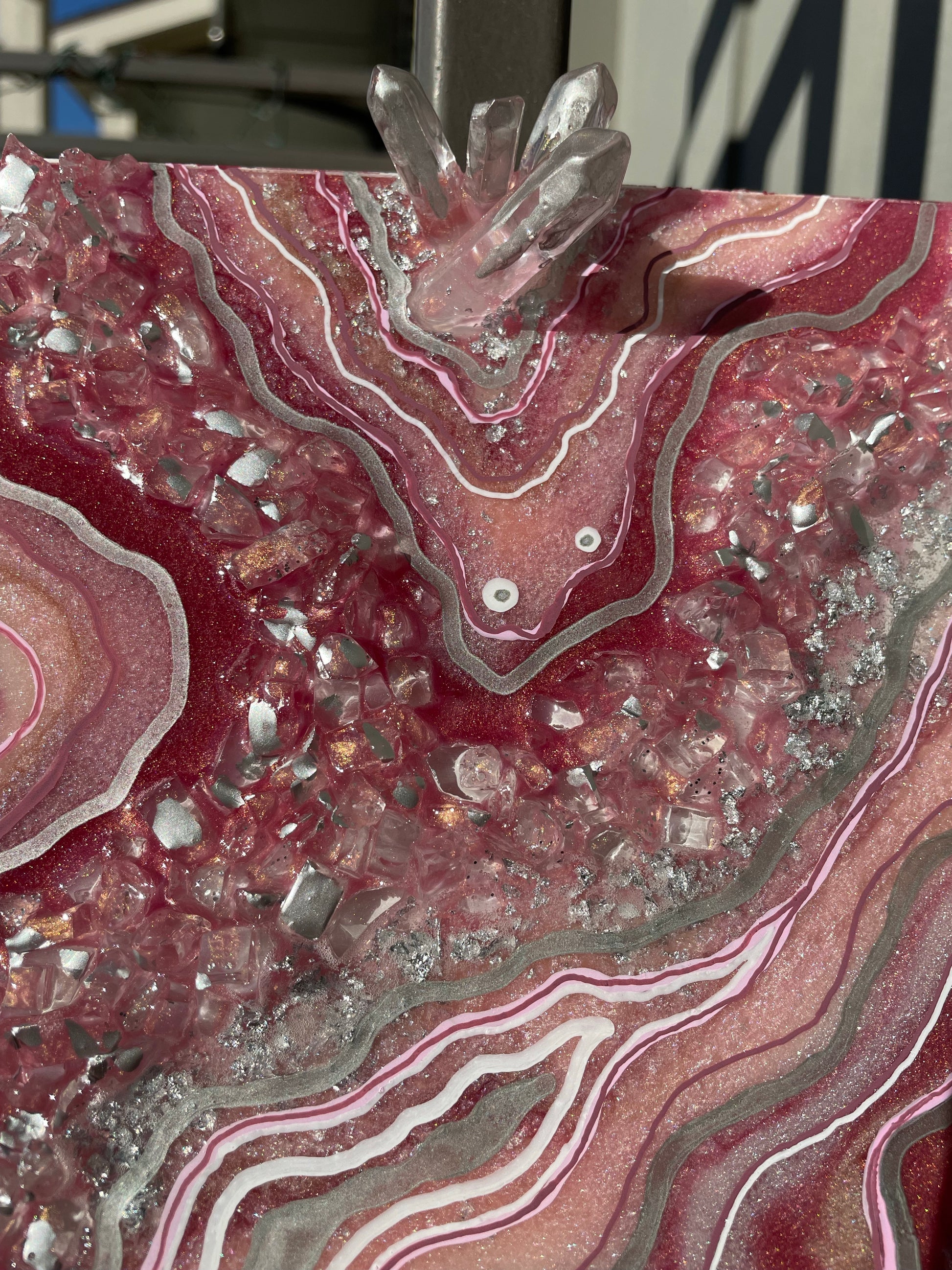 Made with shades of pink & white with an accent of silver. Within this geode there is also genuine Quartz crystal points.