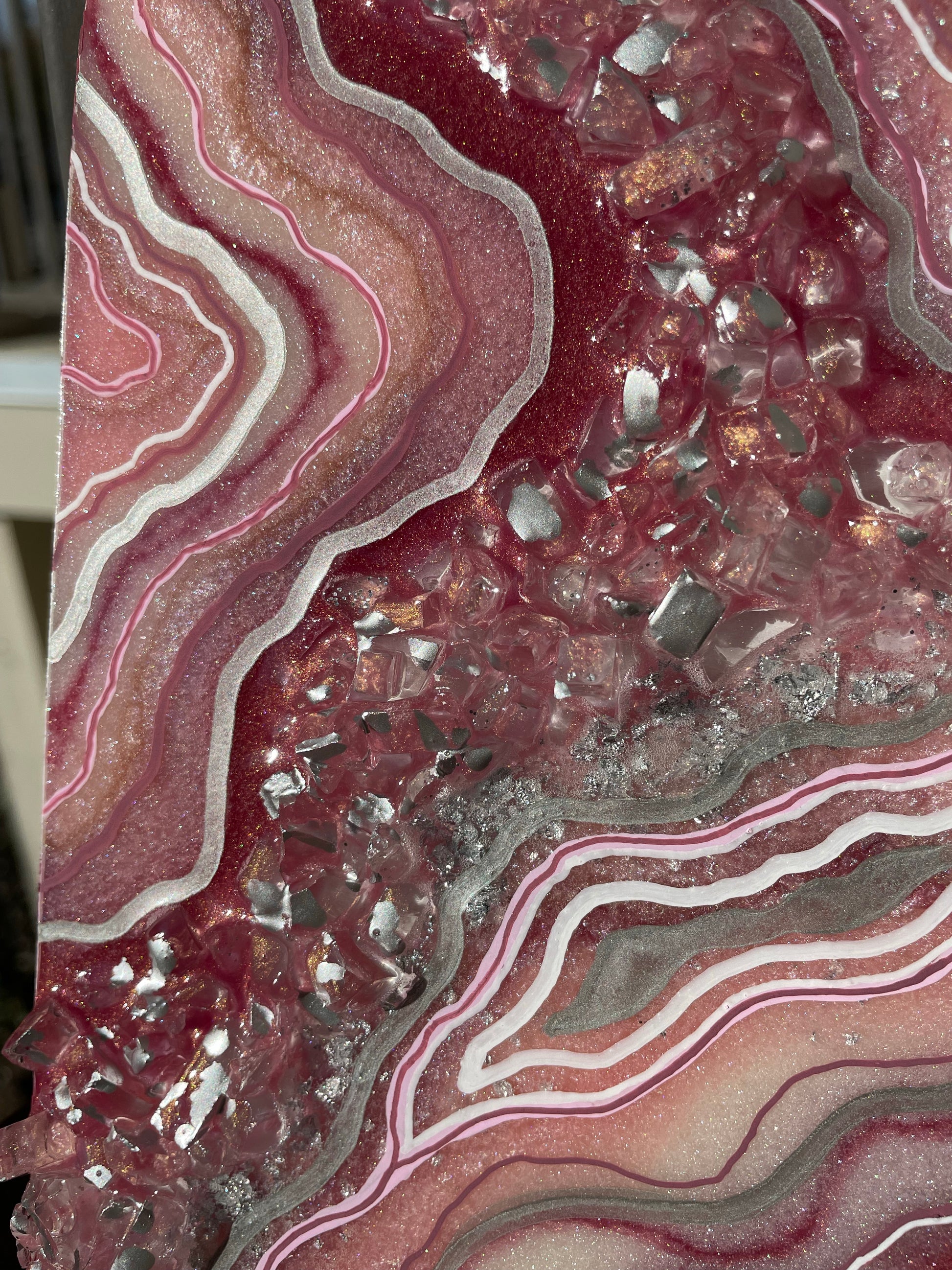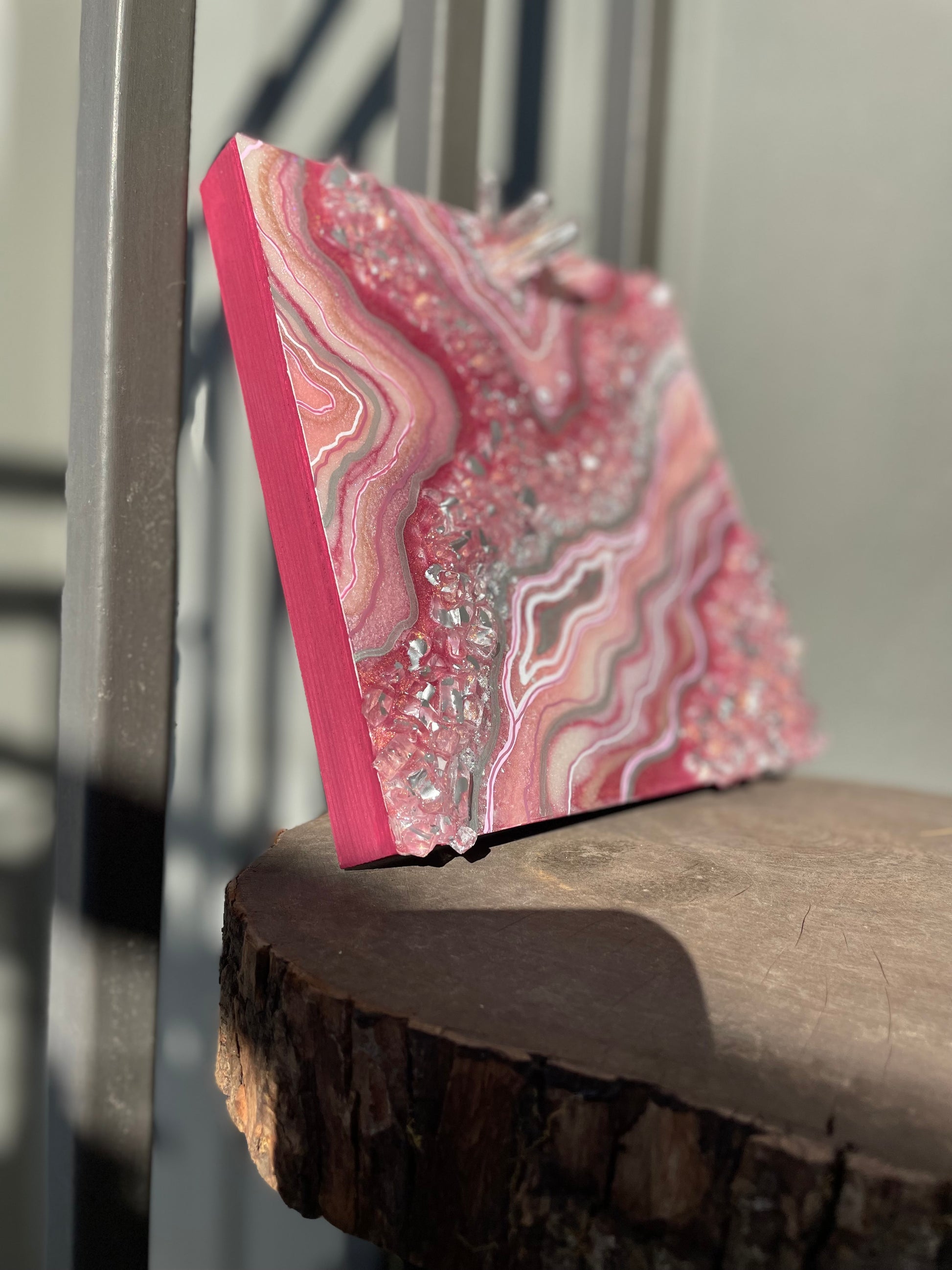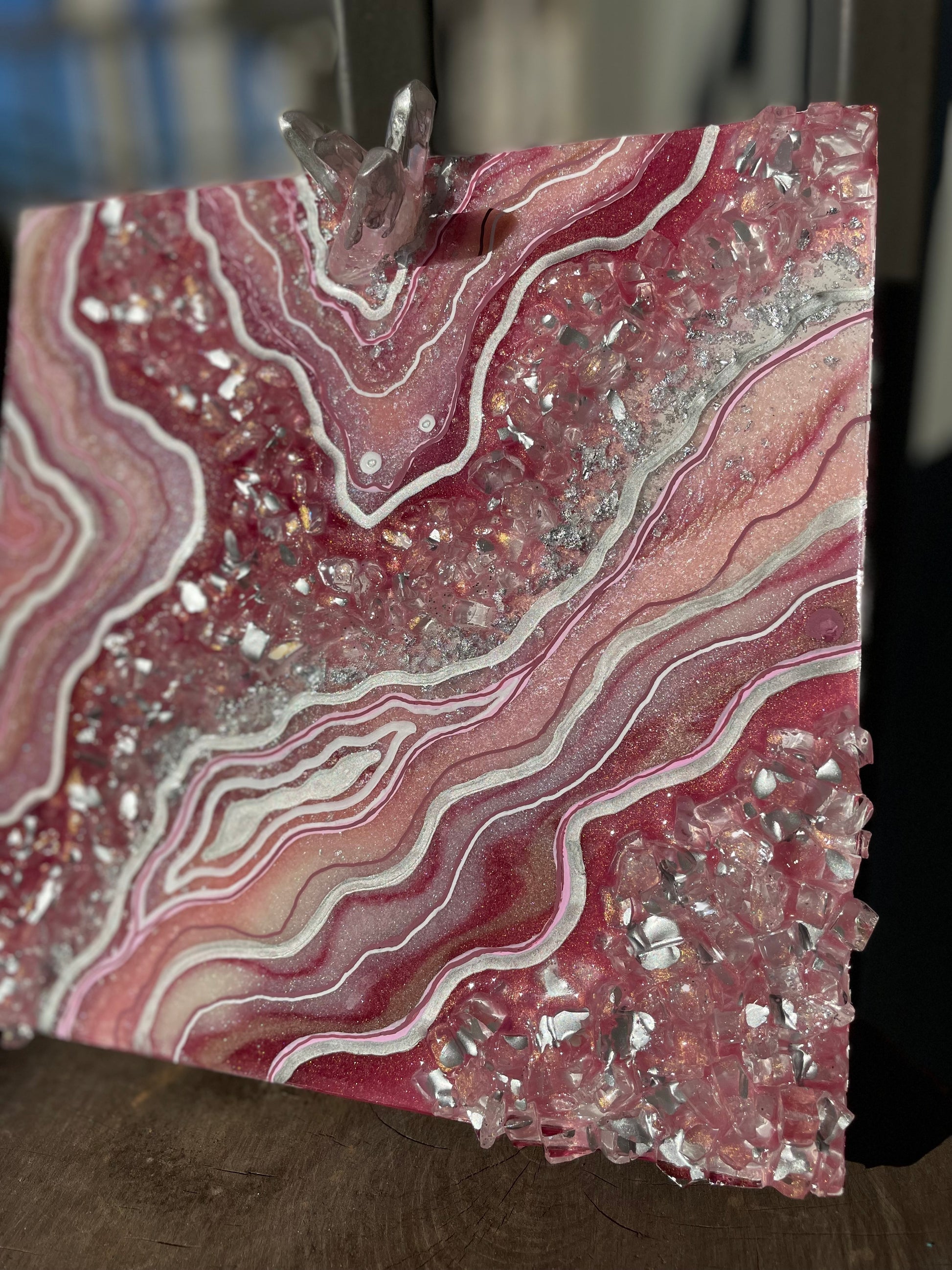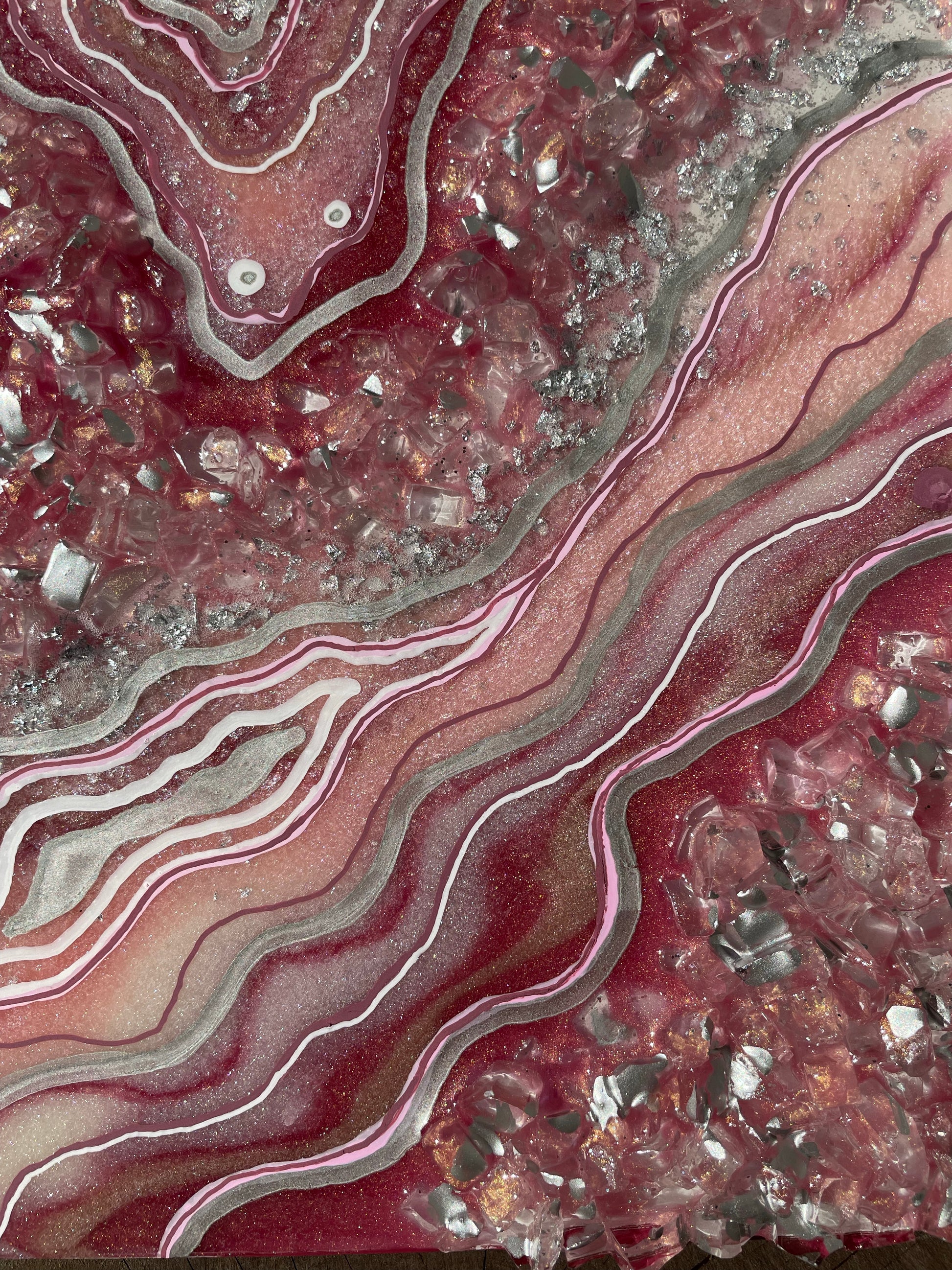 Made with shades of pink & white with an accent of silver. Within this geode there is also genuine Quartz crystal points.