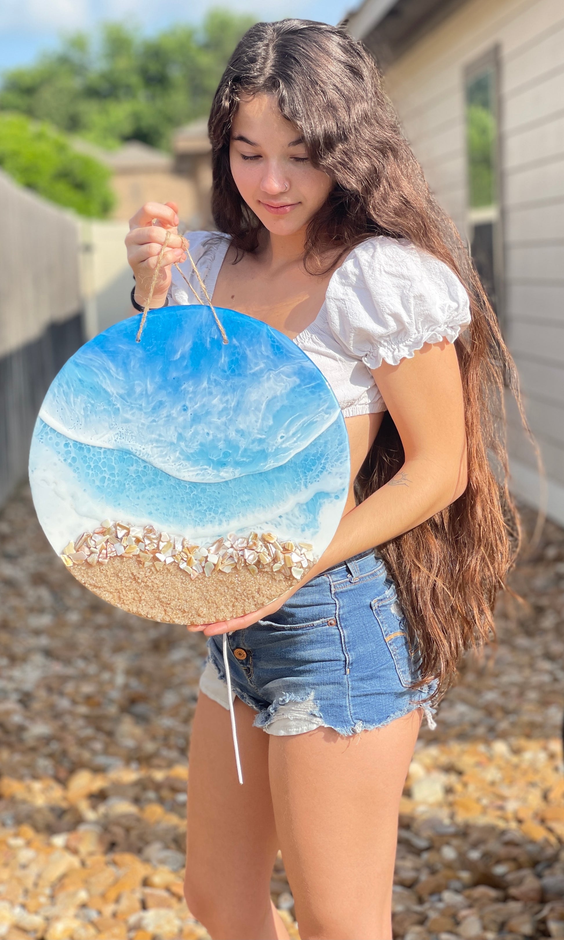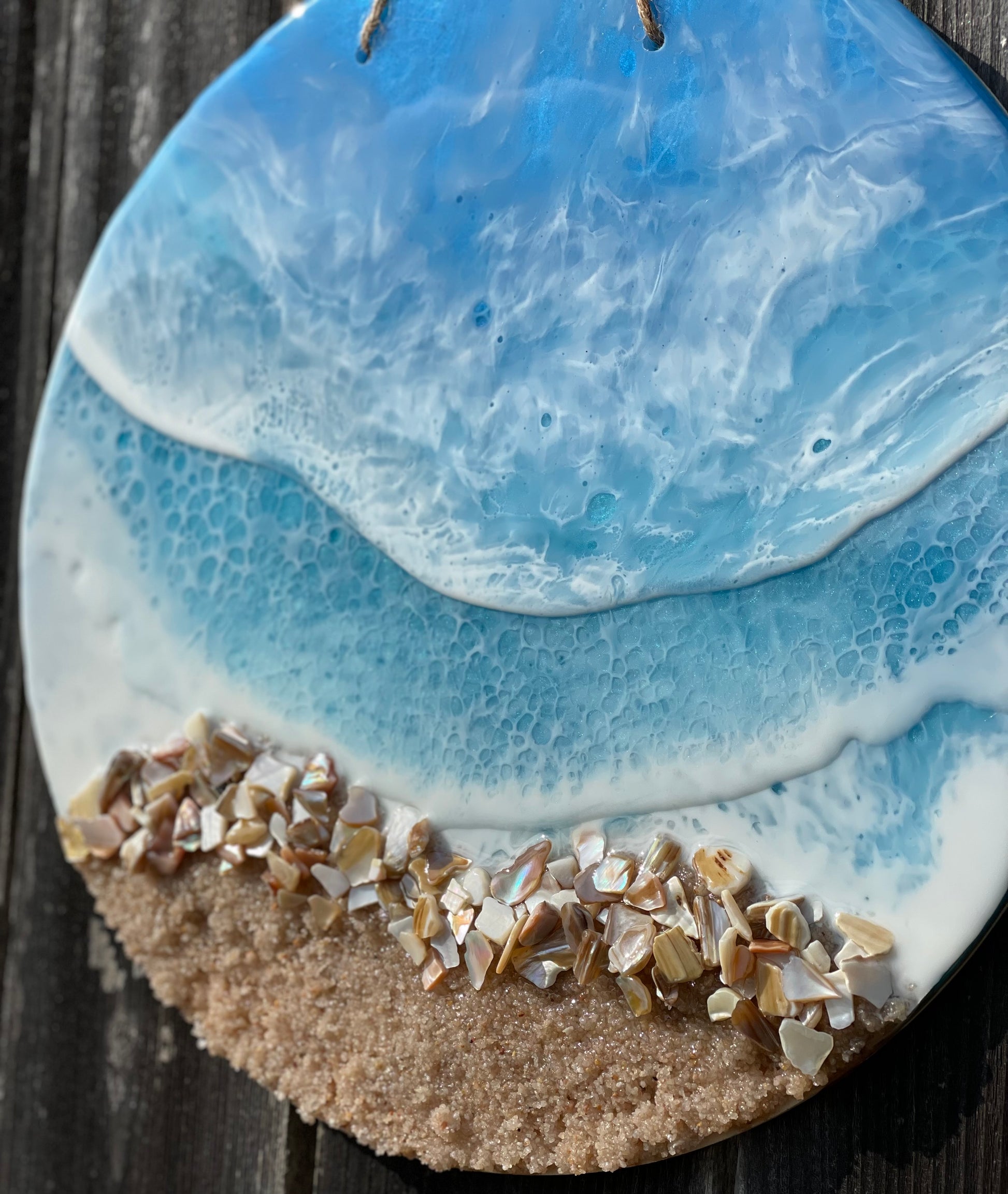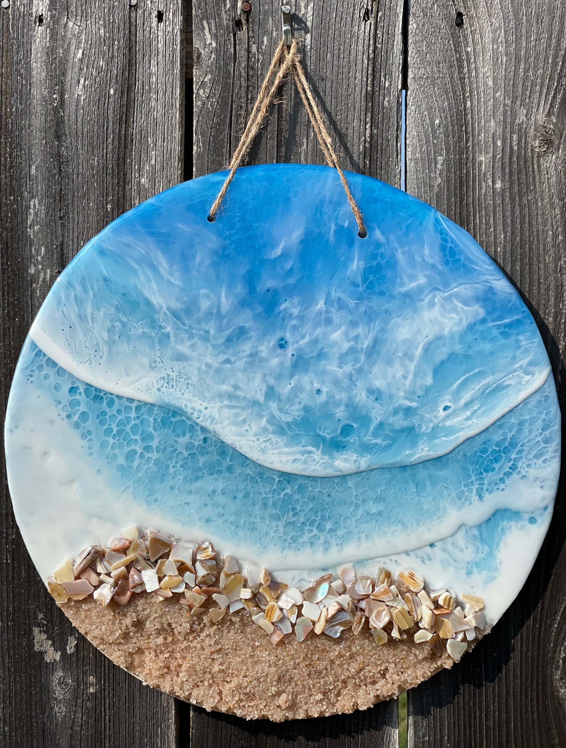 14” resin ocean art; made with 4 layers of resin, shells & sand.