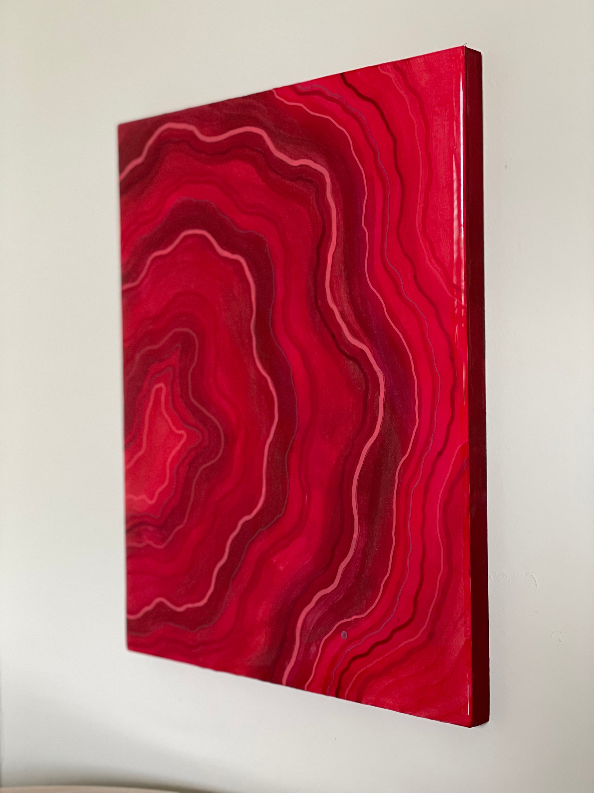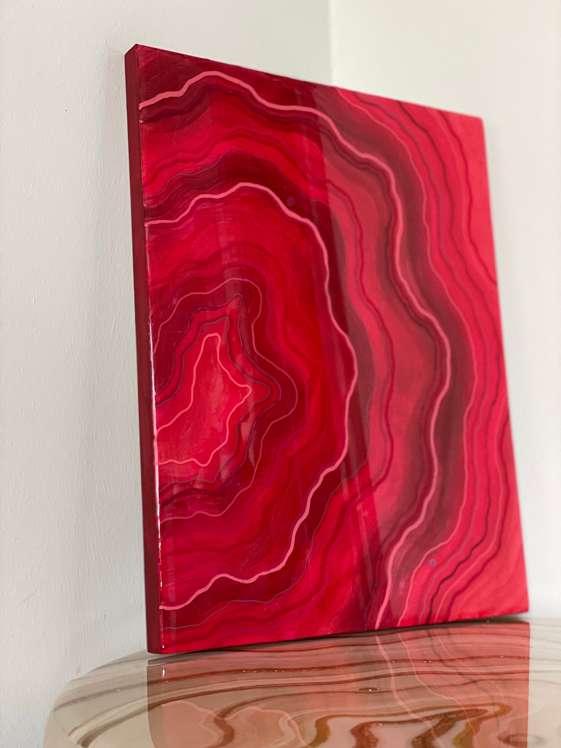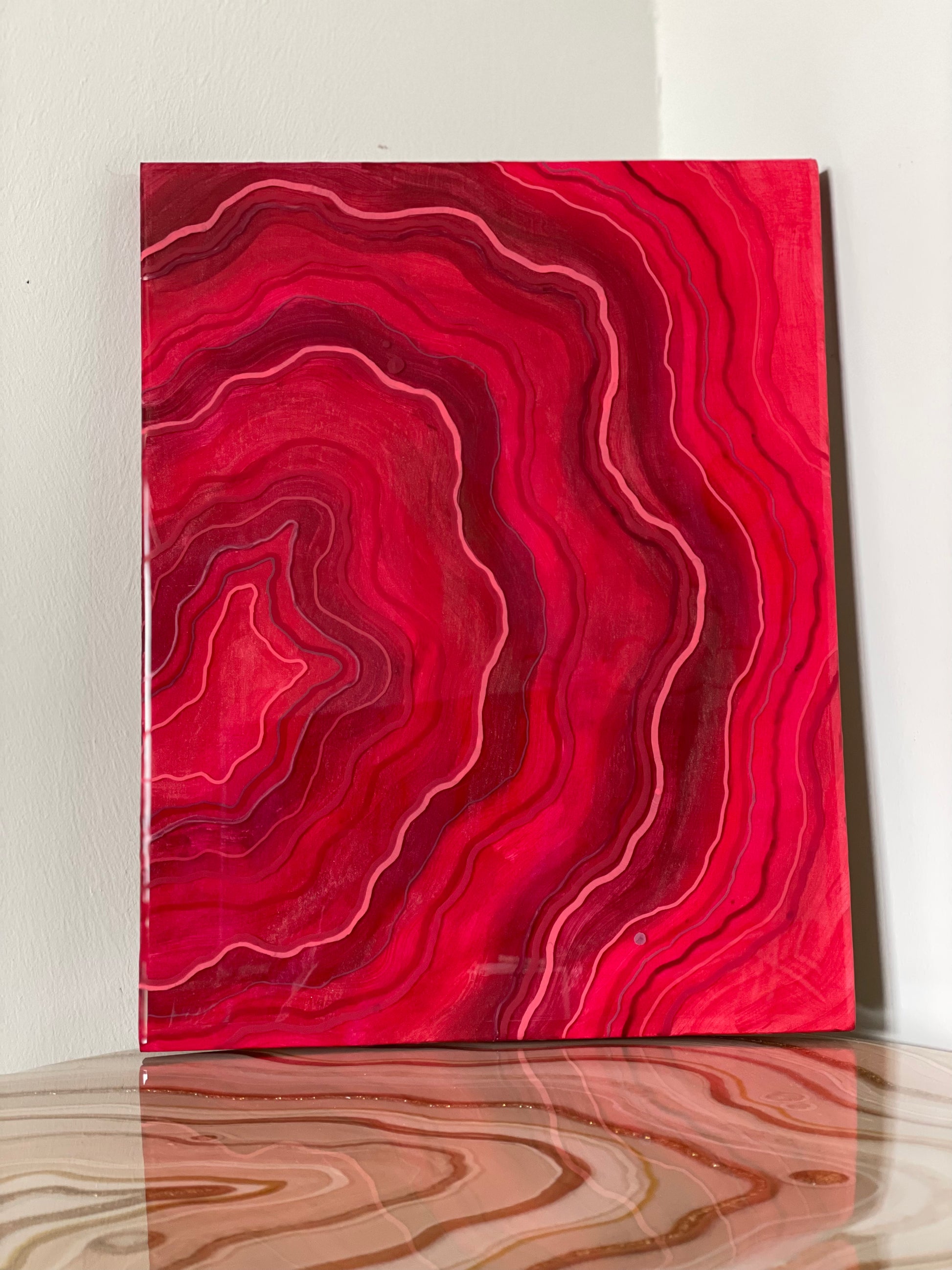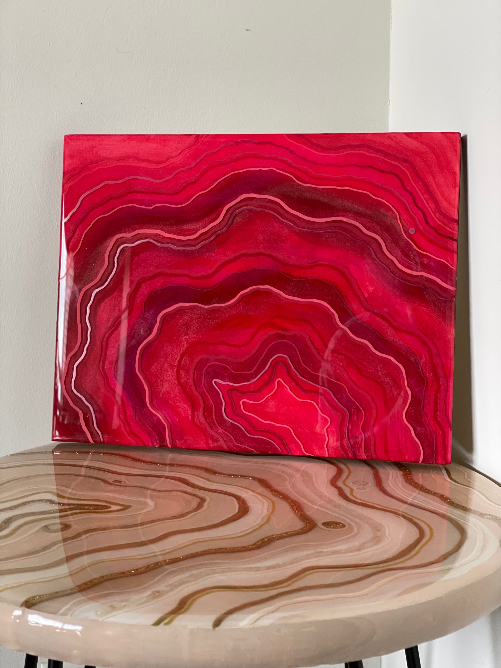 11x14 mixed media on a wood canvas with 1/2 inch red painted sides. In this piece you’ll see a painted geode background underneath a layer of resin with shiny enhancements and fine line details.