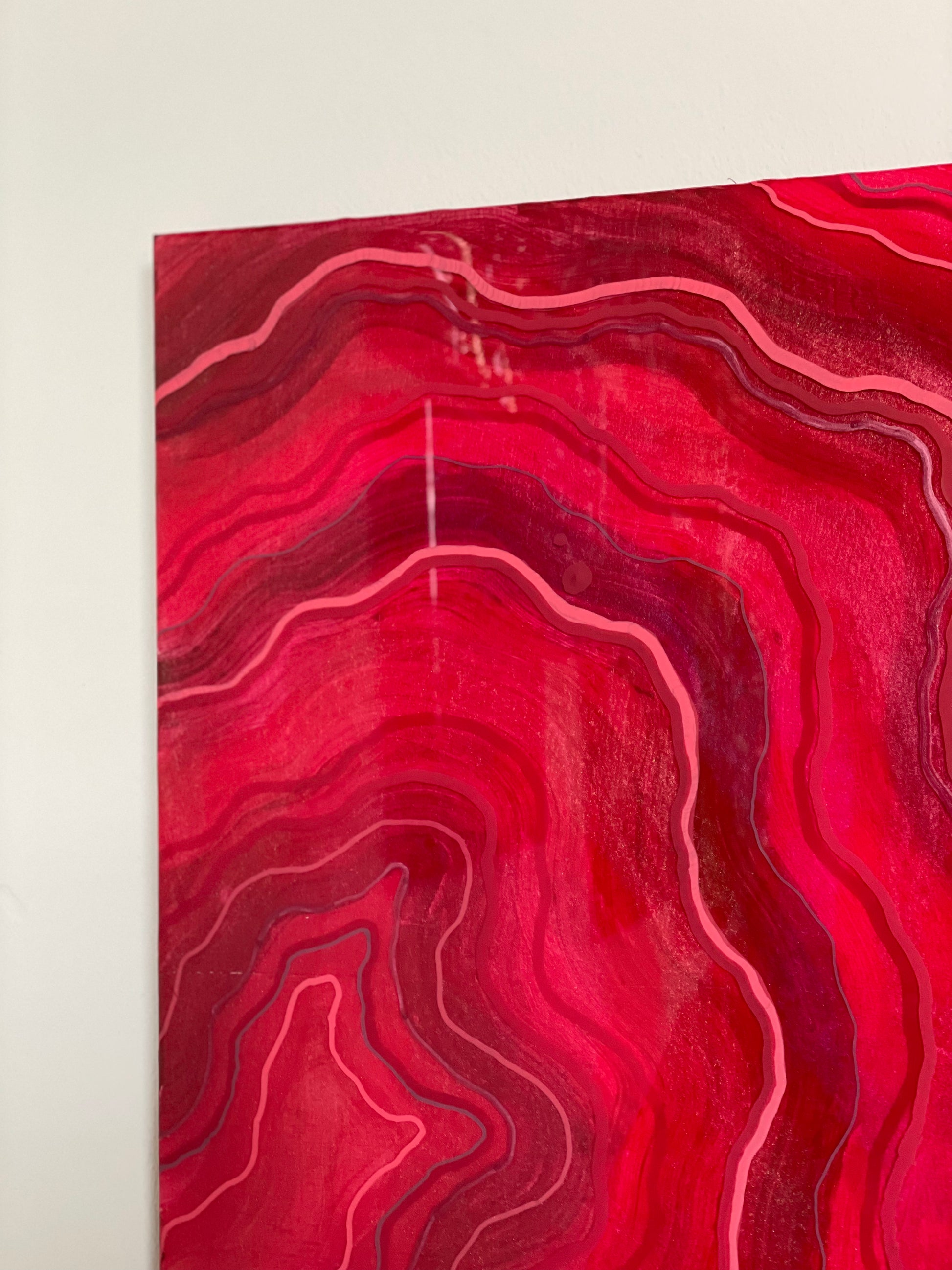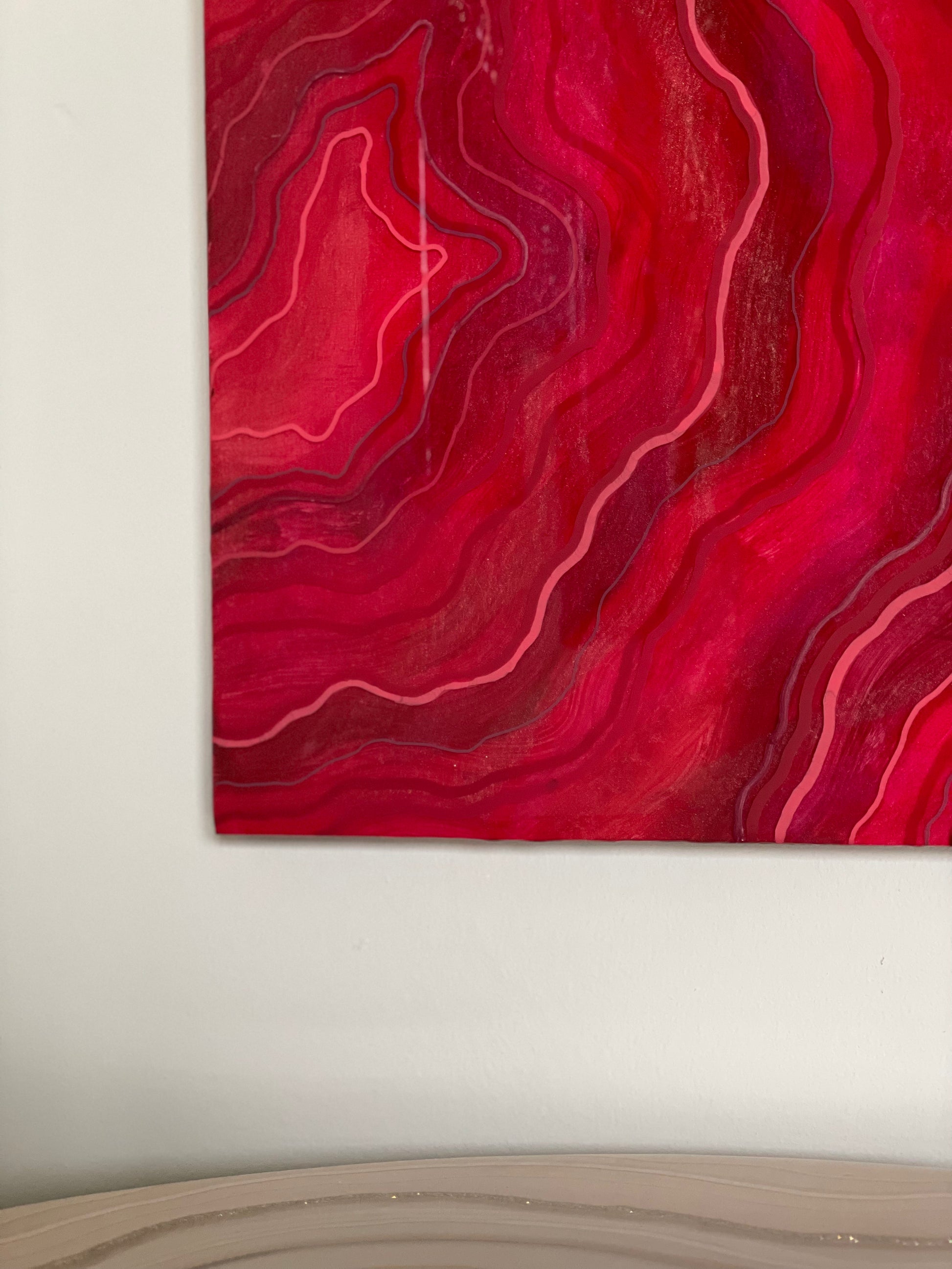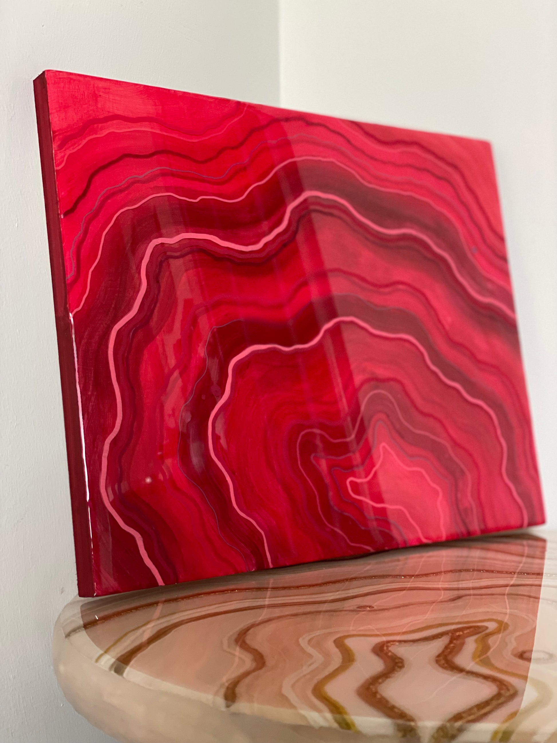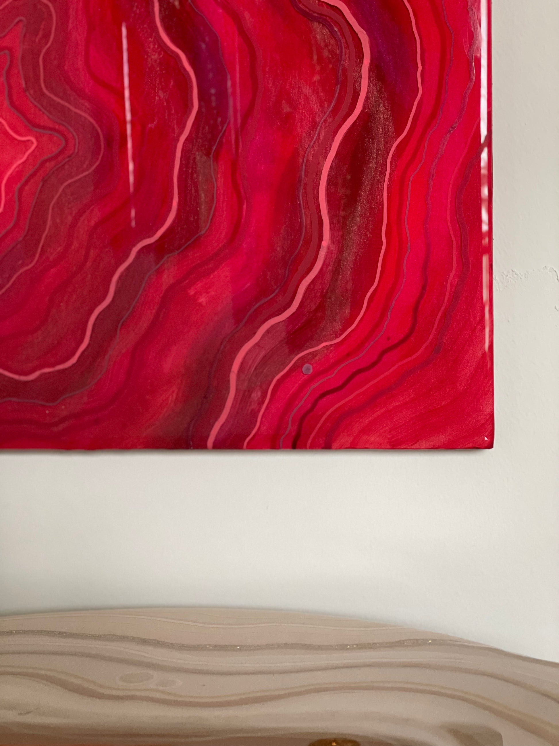11x14 mixed media on a wood canvas with 1/2 inch red painted sides. In this piece you’ll see a painted geode background underneath a layer of resin with shiny enhancements and fine line details.