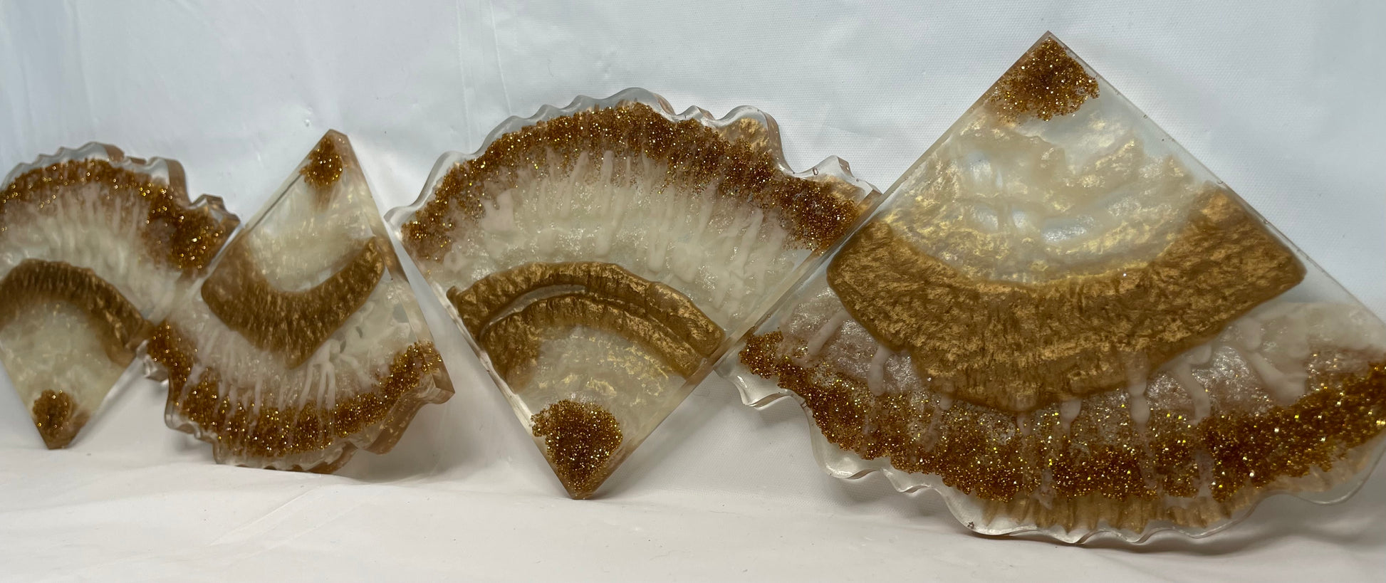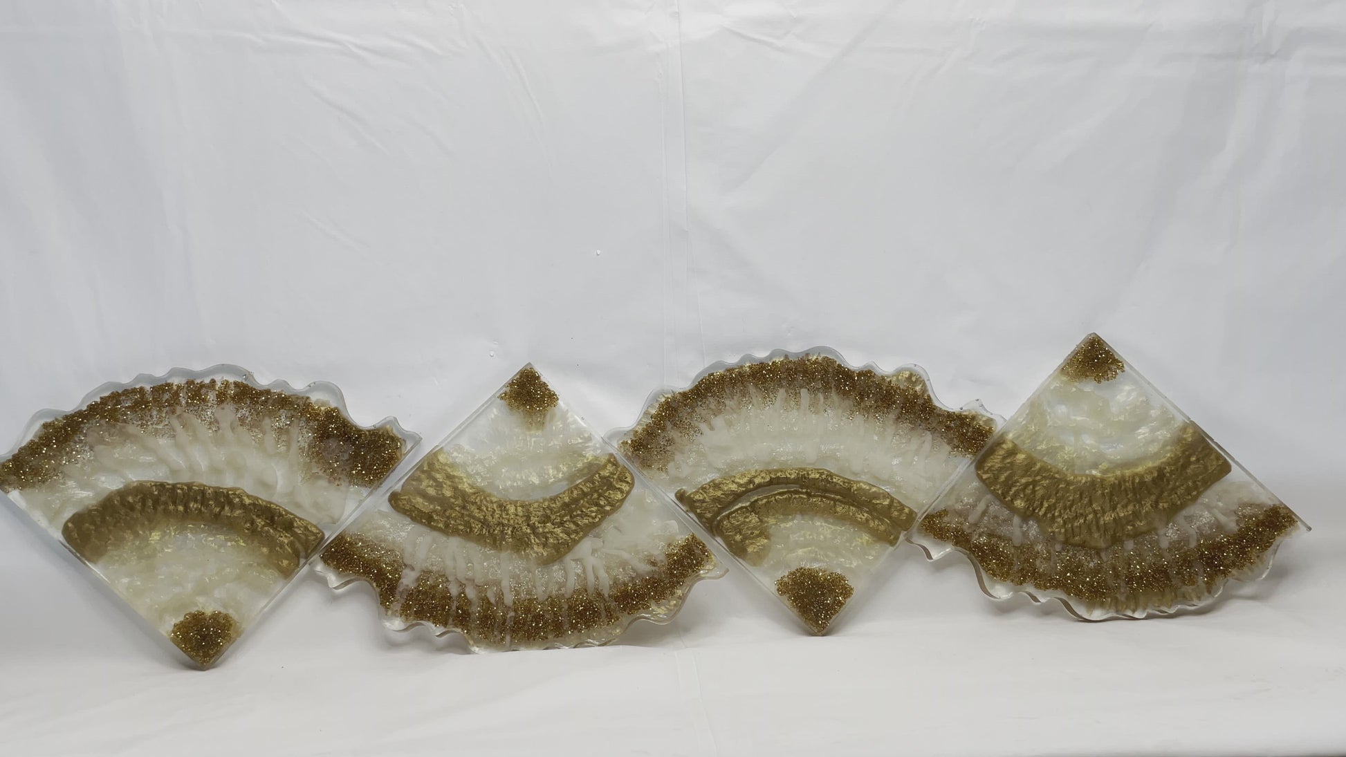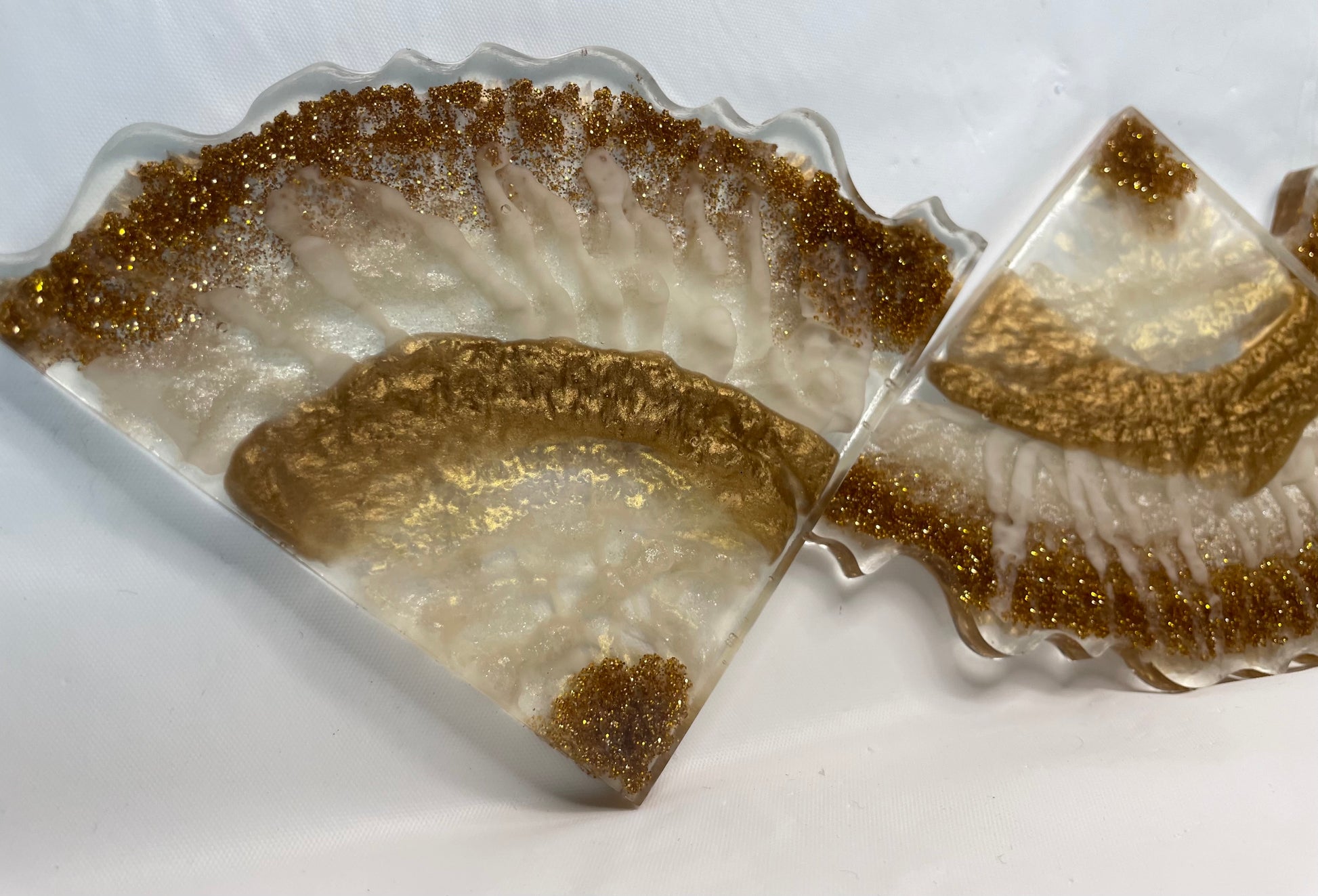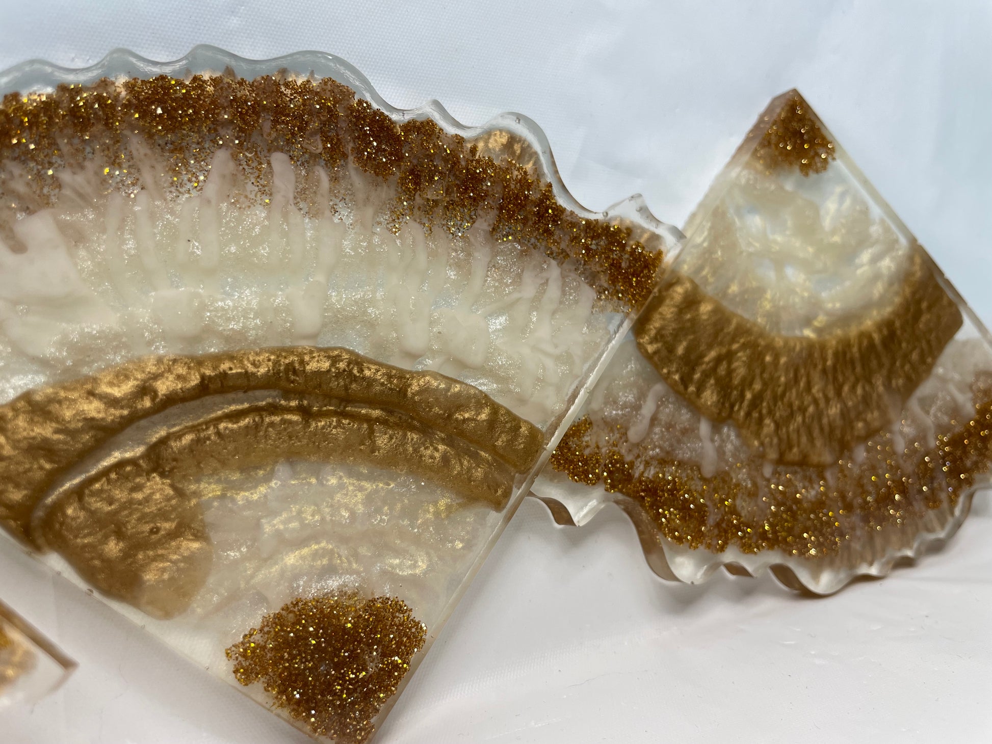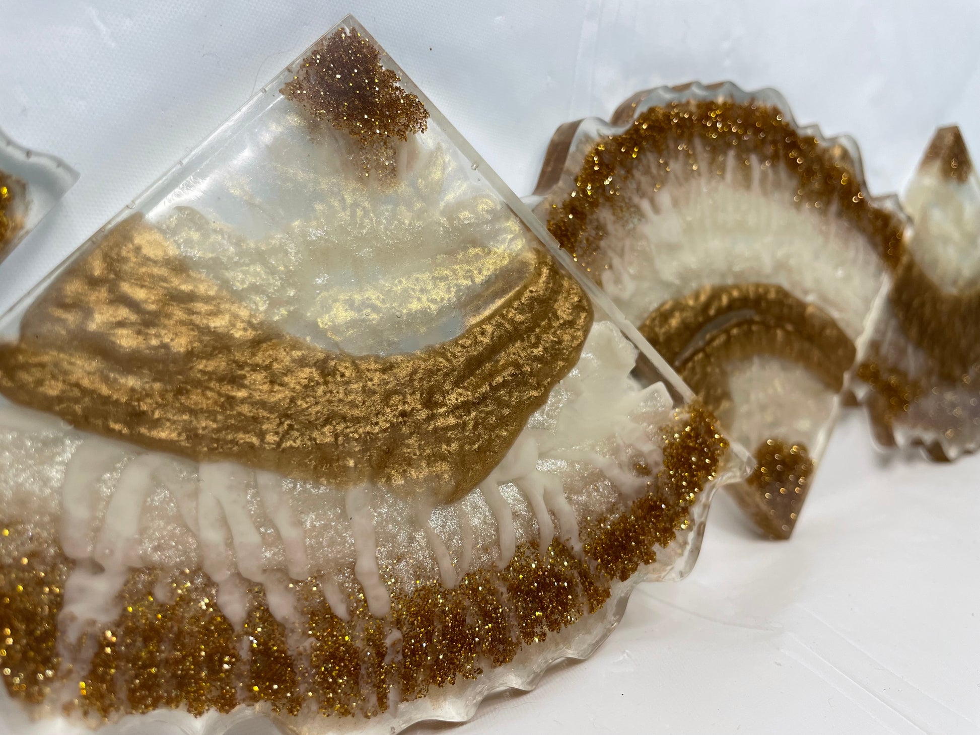 This is a 4 piece agate coaster set; made with the colors of gold, varying shades of white, gold glitter & interference gold.