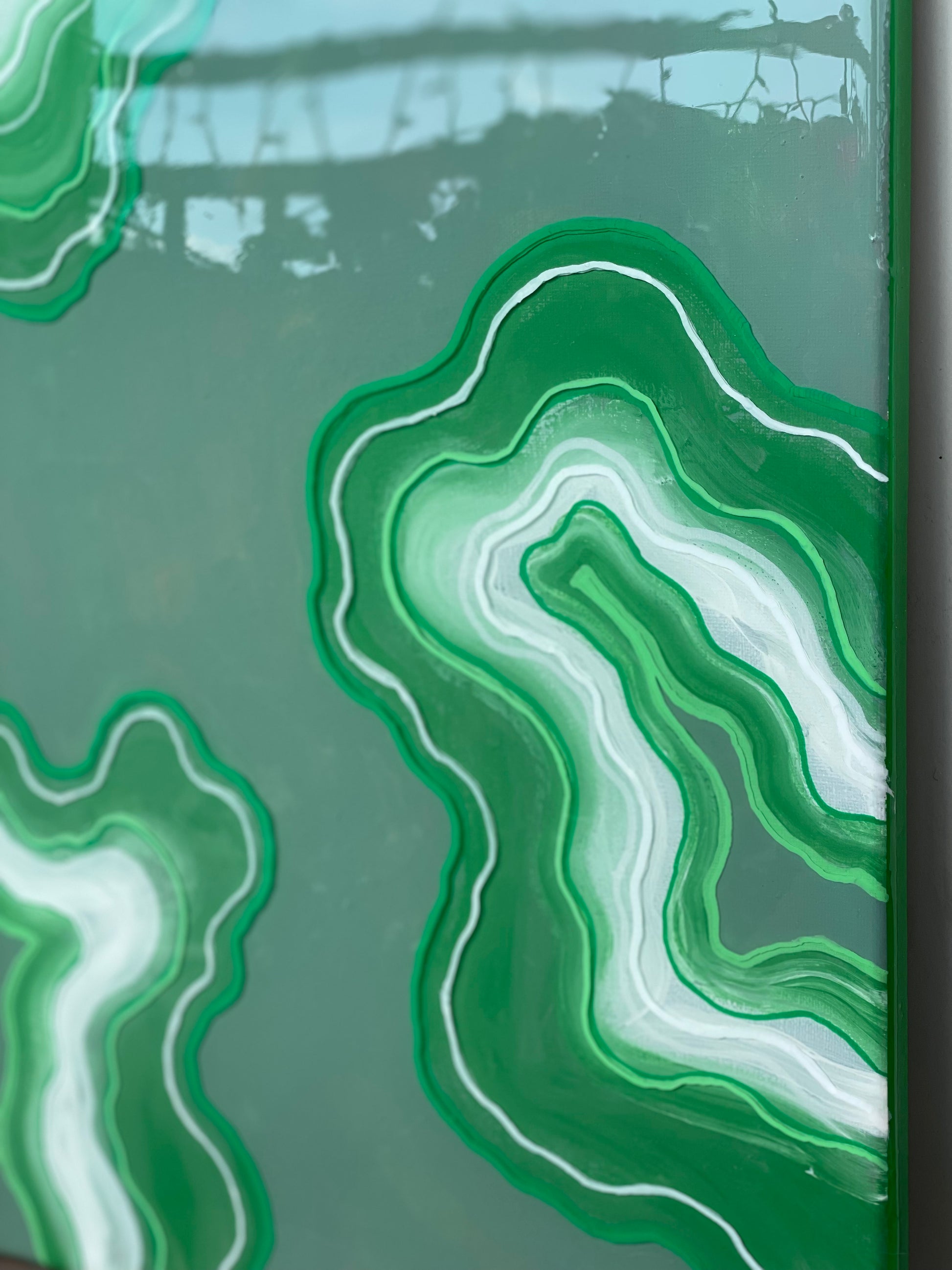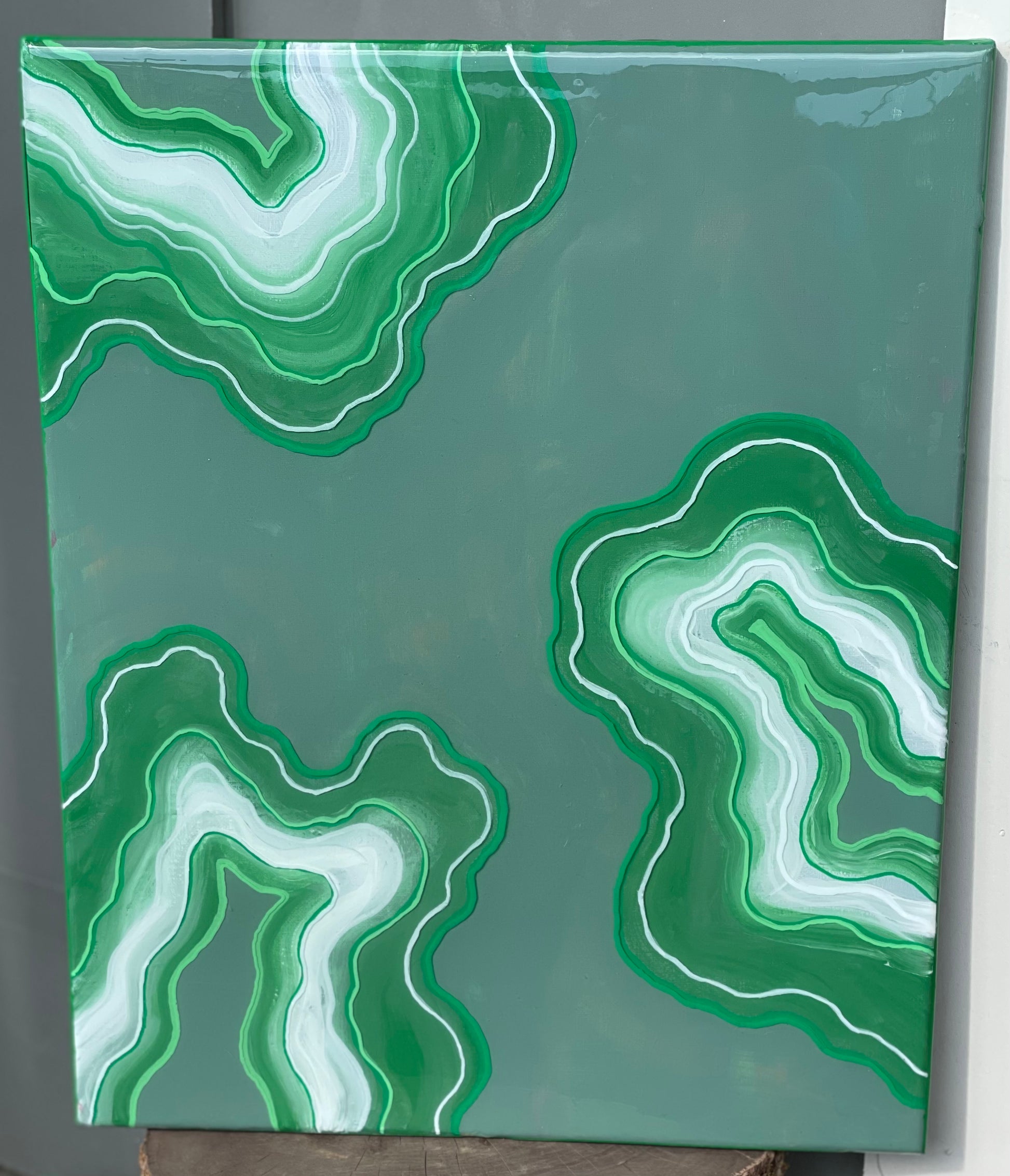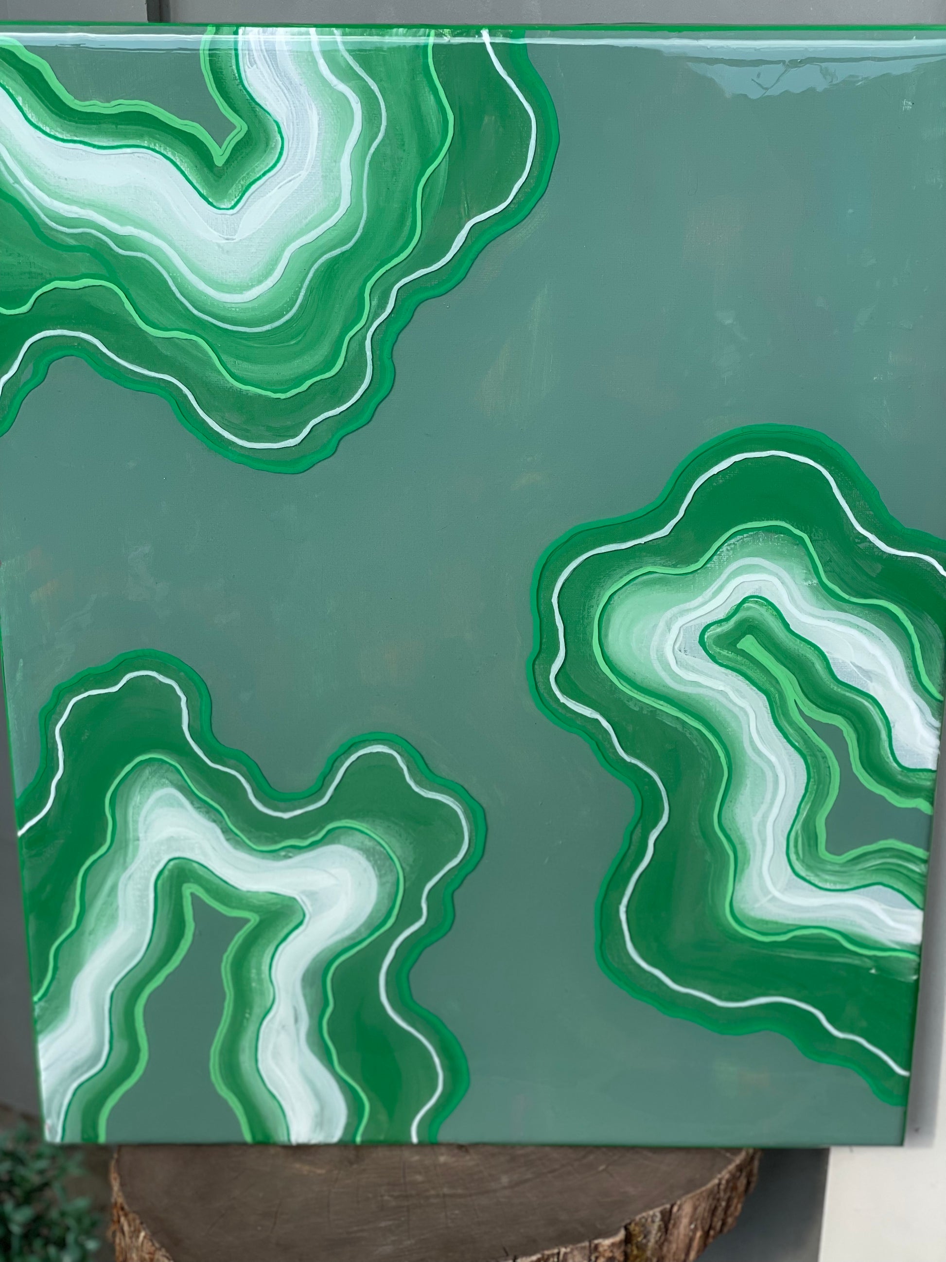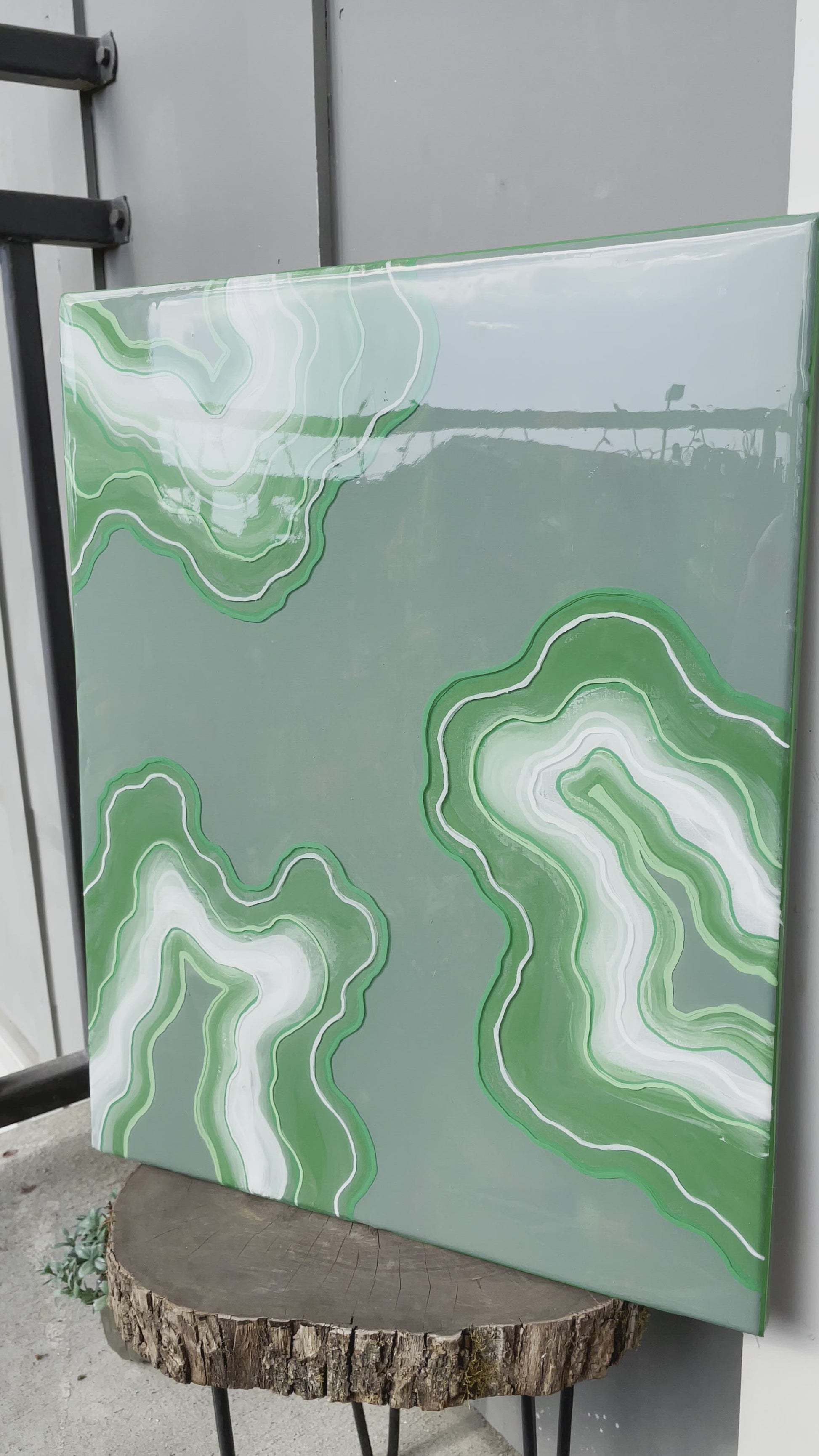 16x20 cavas resin wall art; a painted geode recreation, made in shades of greens and hints of white with added details lines in multiple layers of resin to add depth.