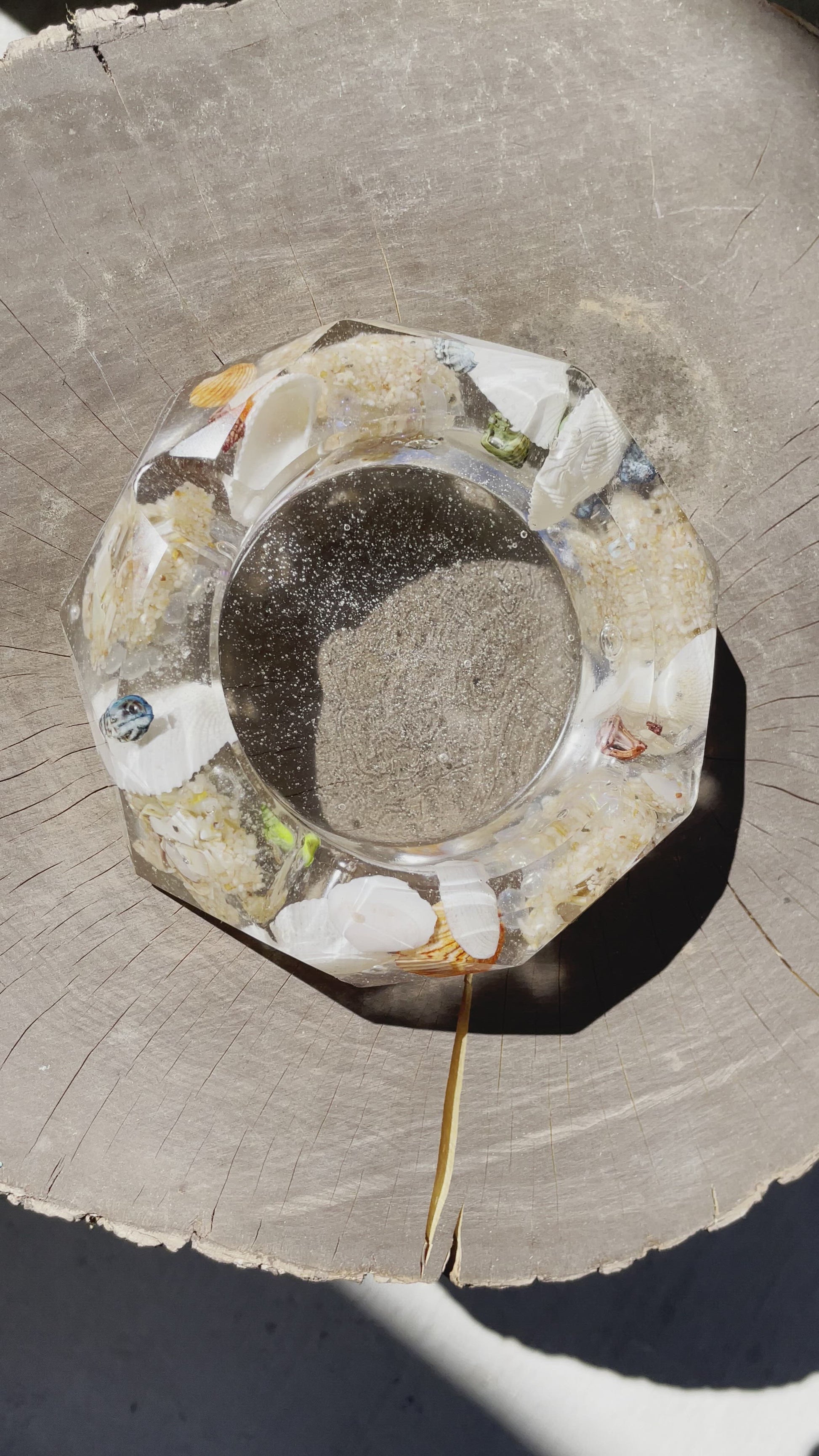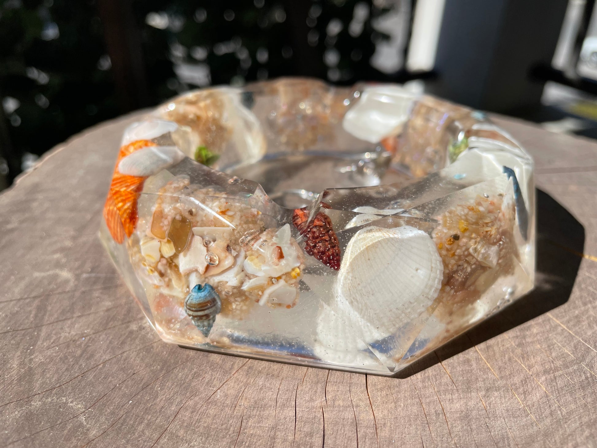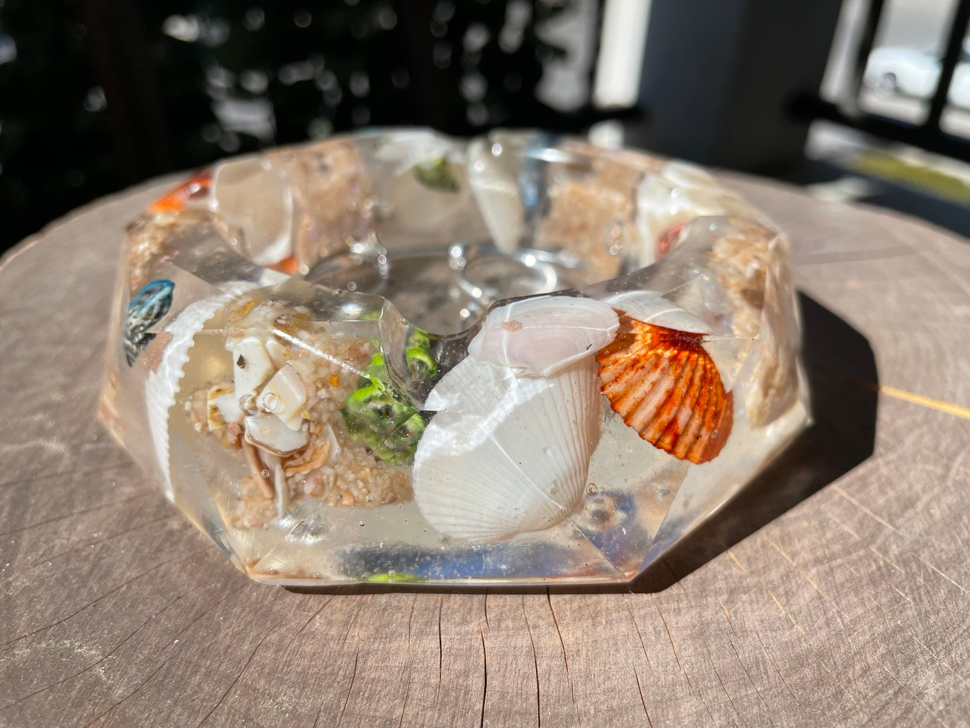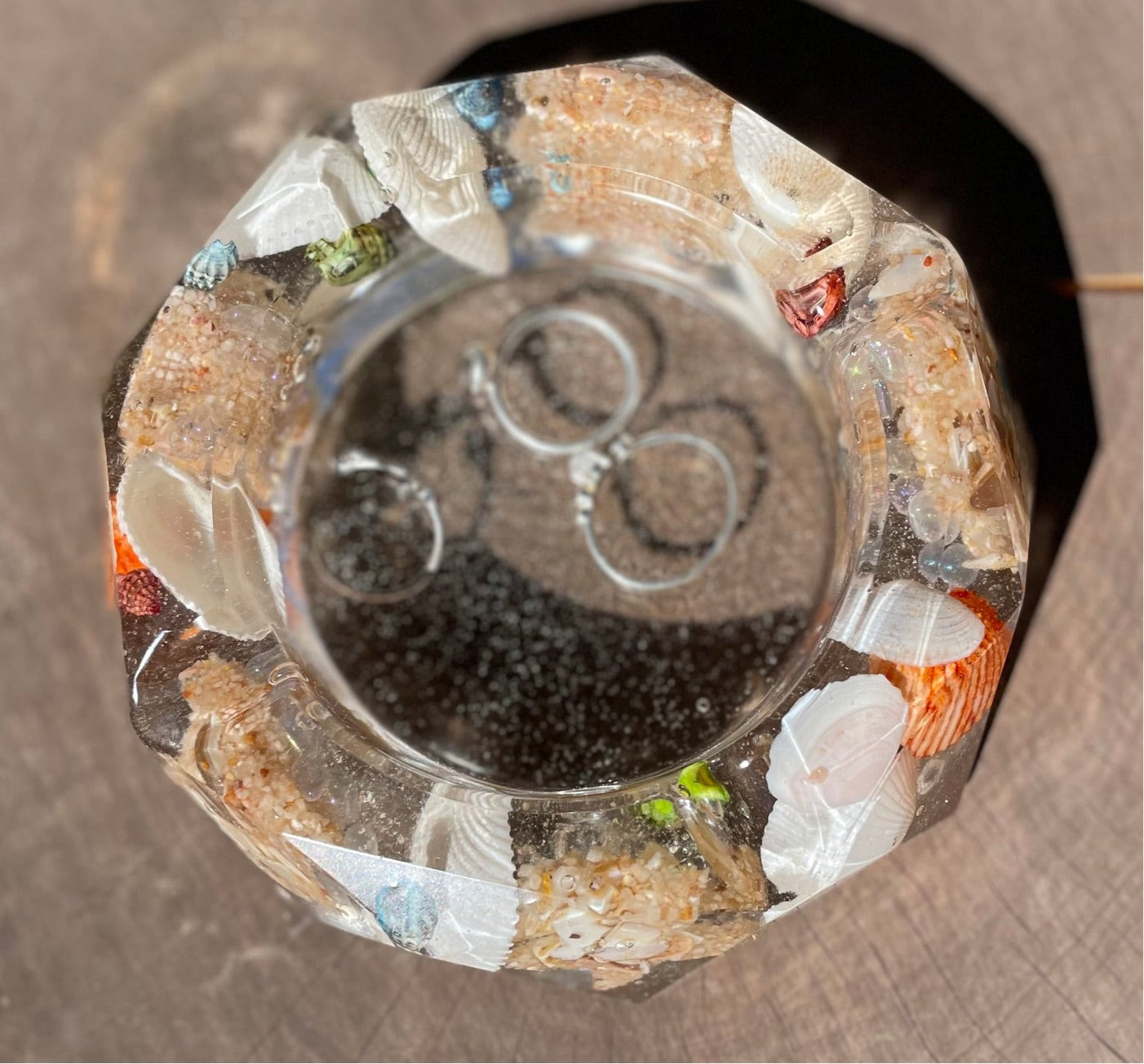 This trinket dish is filled with everything you love at the beach… besides the water. In this trinket dish you will find all kinds of shells, resin made aquatic animals (starfish, sea turtles, and fish); embedded in some of the resin made aquatic animals you will find aura quartz chips.