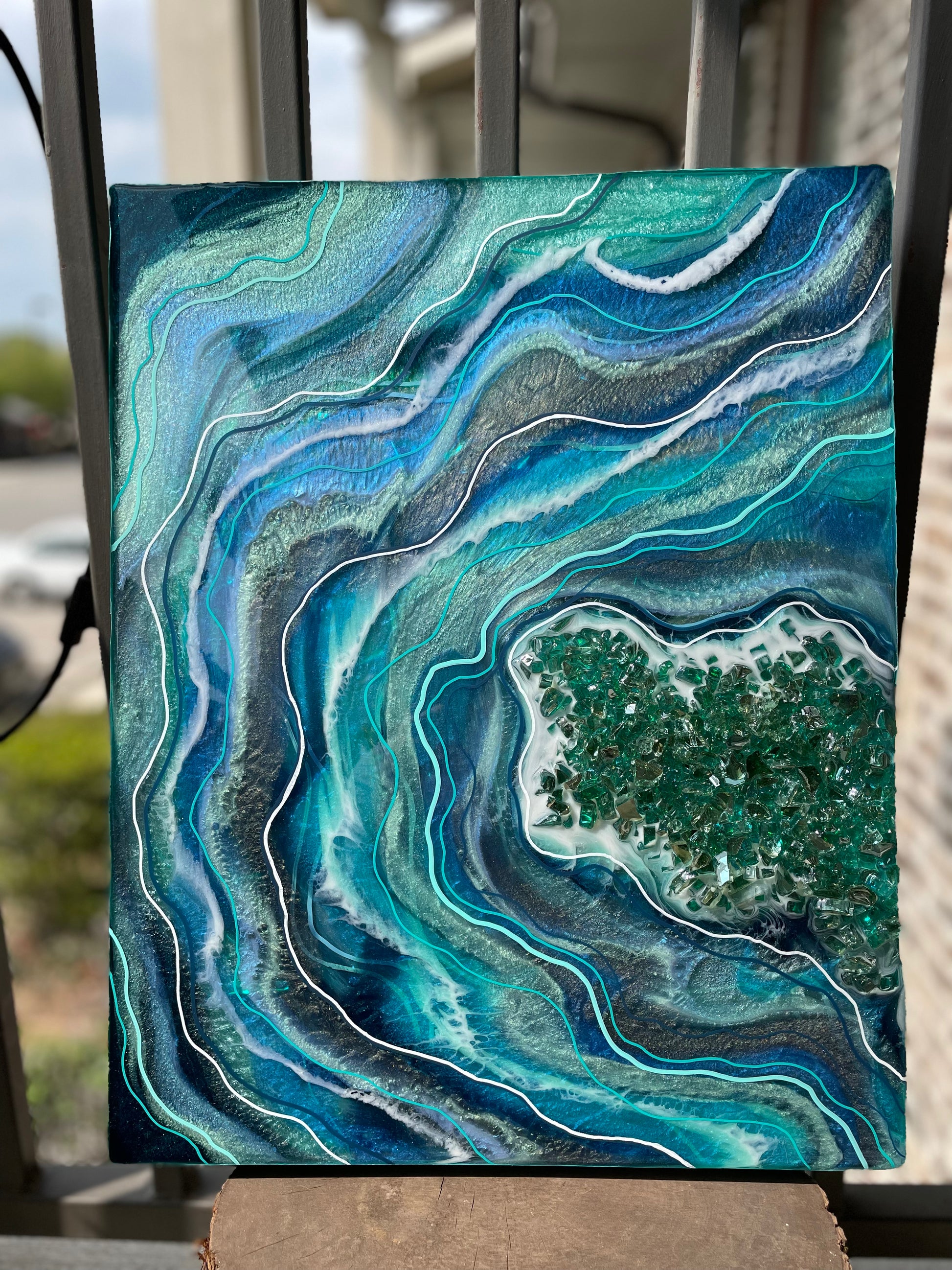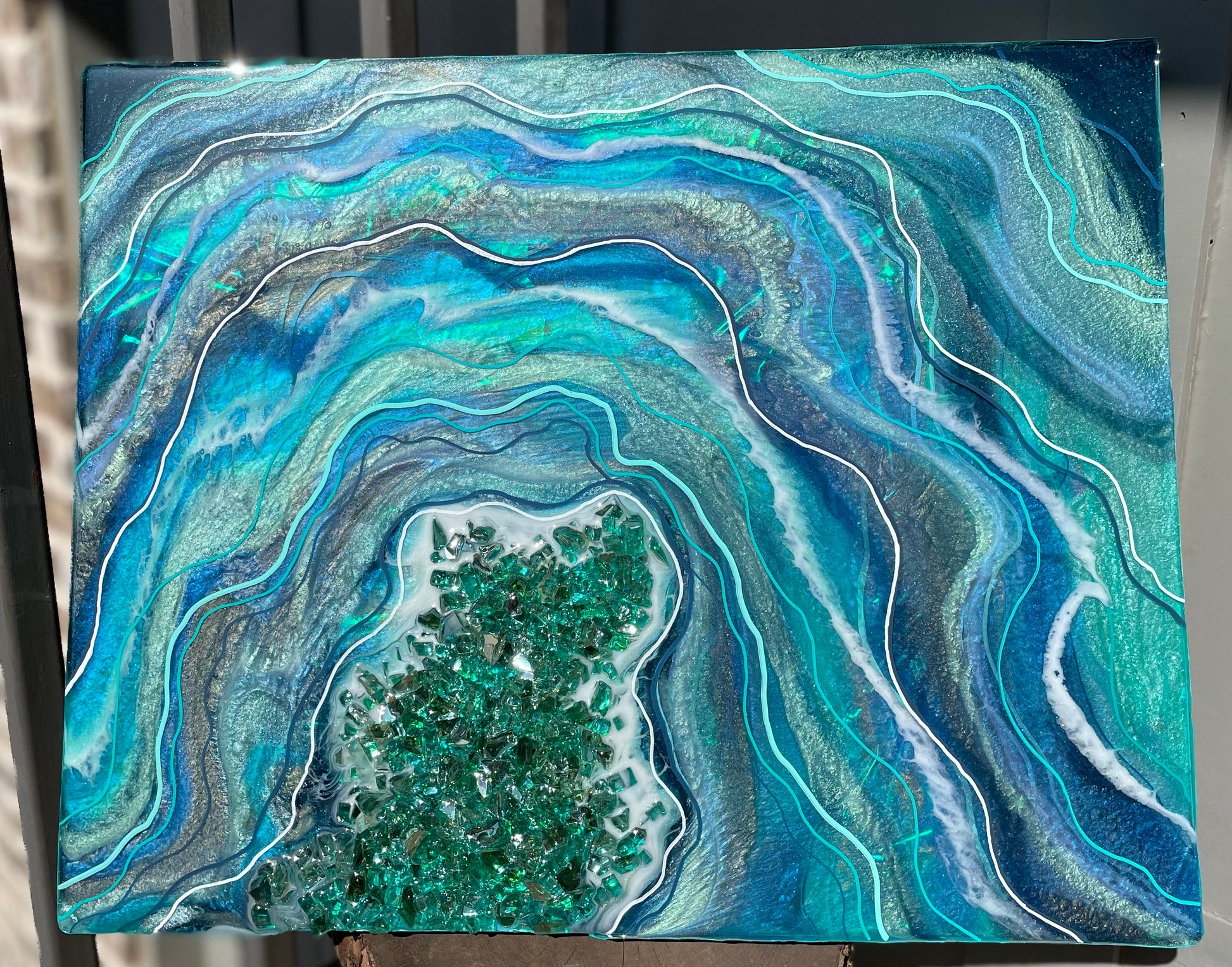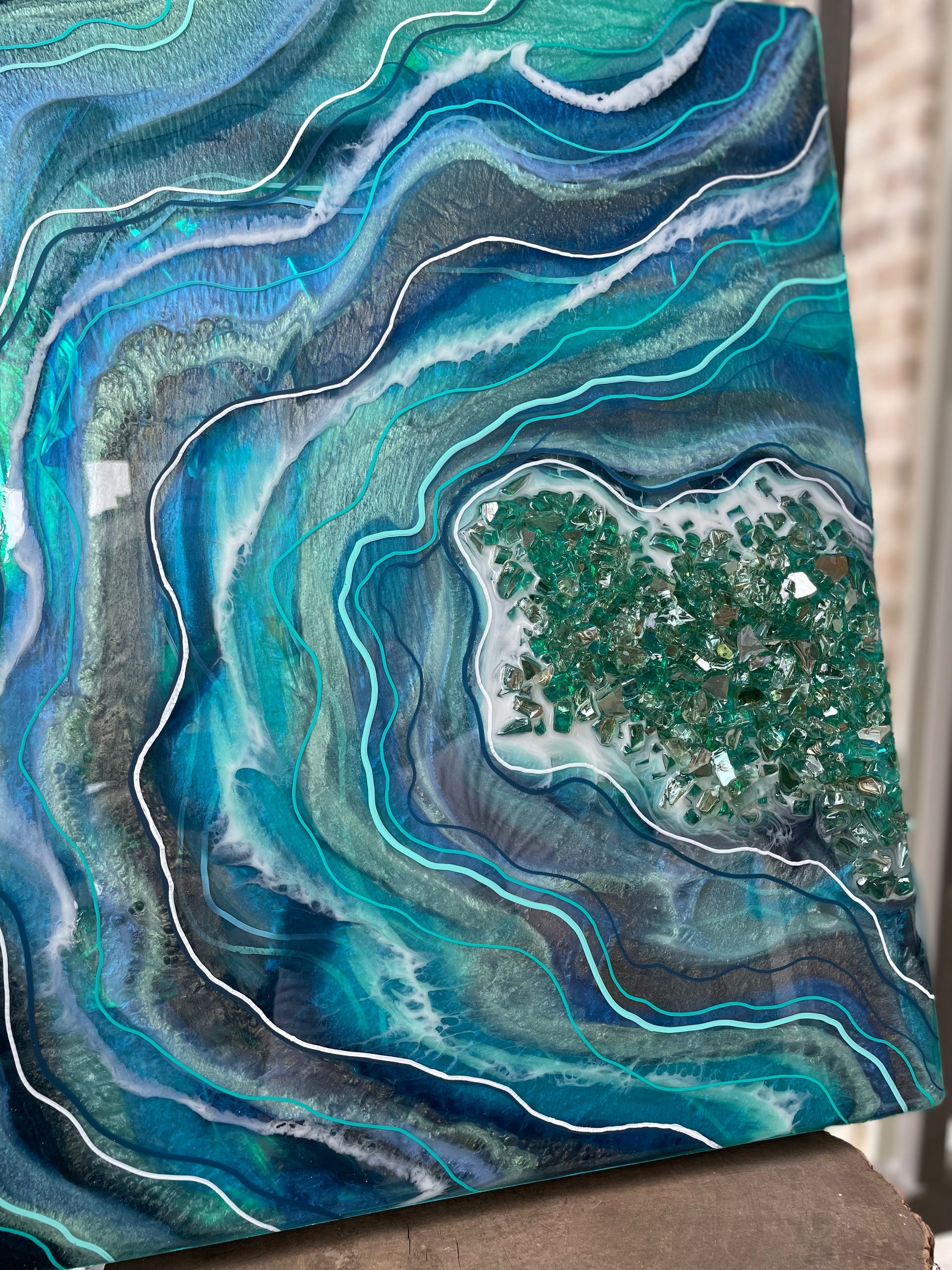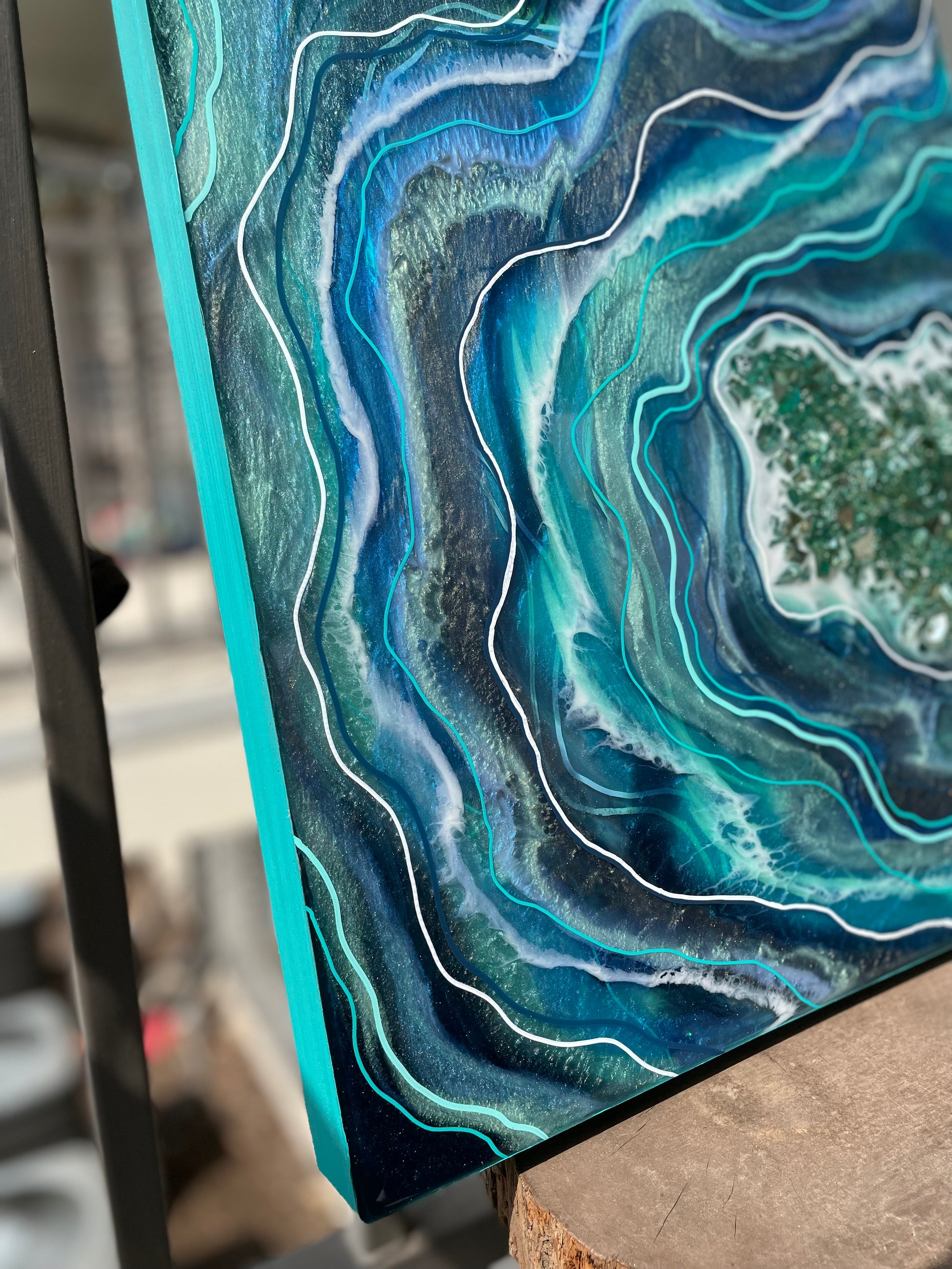 16x20 inch resin geode on canvas with 1 & 1/2 inch aqua painted sides.