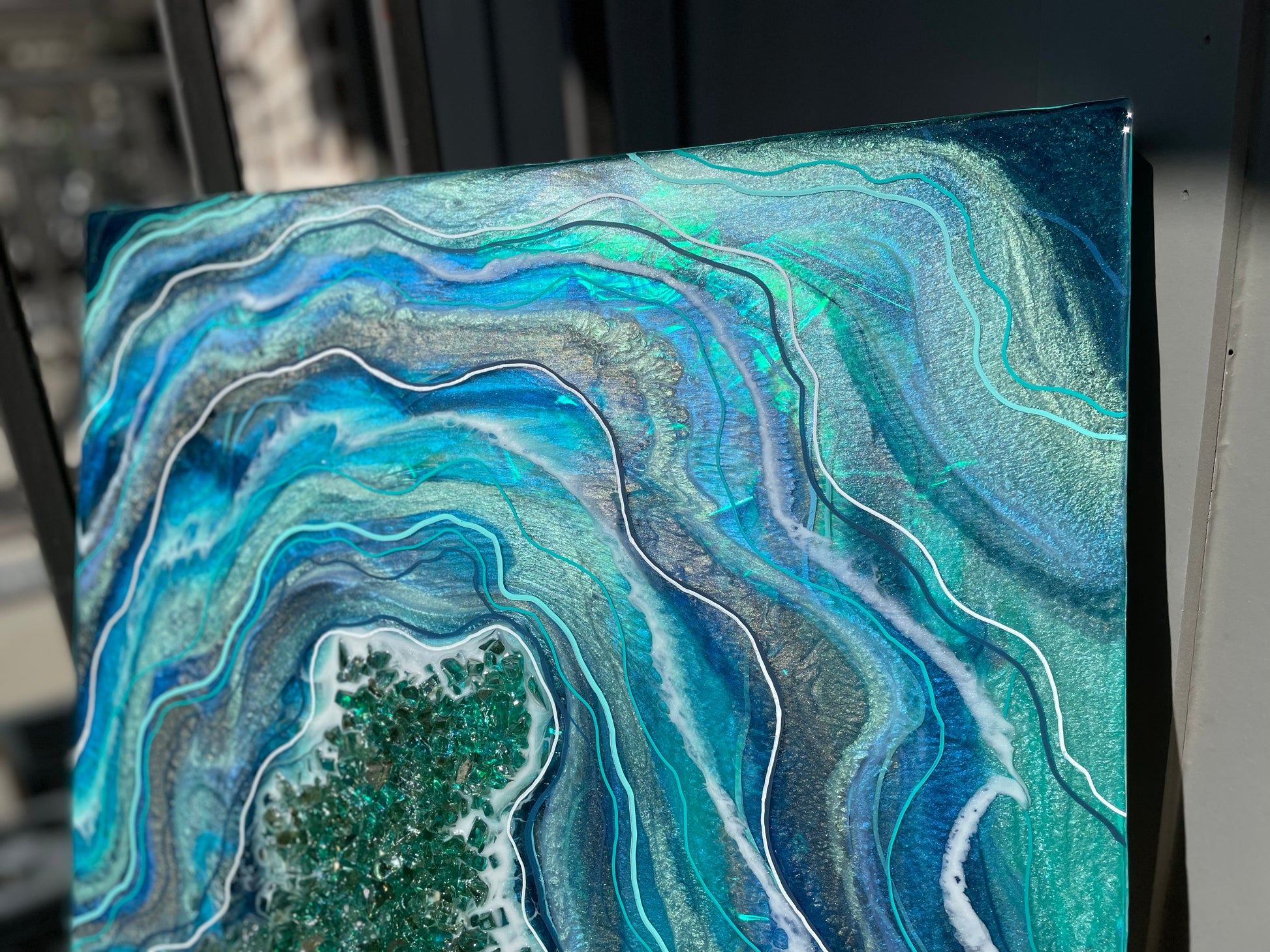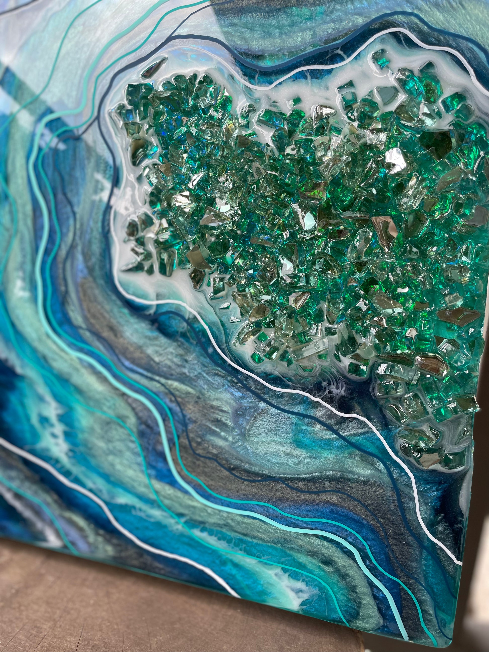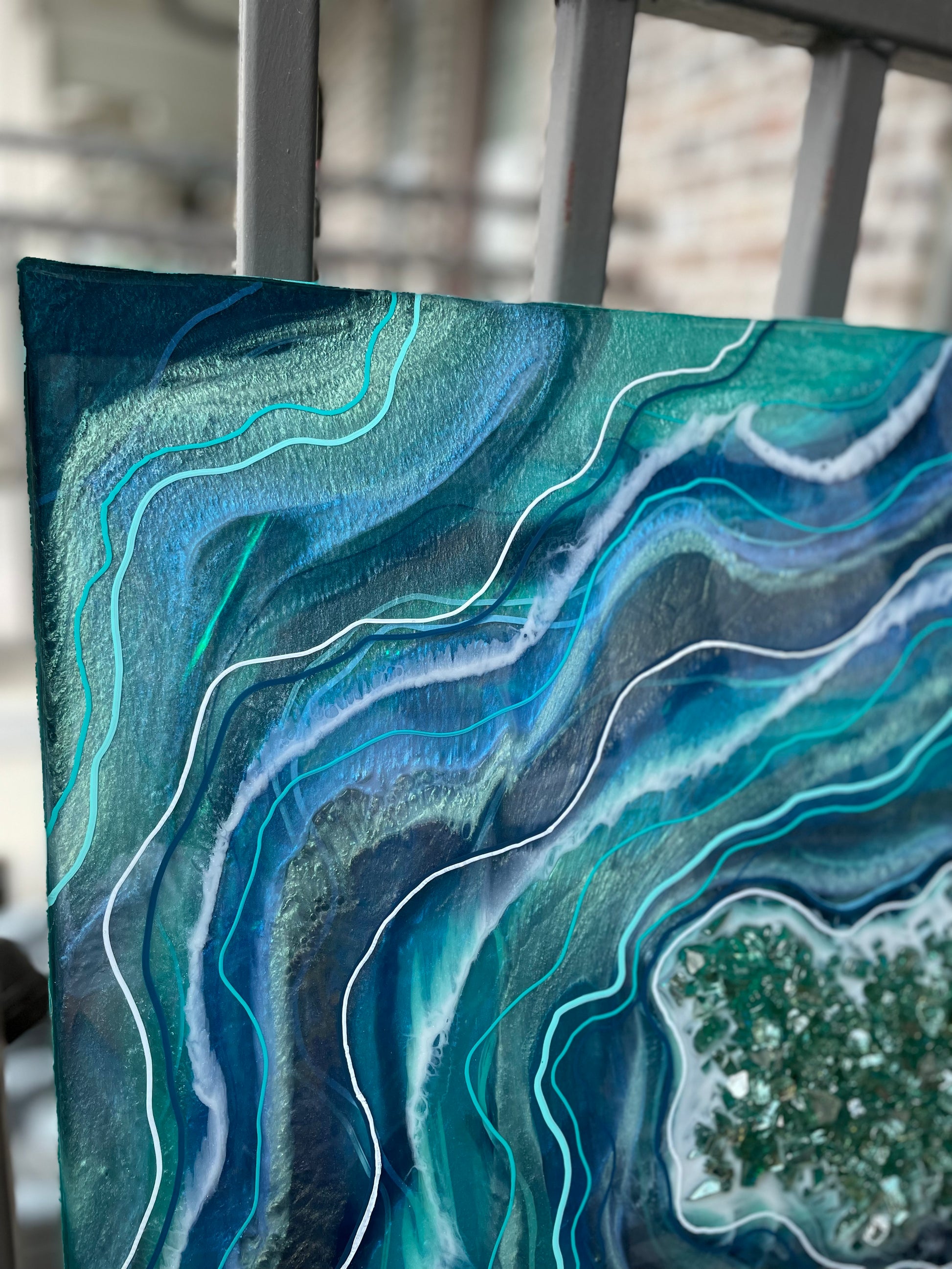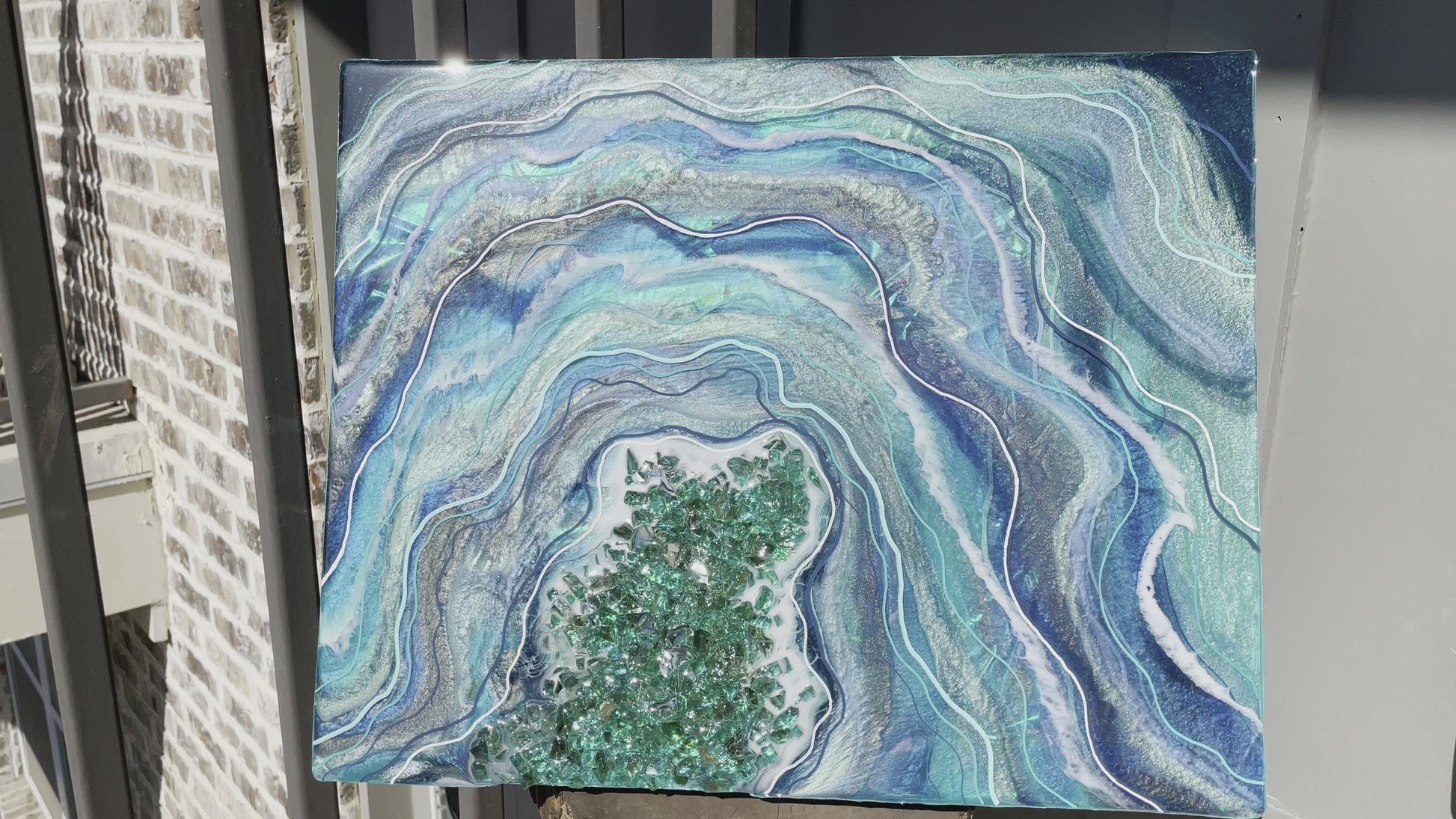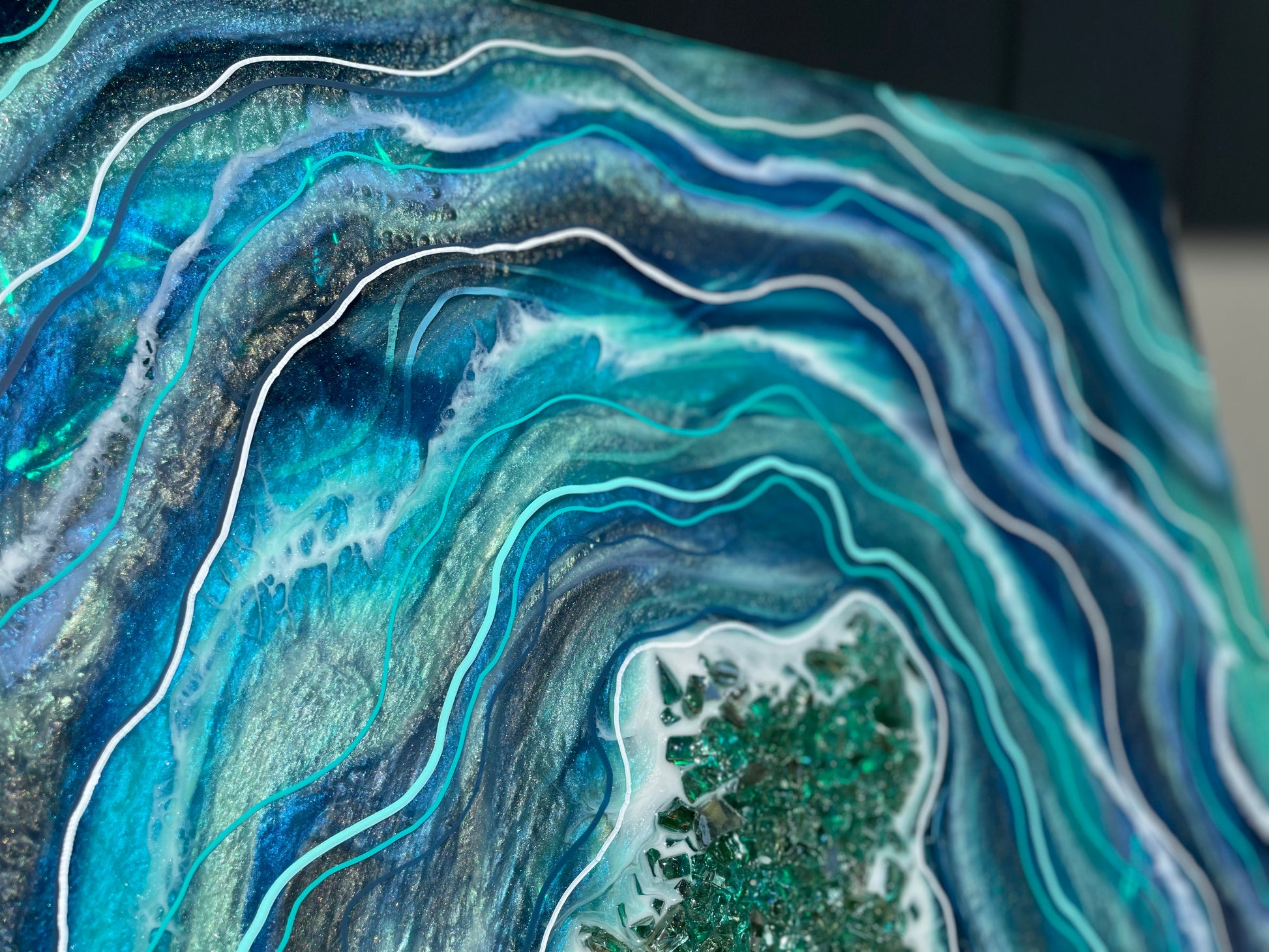 16x20 inch resin geode on canvas with 1 & 1/2 inch aqua painted sides.