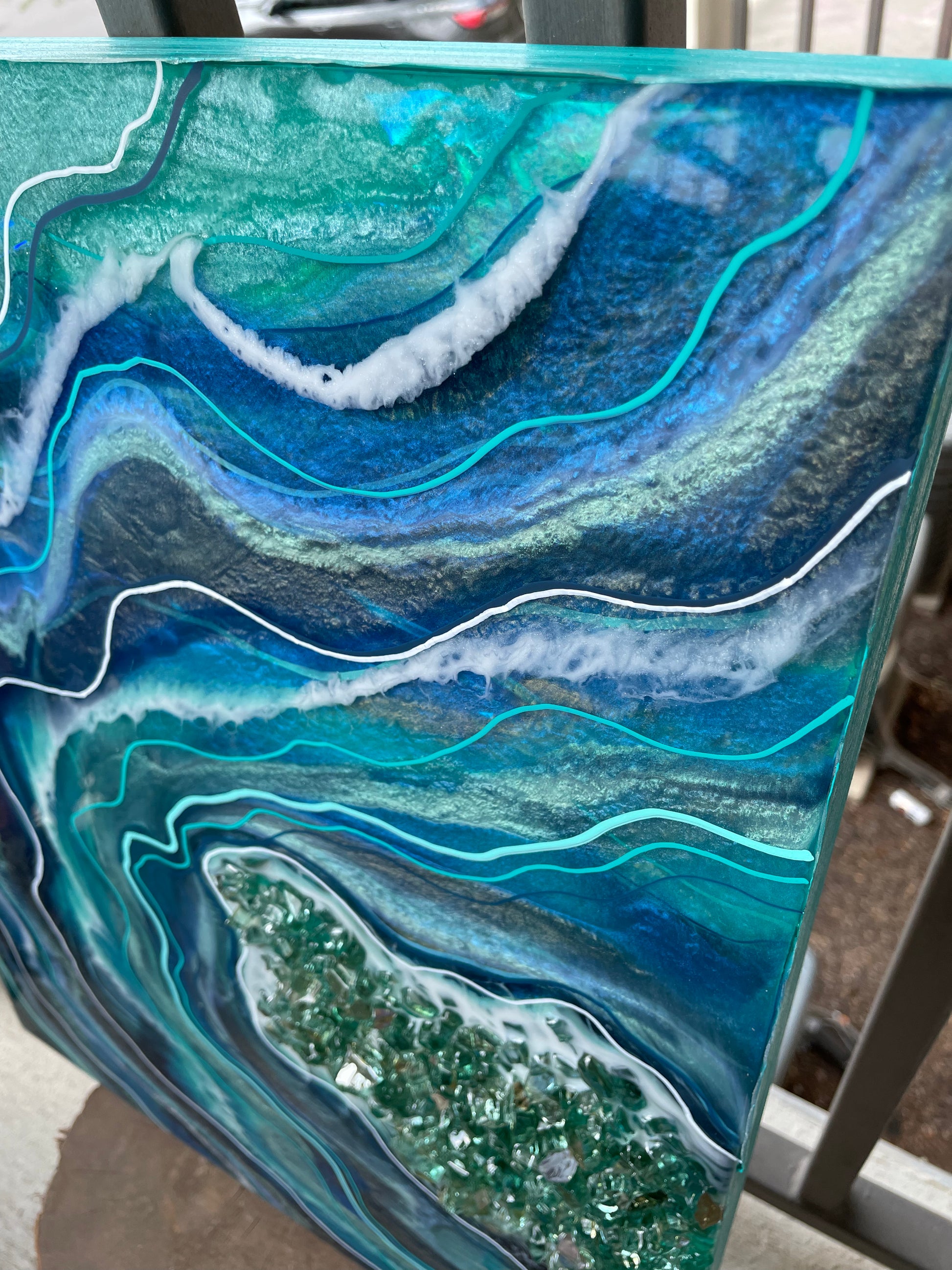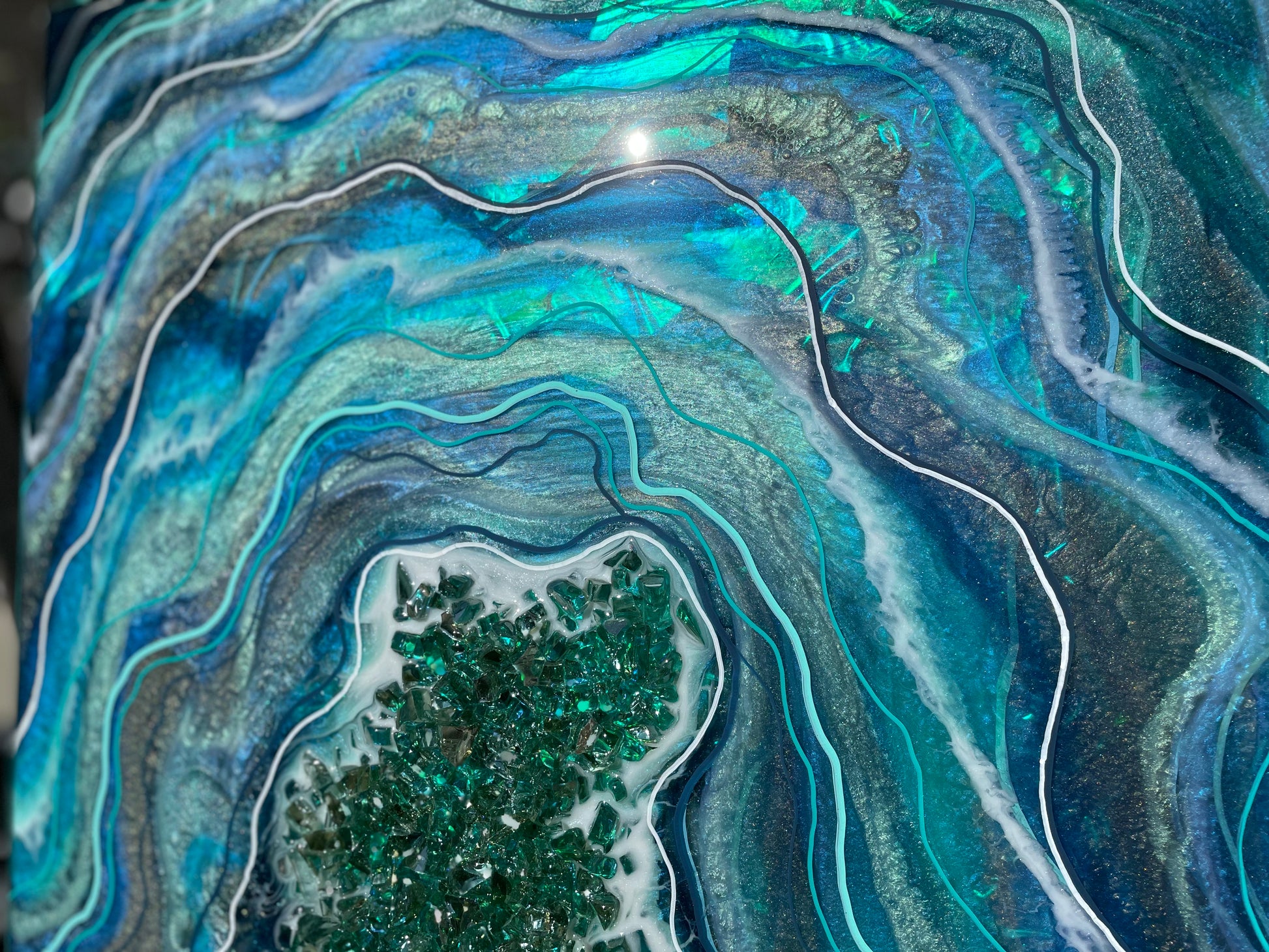 This geode slice recreation is inspired by the ocean; with varying colors of blue and green and hints of white, also if you look closely you can see hints of holographic peeking through.