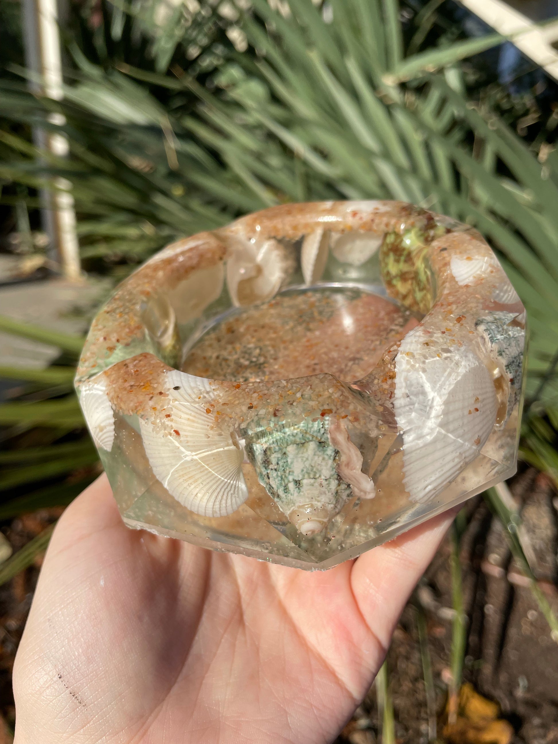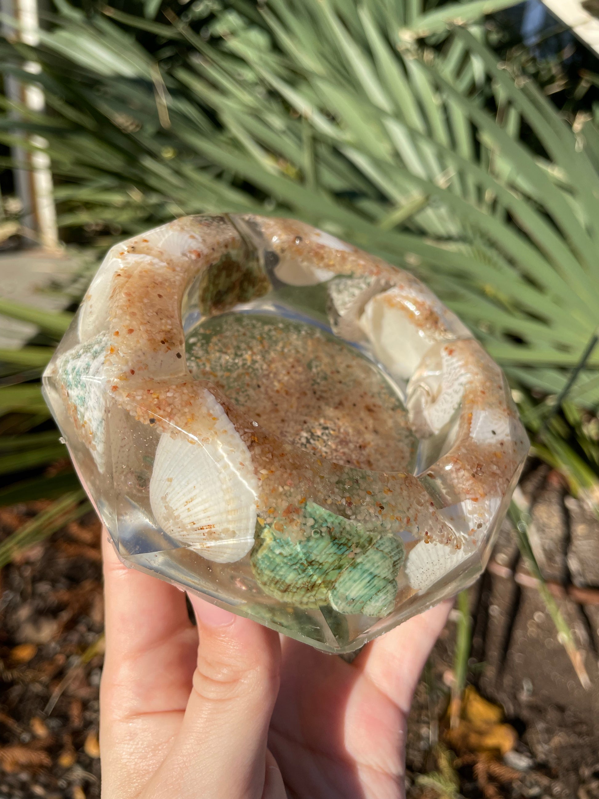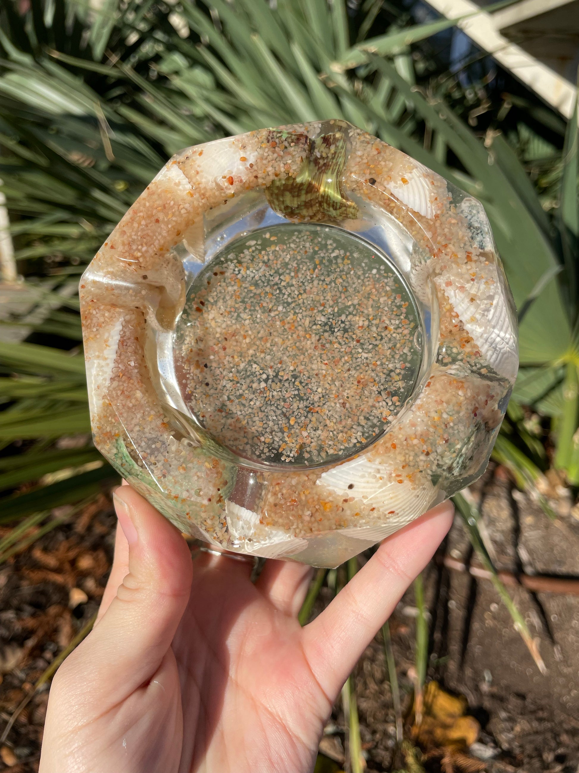 Ocean inspired ashtray/catch all dish. This product is made of resin with real shells & sand.