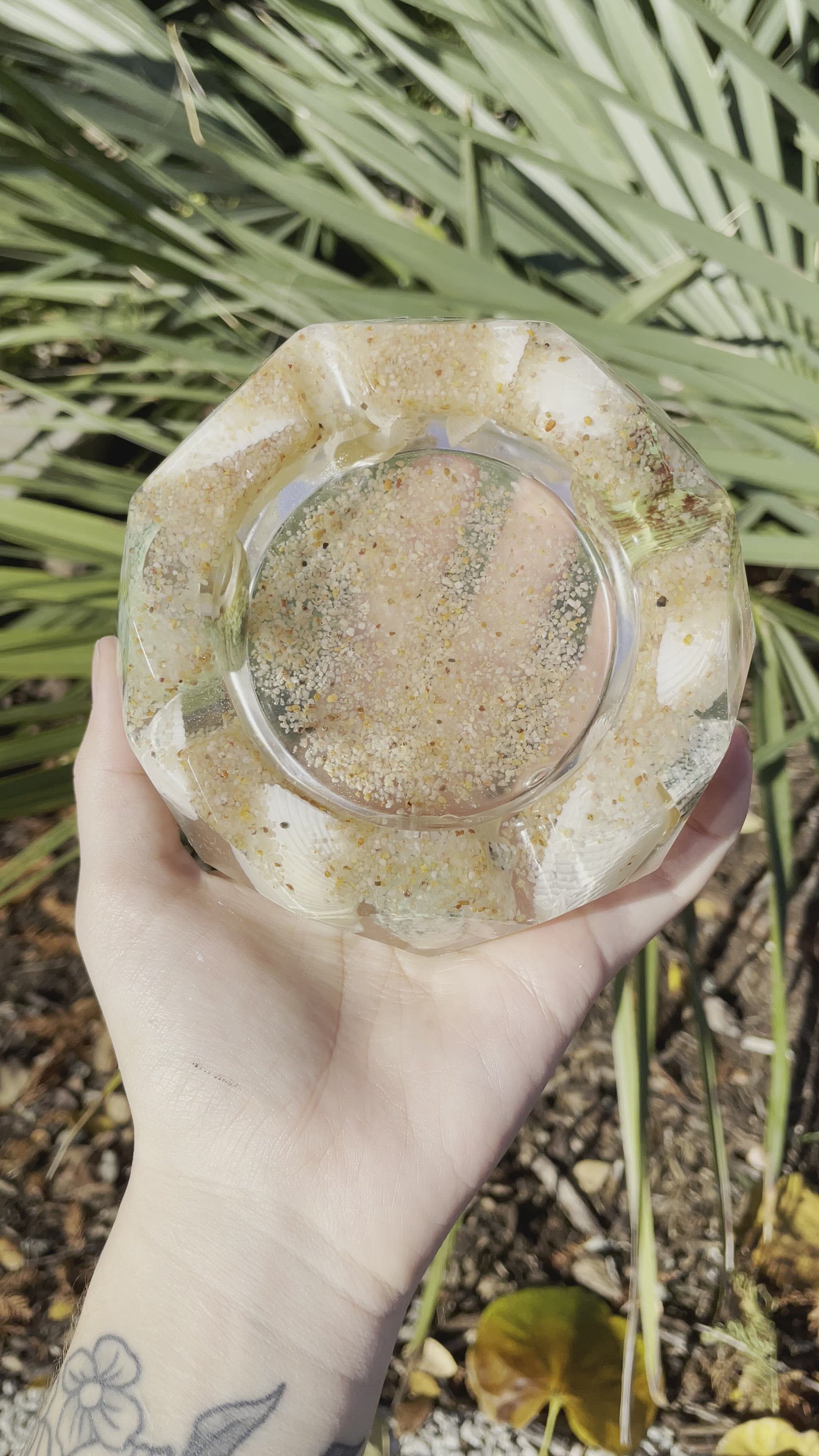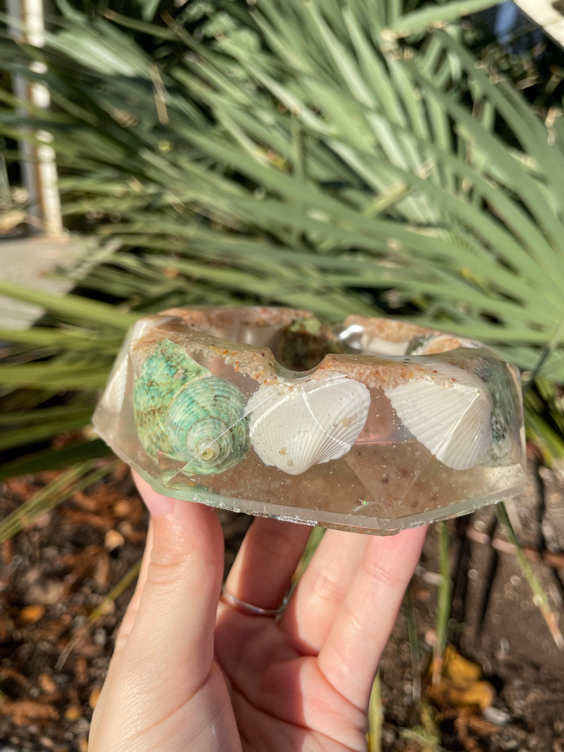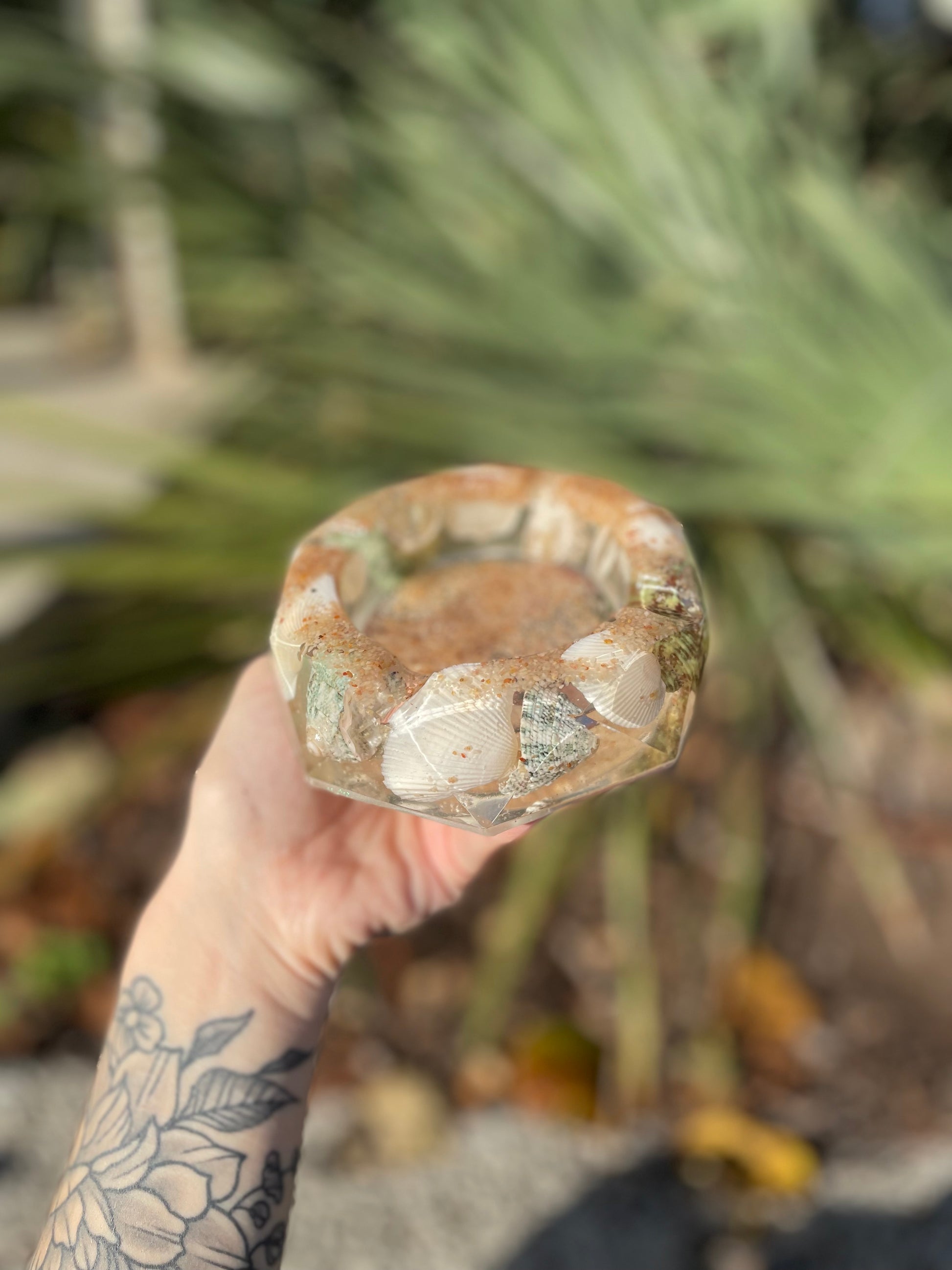 Ocean inspired ashtray/catch all dish. This product is made of resin with real shells & sand.