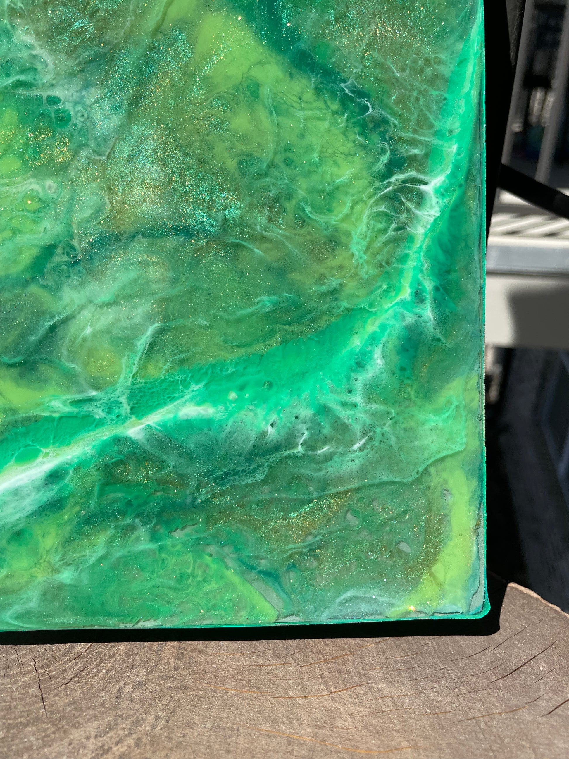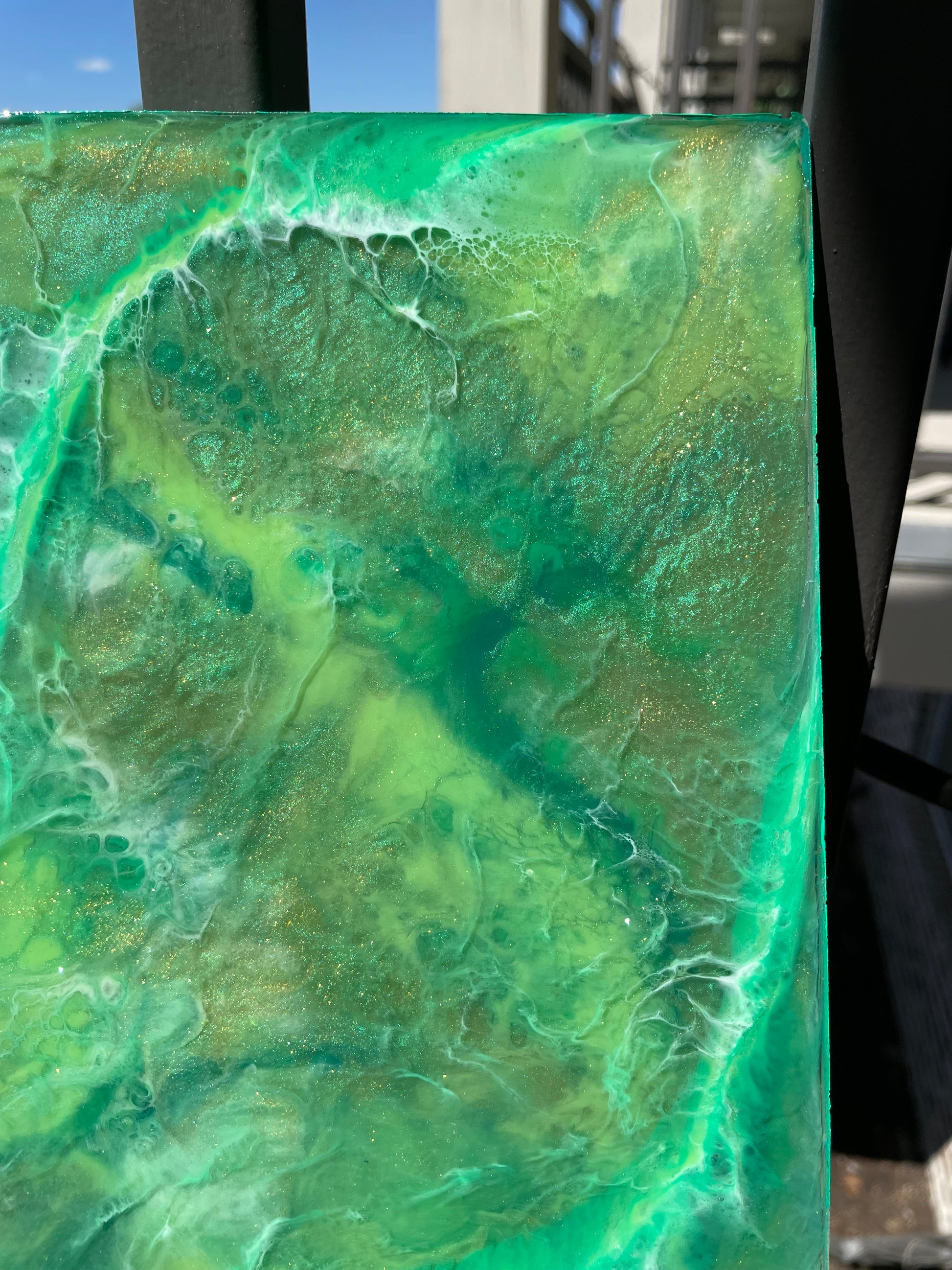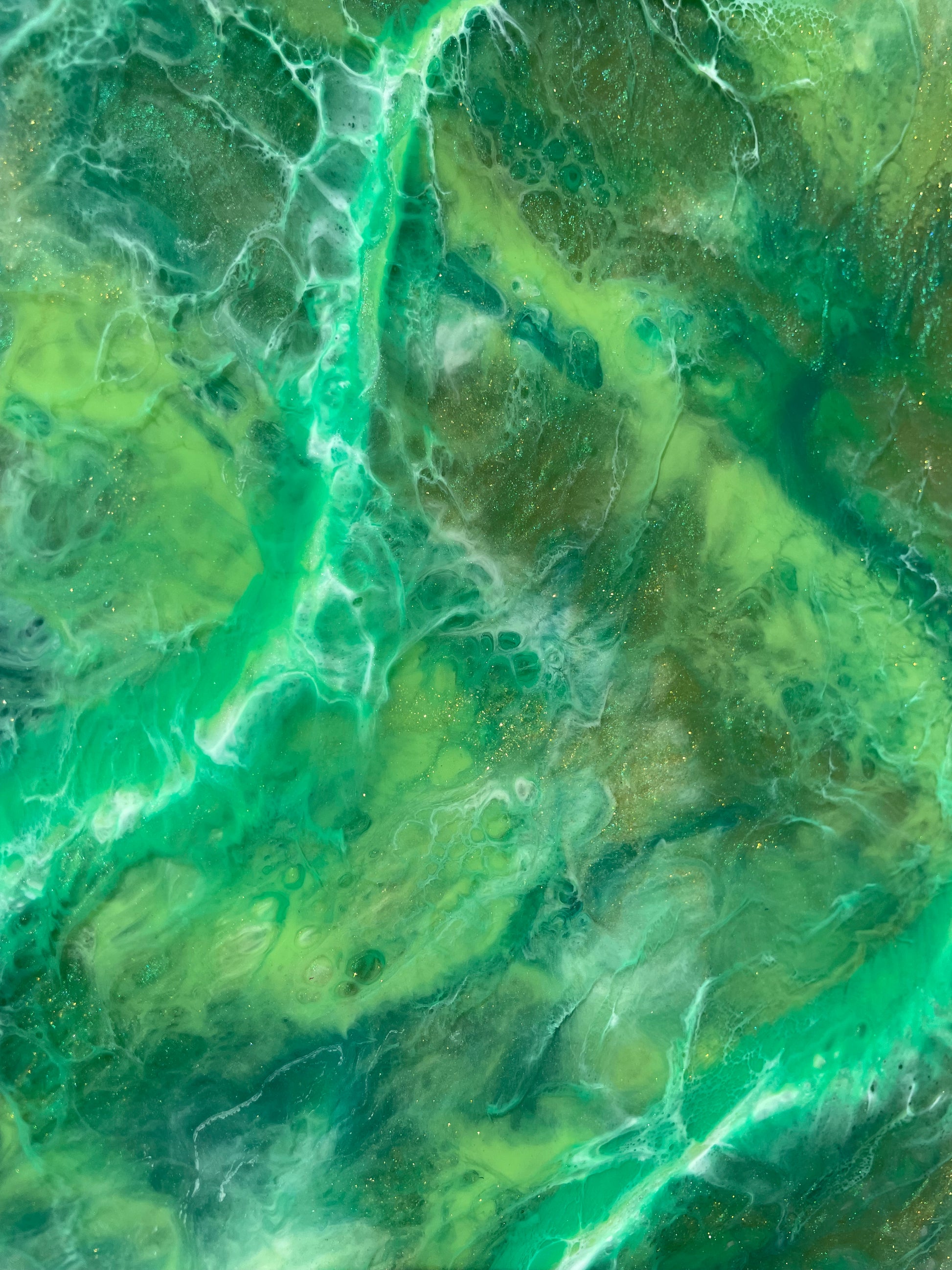 This abstract piece has multiple shades of green layering on top of eachother, and gold glitter throughout.