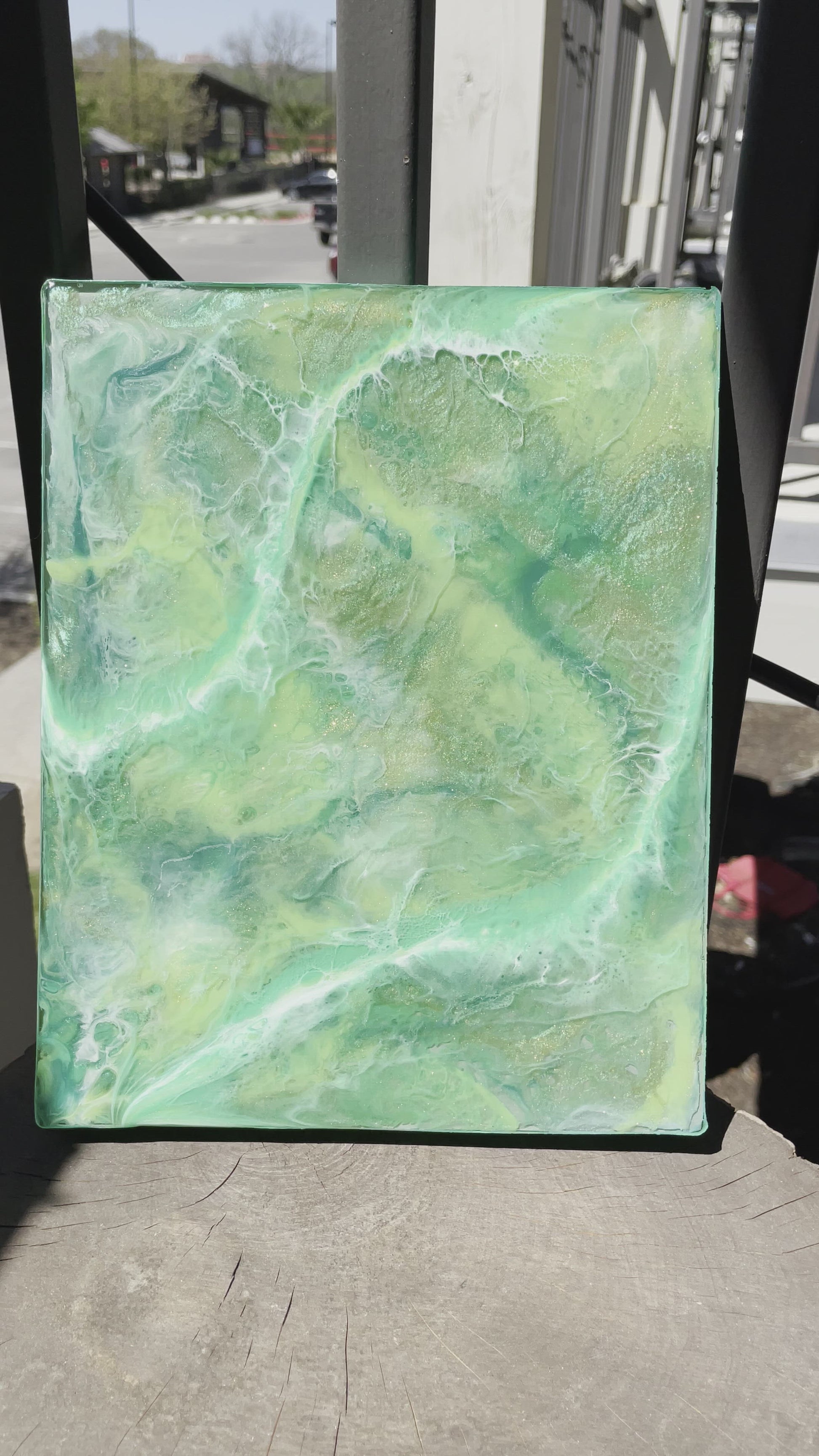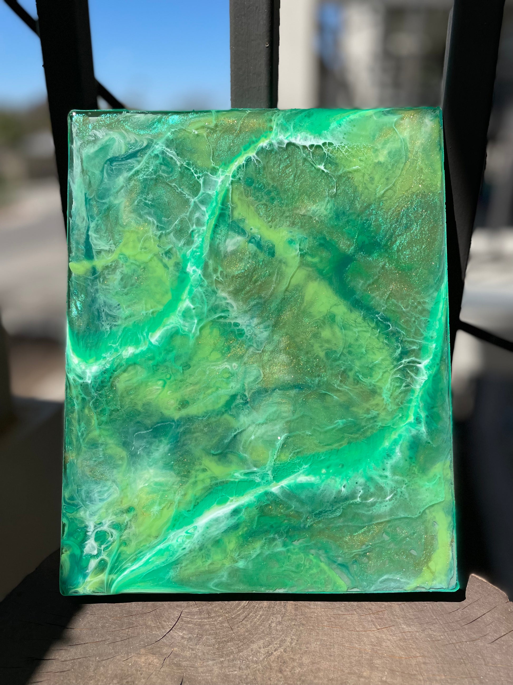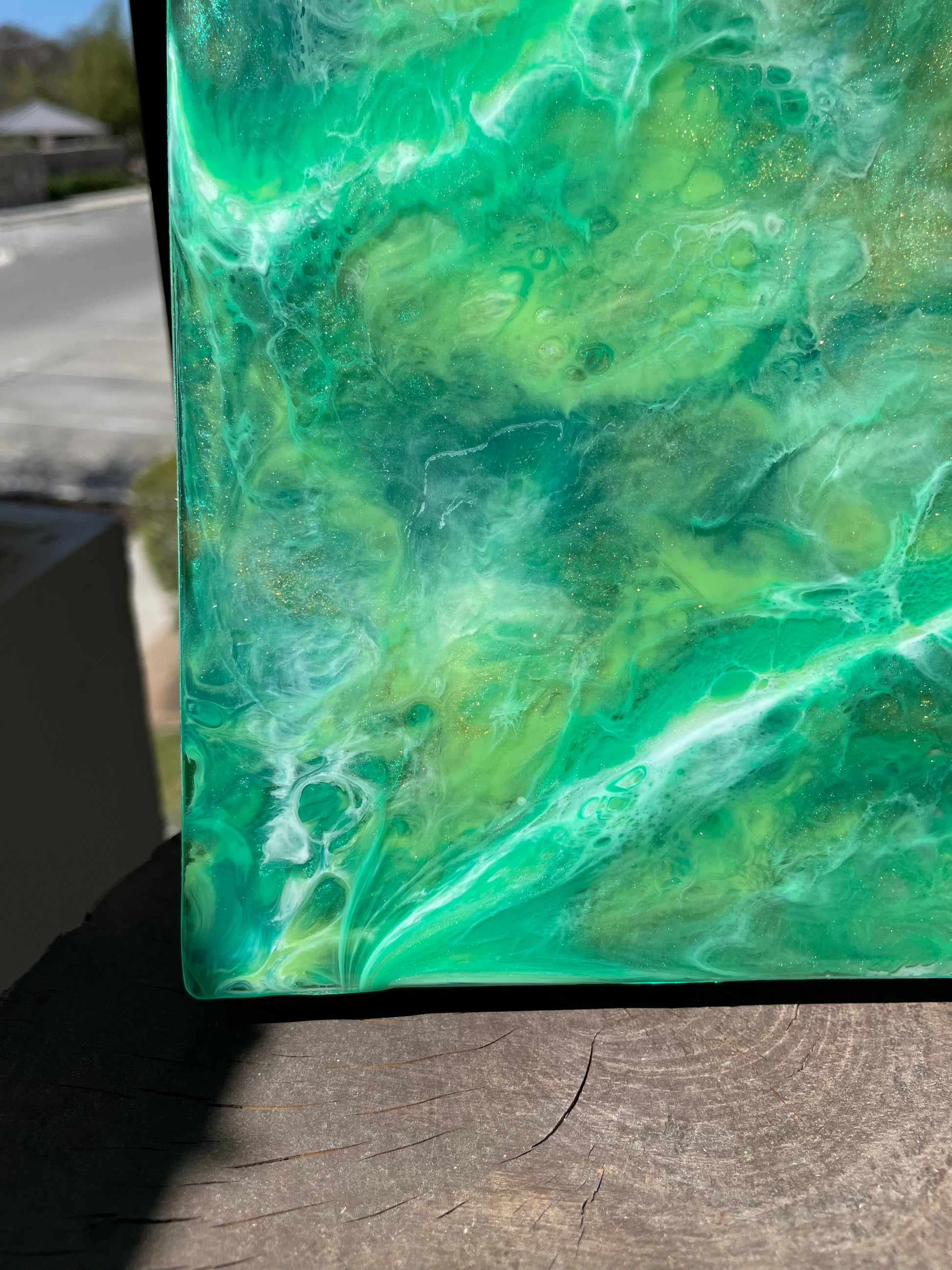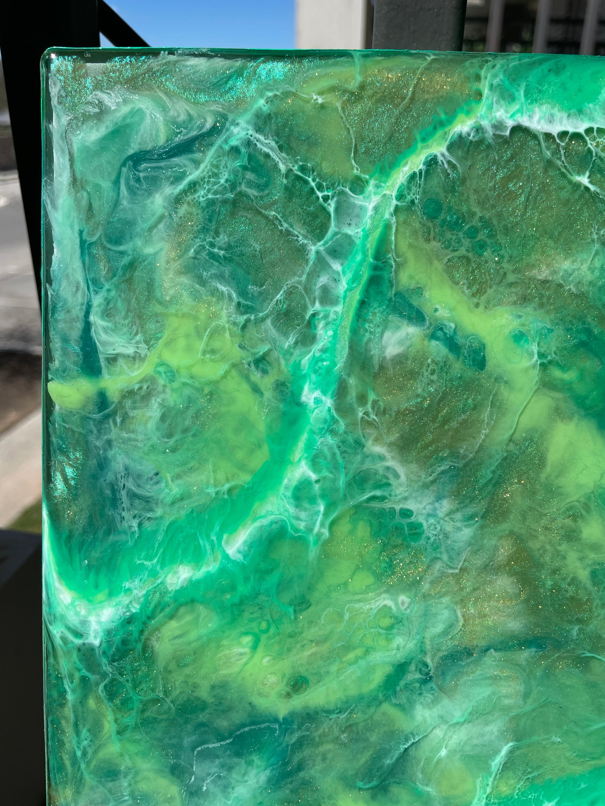This abstract piece has multiple shades of green layering on top of eachother, and gold glitter throughout.