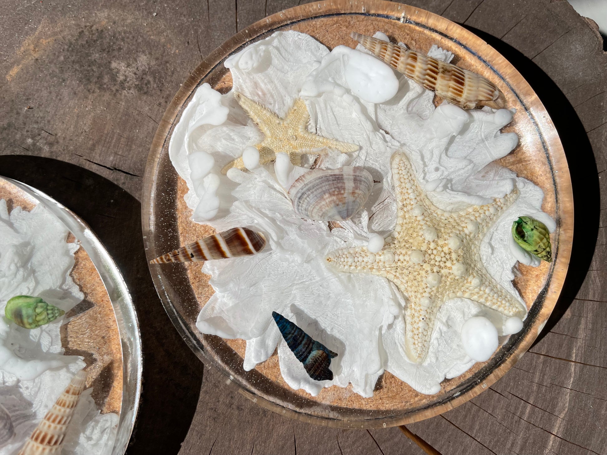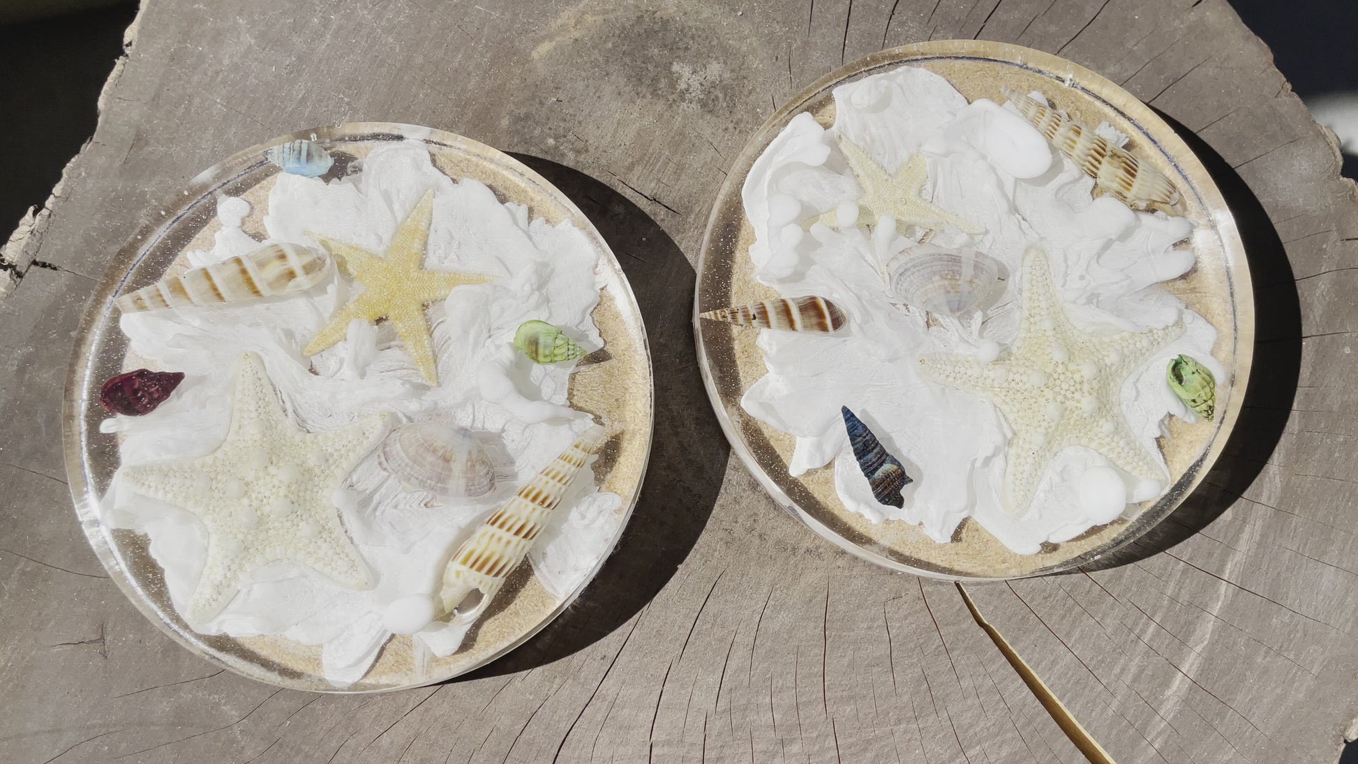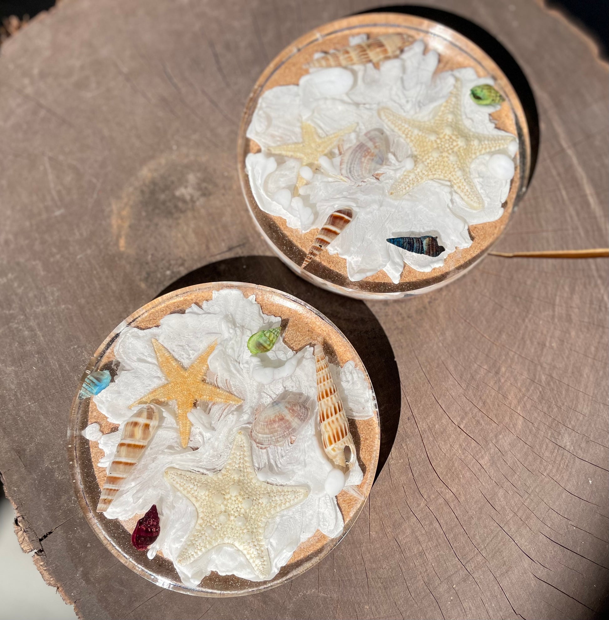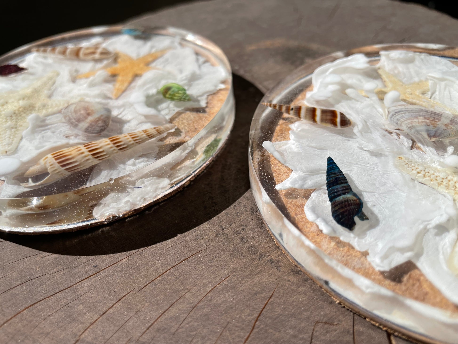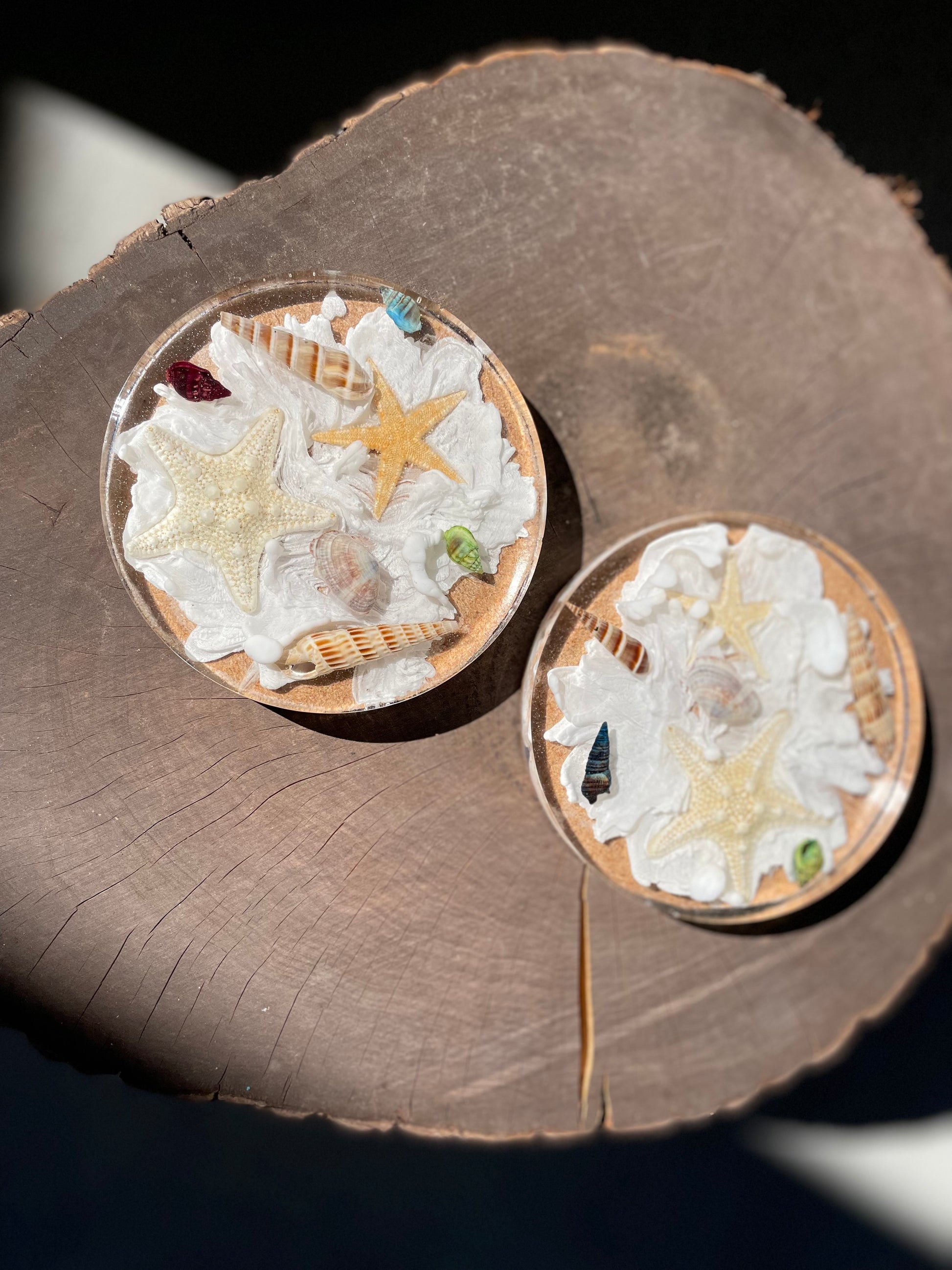 2 coasters come in this ocean inspired set. Both coasters are made with real starfish, and shells; also added is white pigment to mimic waves. The bottom of these coasters are made of cork.