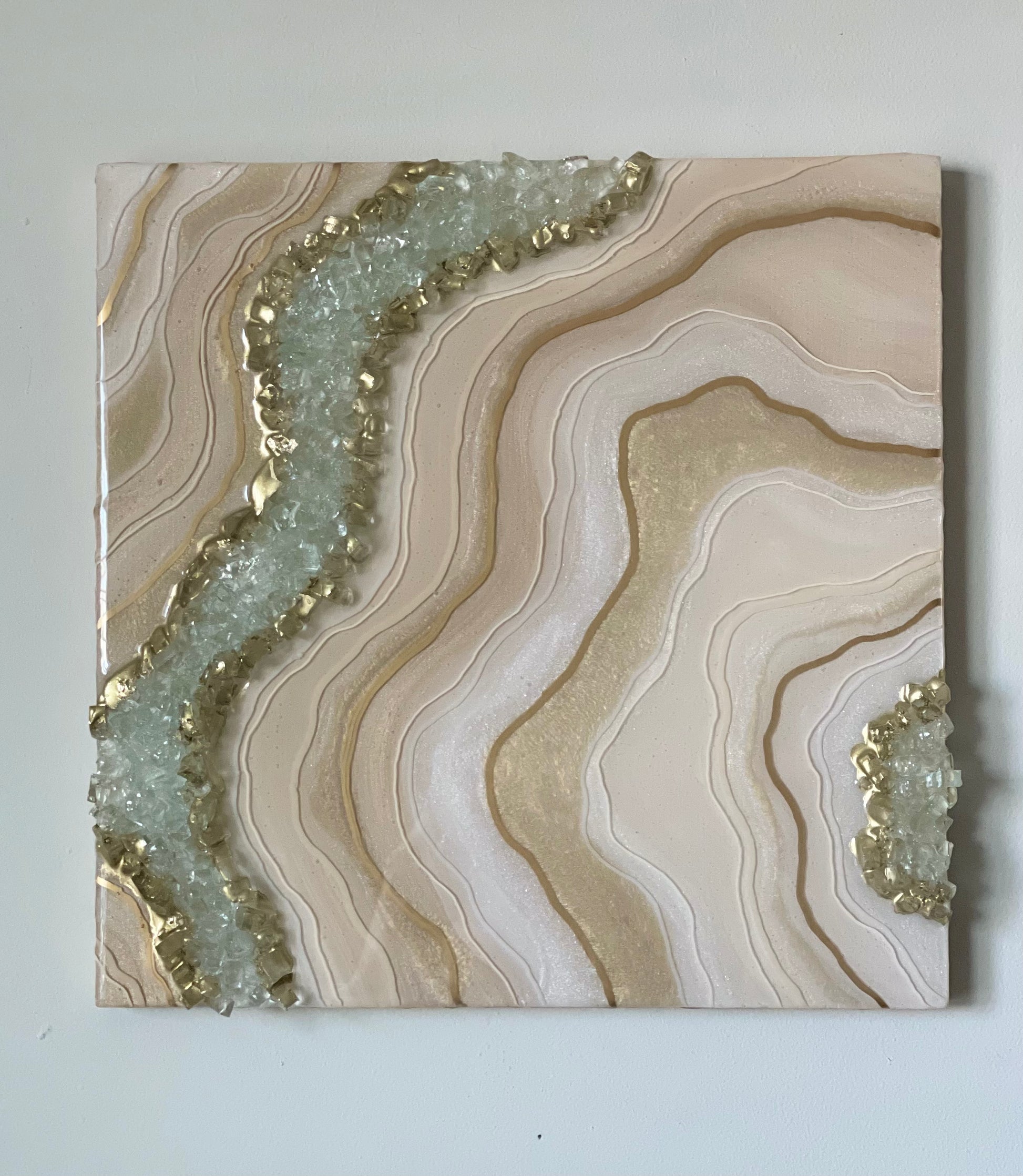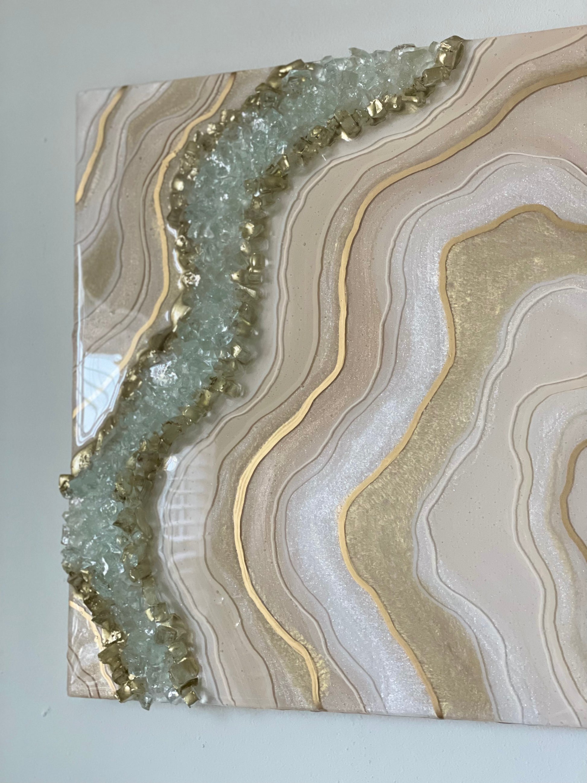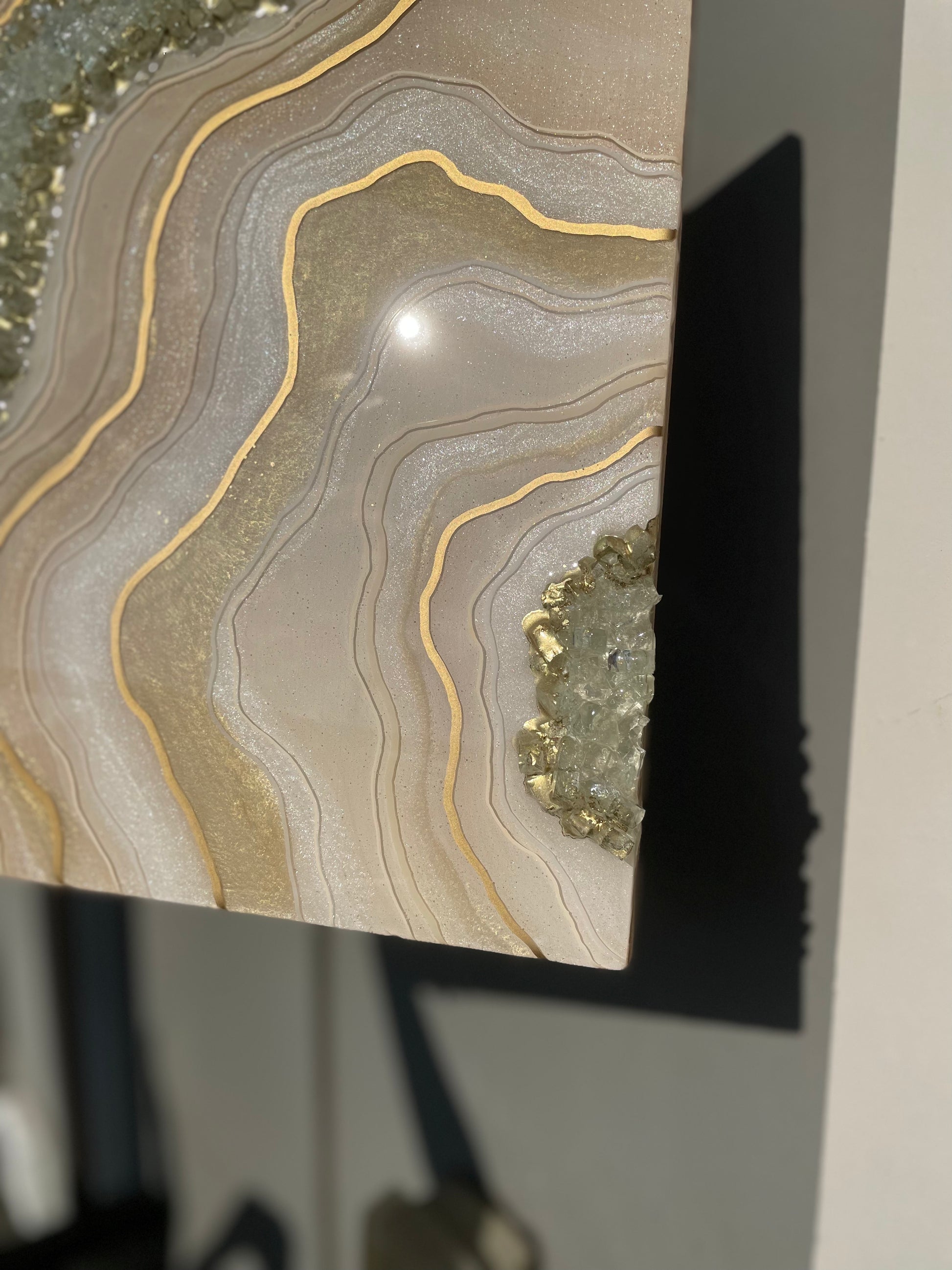 12x12 mixed media wall art/home decor; This geode slice recreation is made of neutral colors. Enhanced with pigmented resin & detailed lines (with sparkly champagne painted sides).