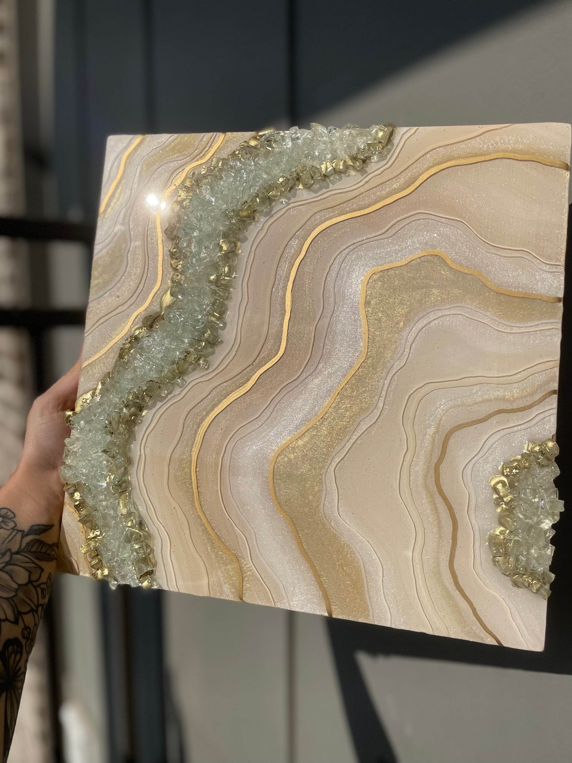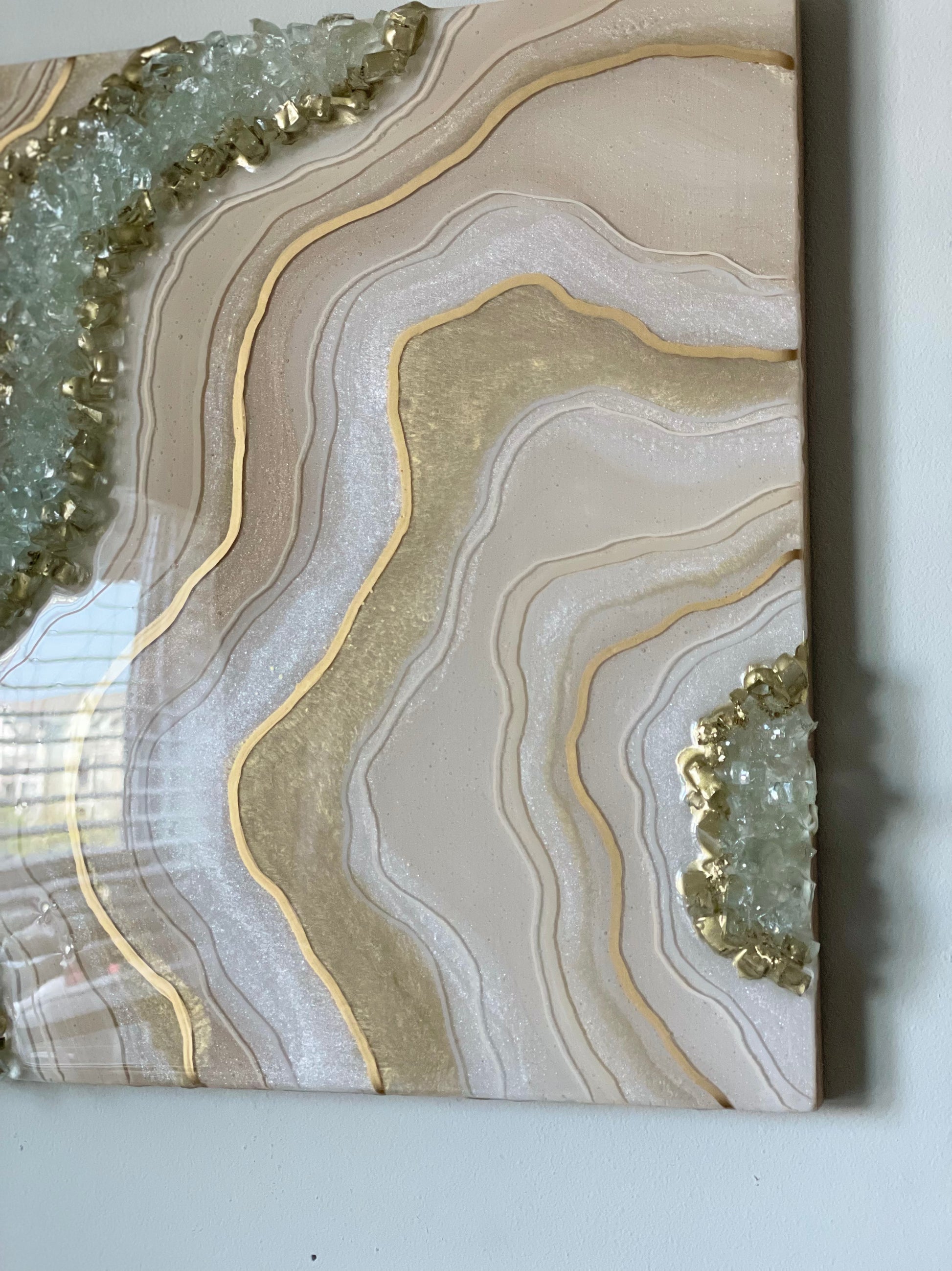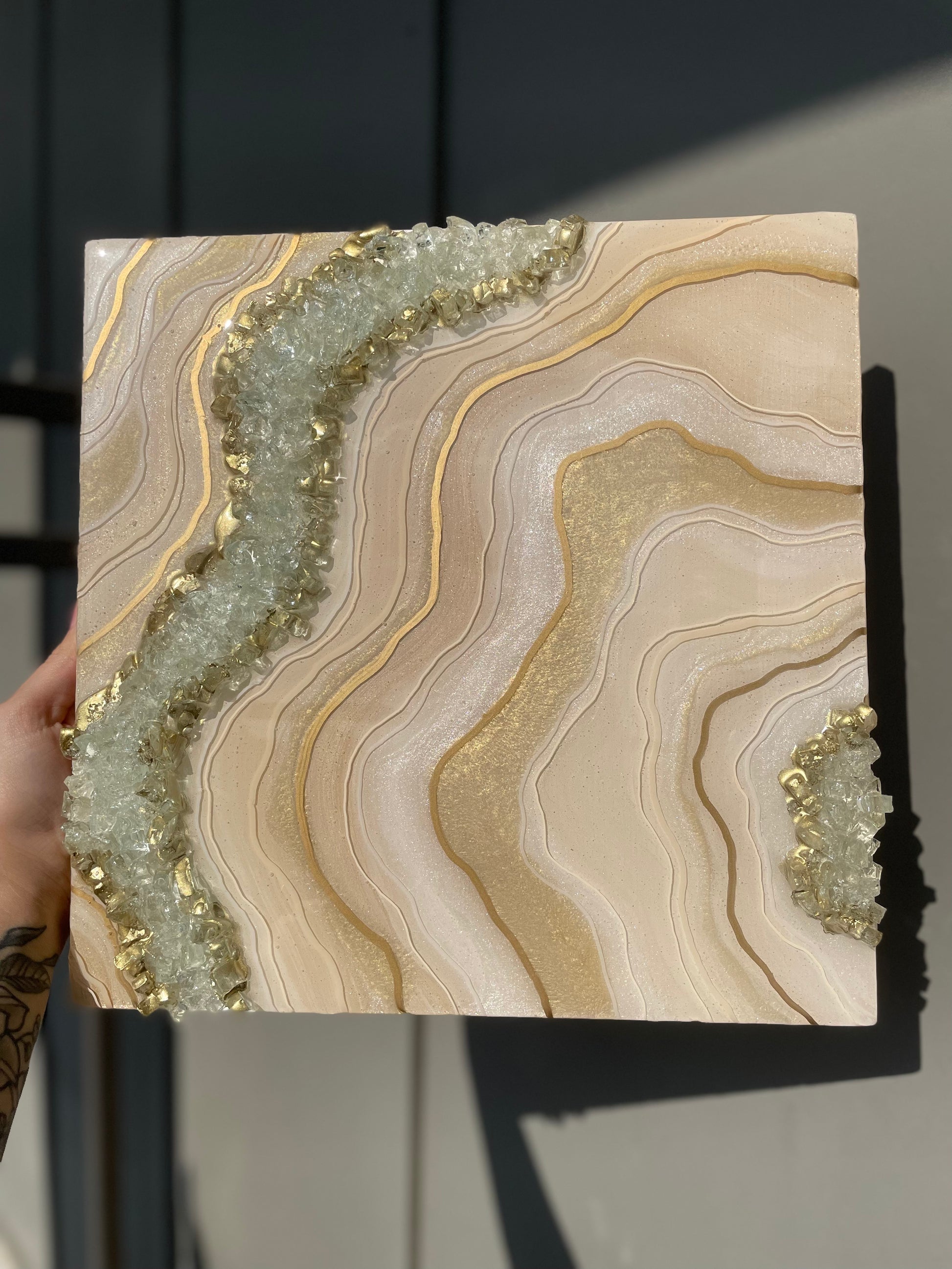 12x12 mixed media wall art/home decor; This geode slice recreation is made of neutral colors. Enhanced with pigmented resin & detailed lines (with sparkly champagne painted sides).