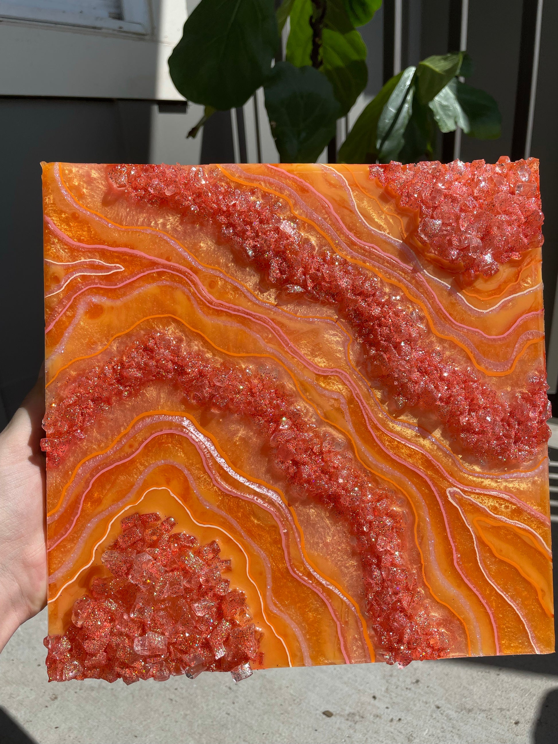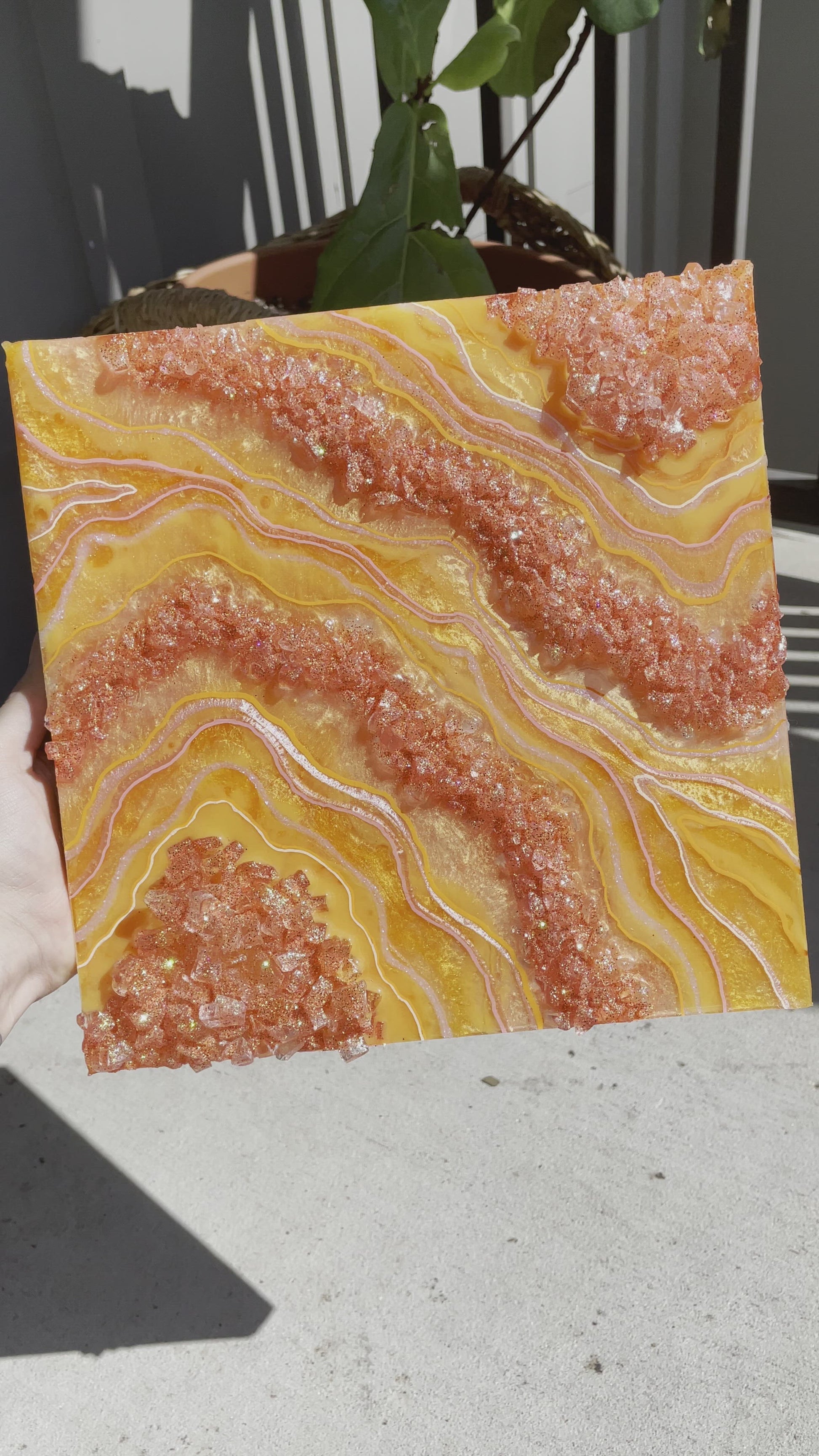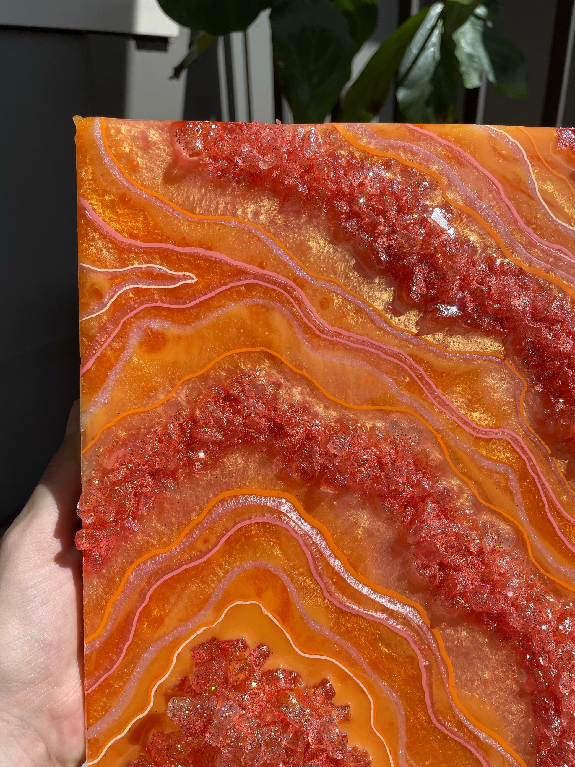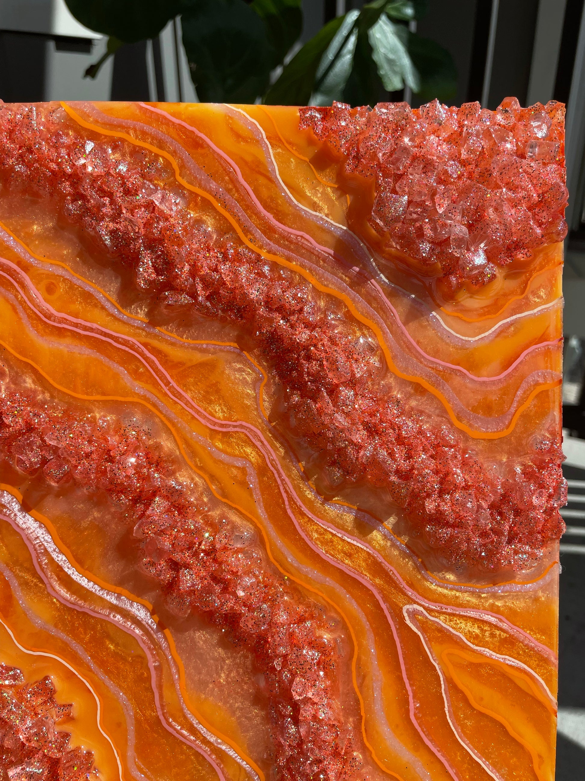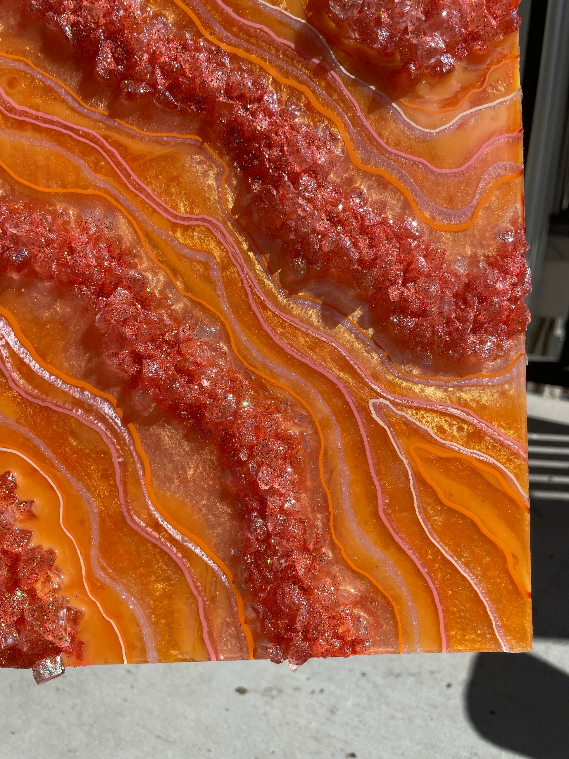 This geode slice recreation is inspired by the colors of a beautiful sunset, that will shine in any home. Sunburst is created with pigmented resin, faux stones, glitter & fine line details.