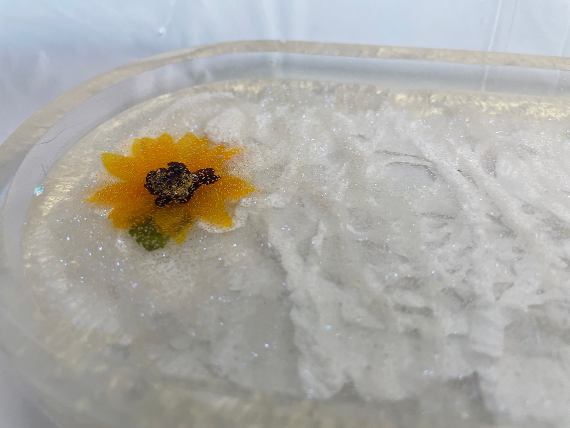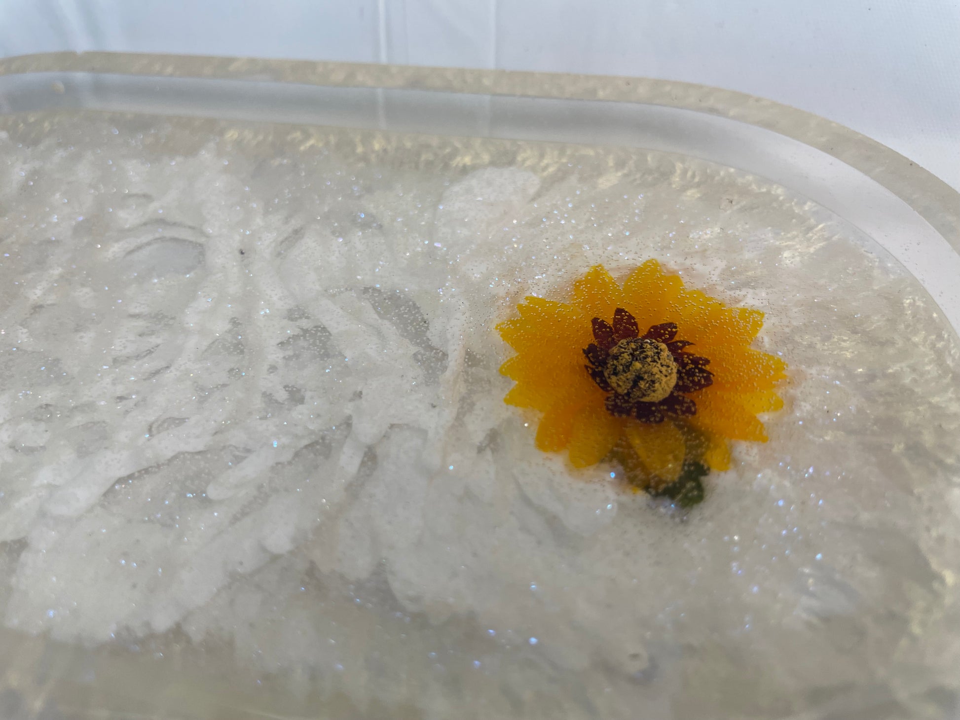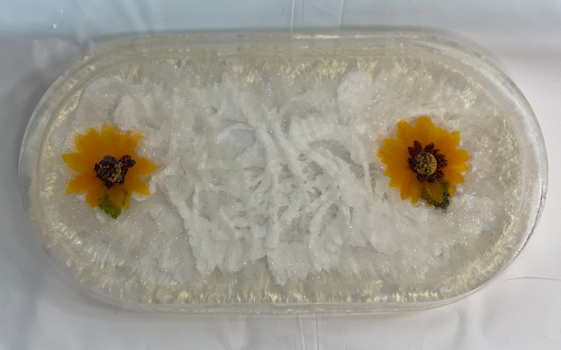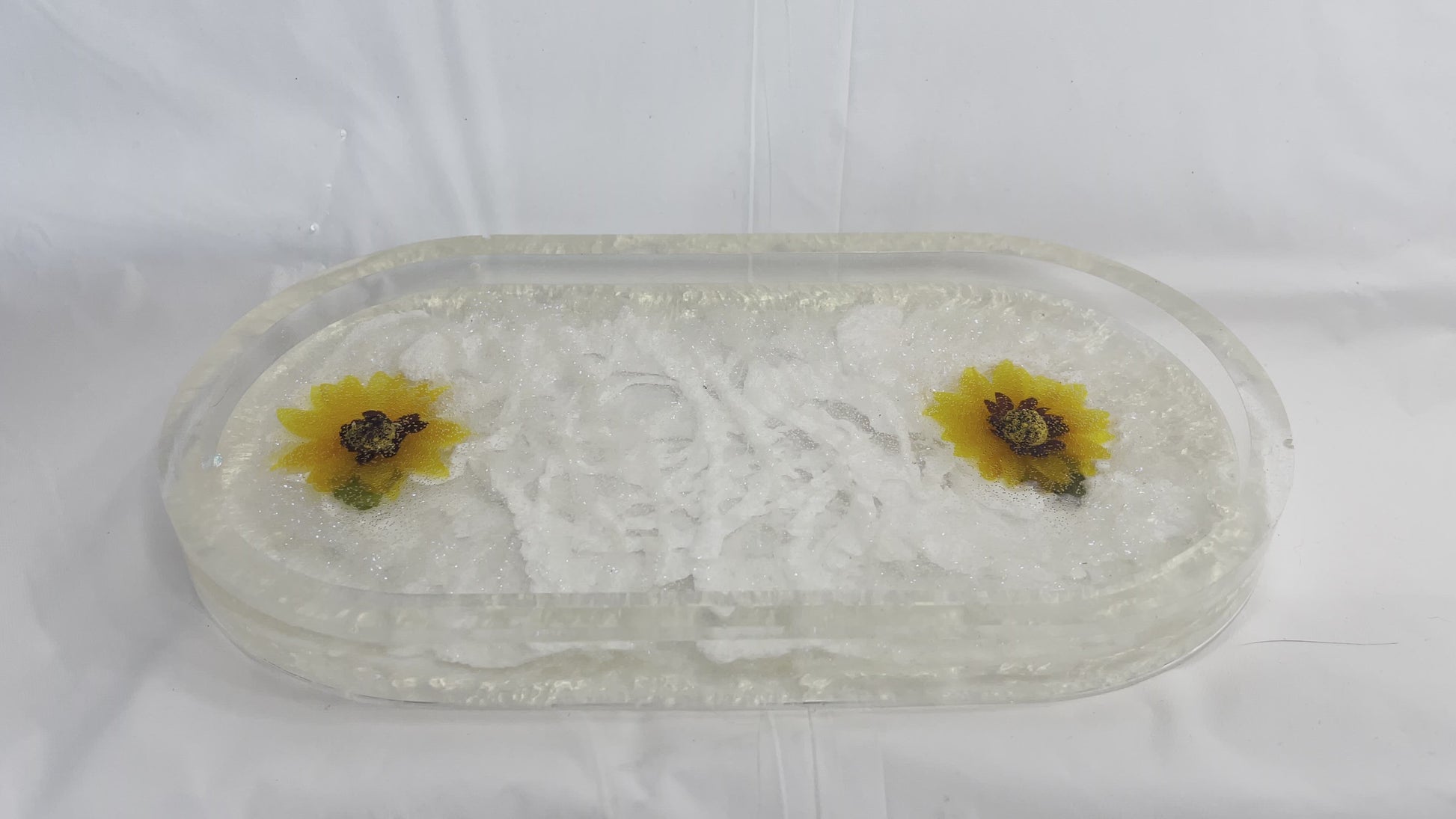 Resin made tray made with shades of white pigments & faux sunflowers.