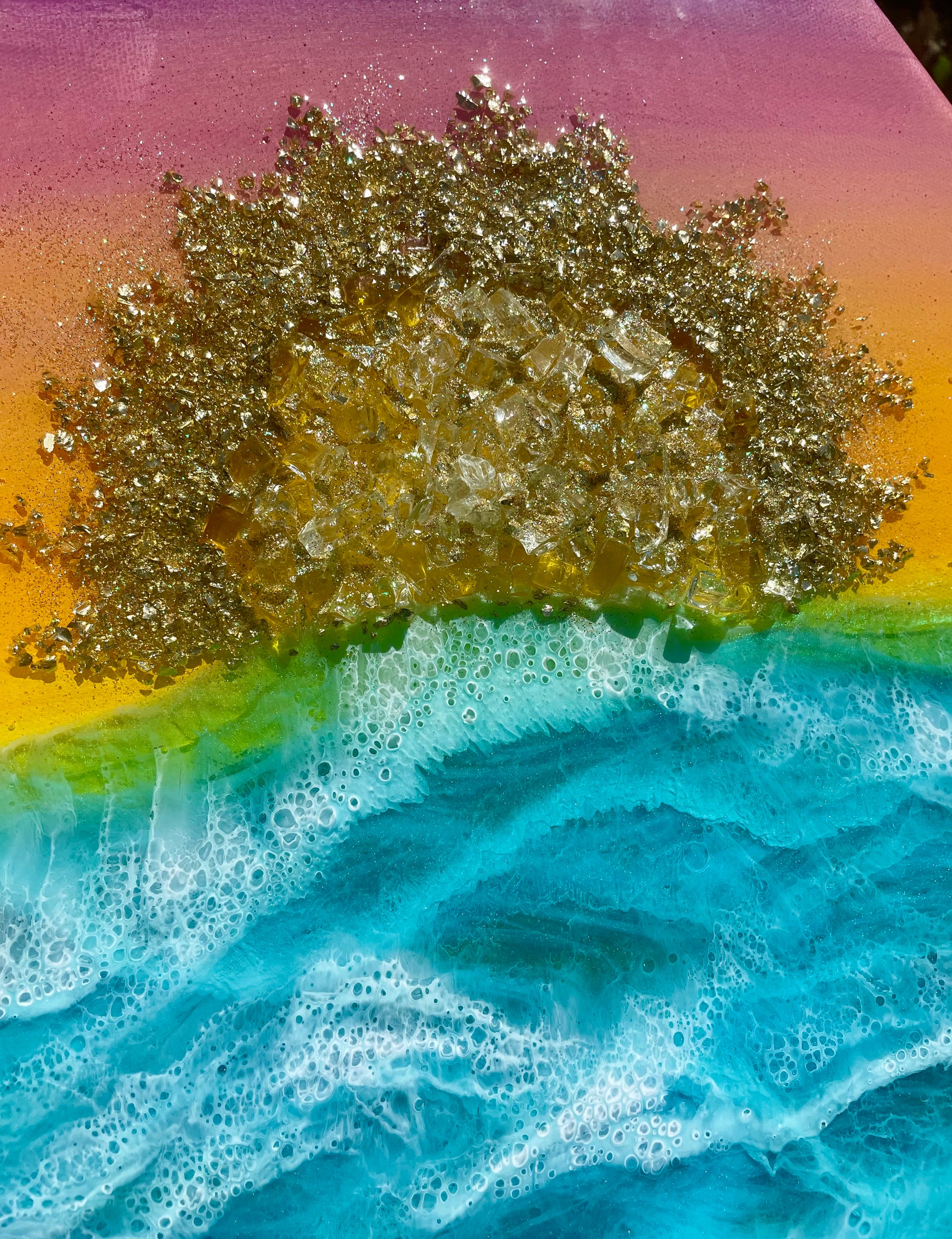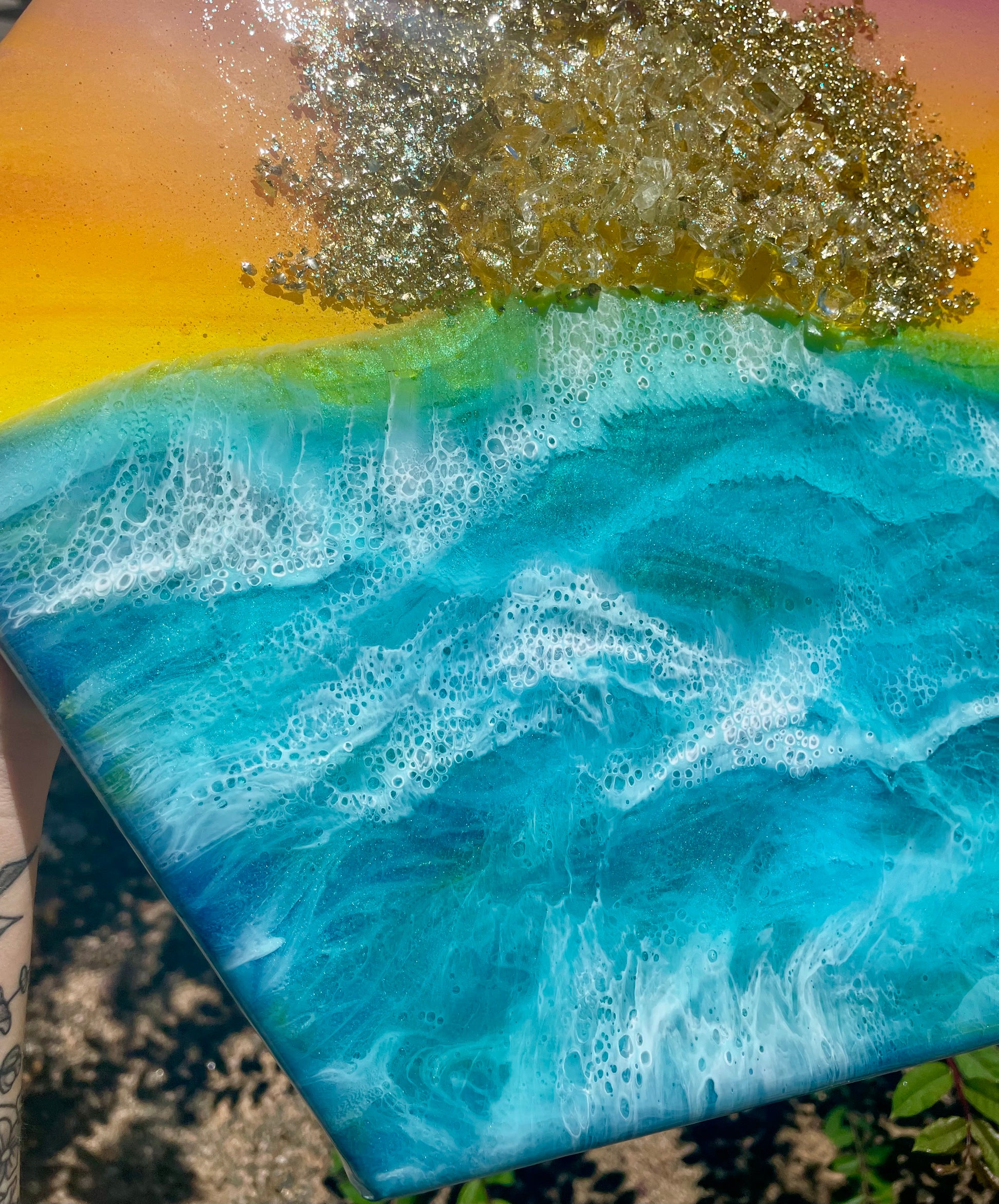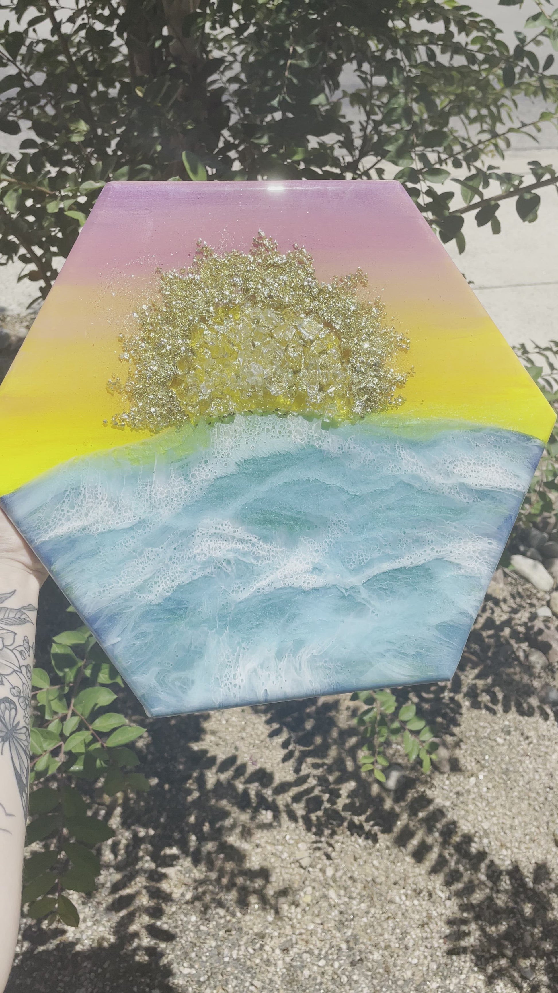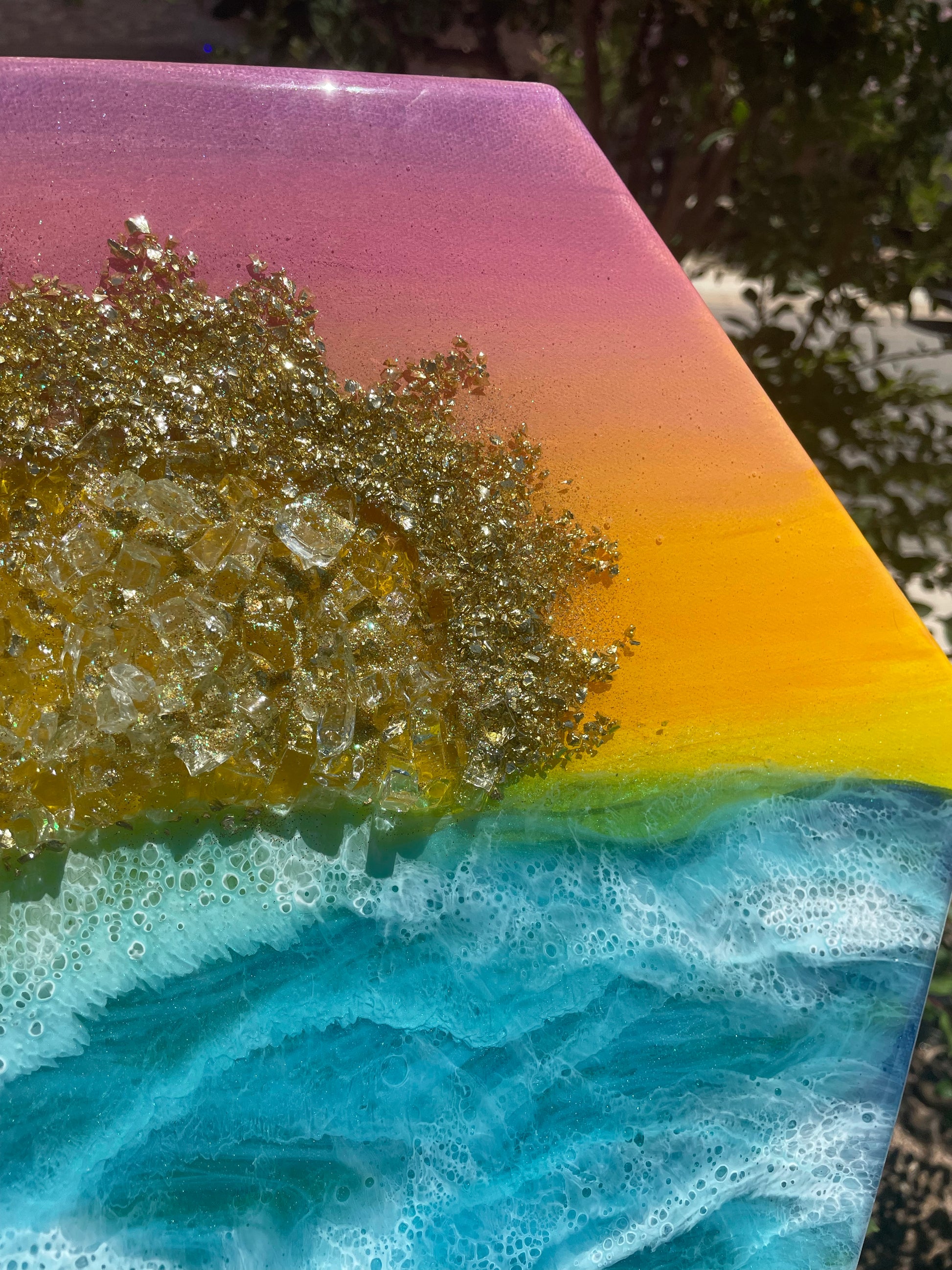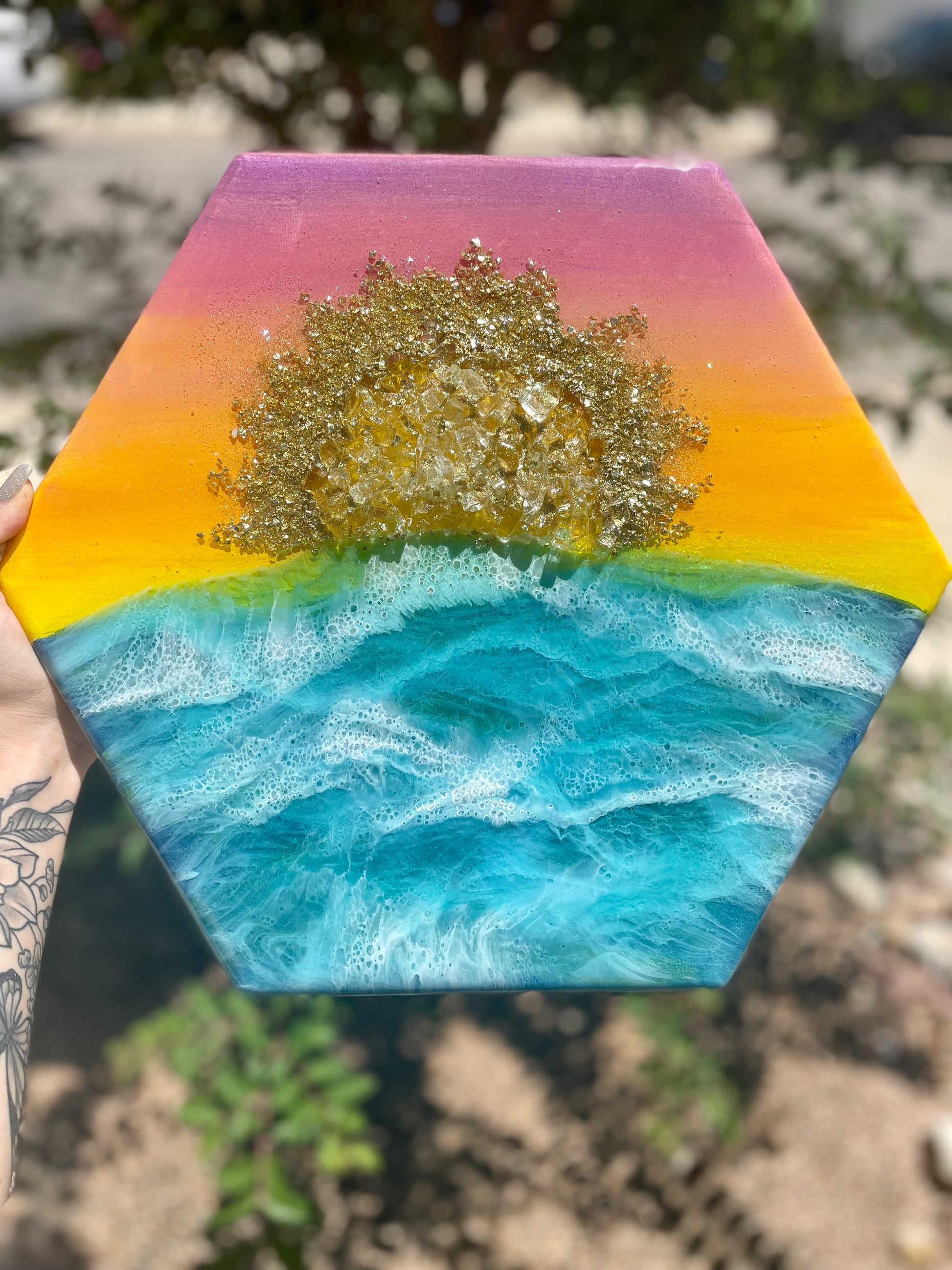 Sunset ocean inspired resin art on a 15” hexagon canvas. This piece also has a textured sun, I decided to make the sun pop with faux rocks, glitter & gold flakes; truly capturing your attention with its beauty.