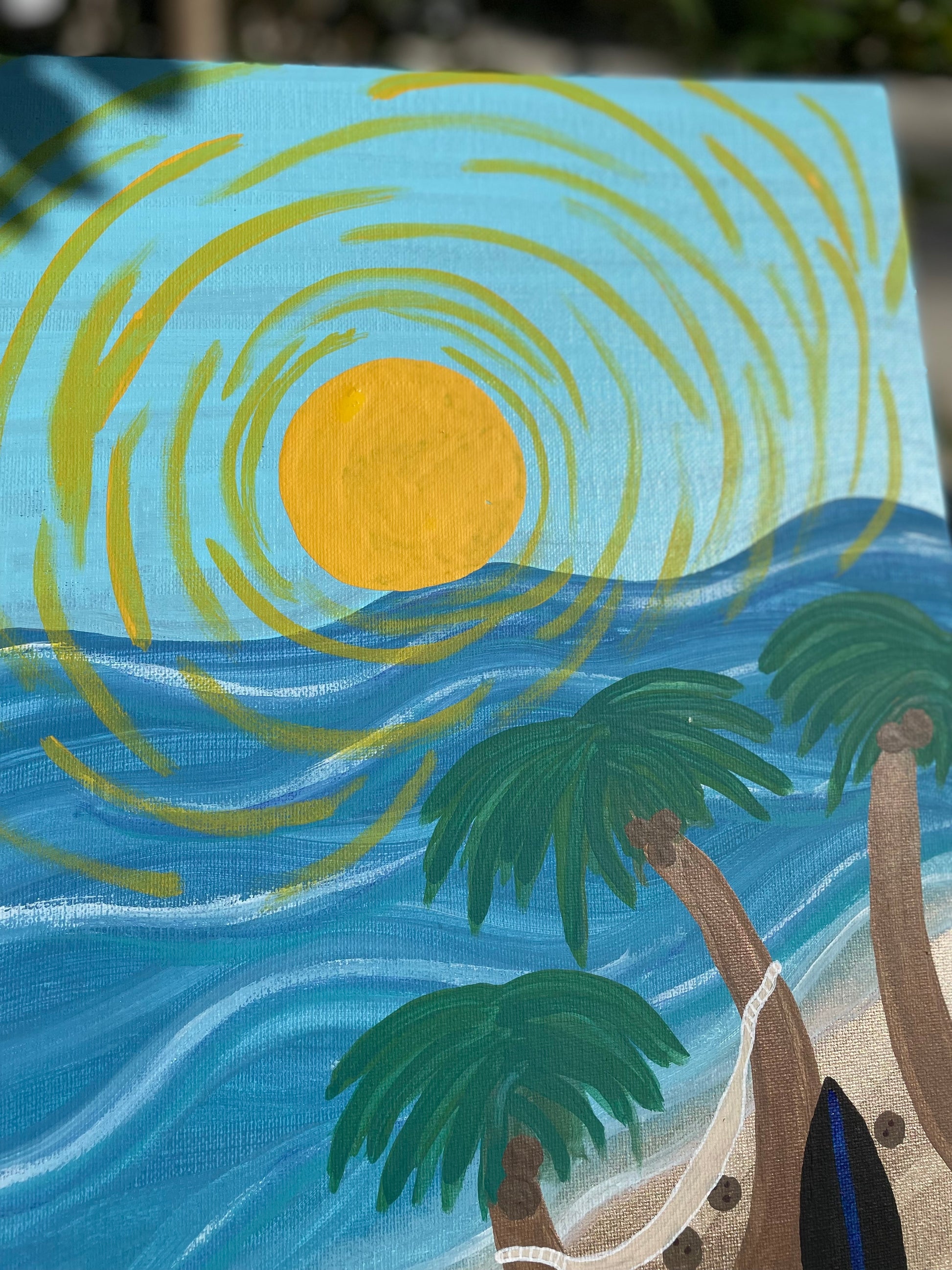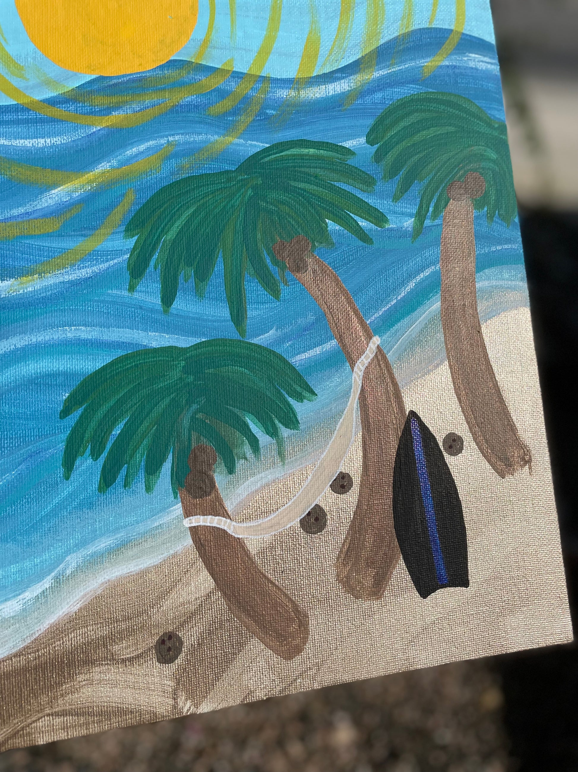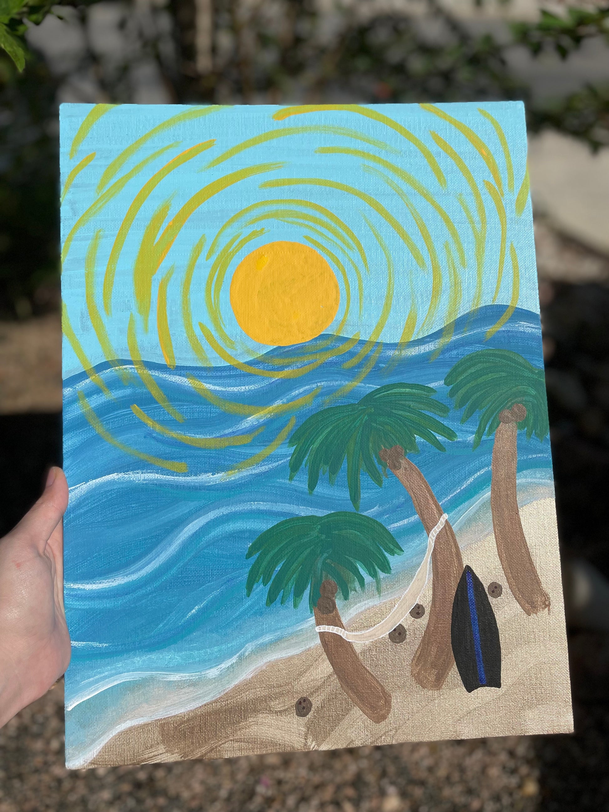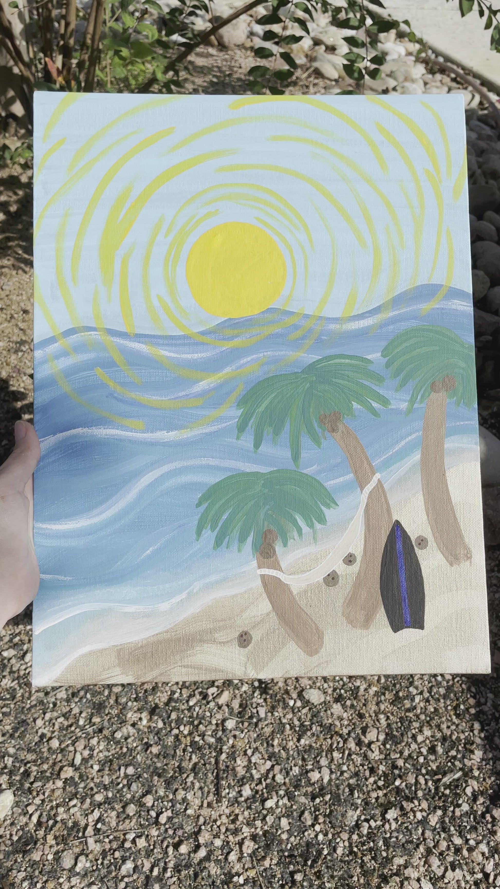 12x16 acrylic painting of a sunshine beach day. This beachy piece includes palm trees, coconuts, a hammock, a surfboard & an abstract sun.