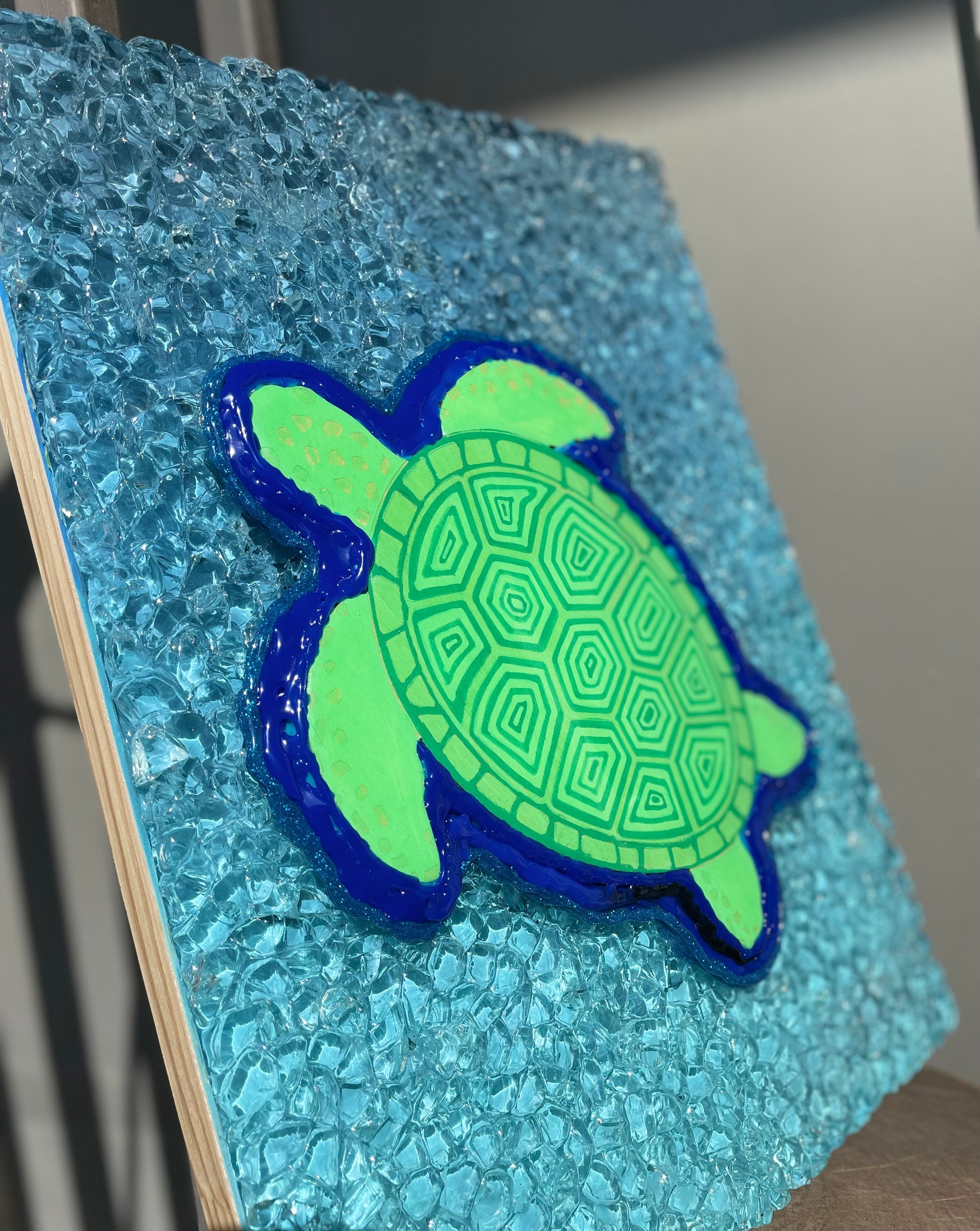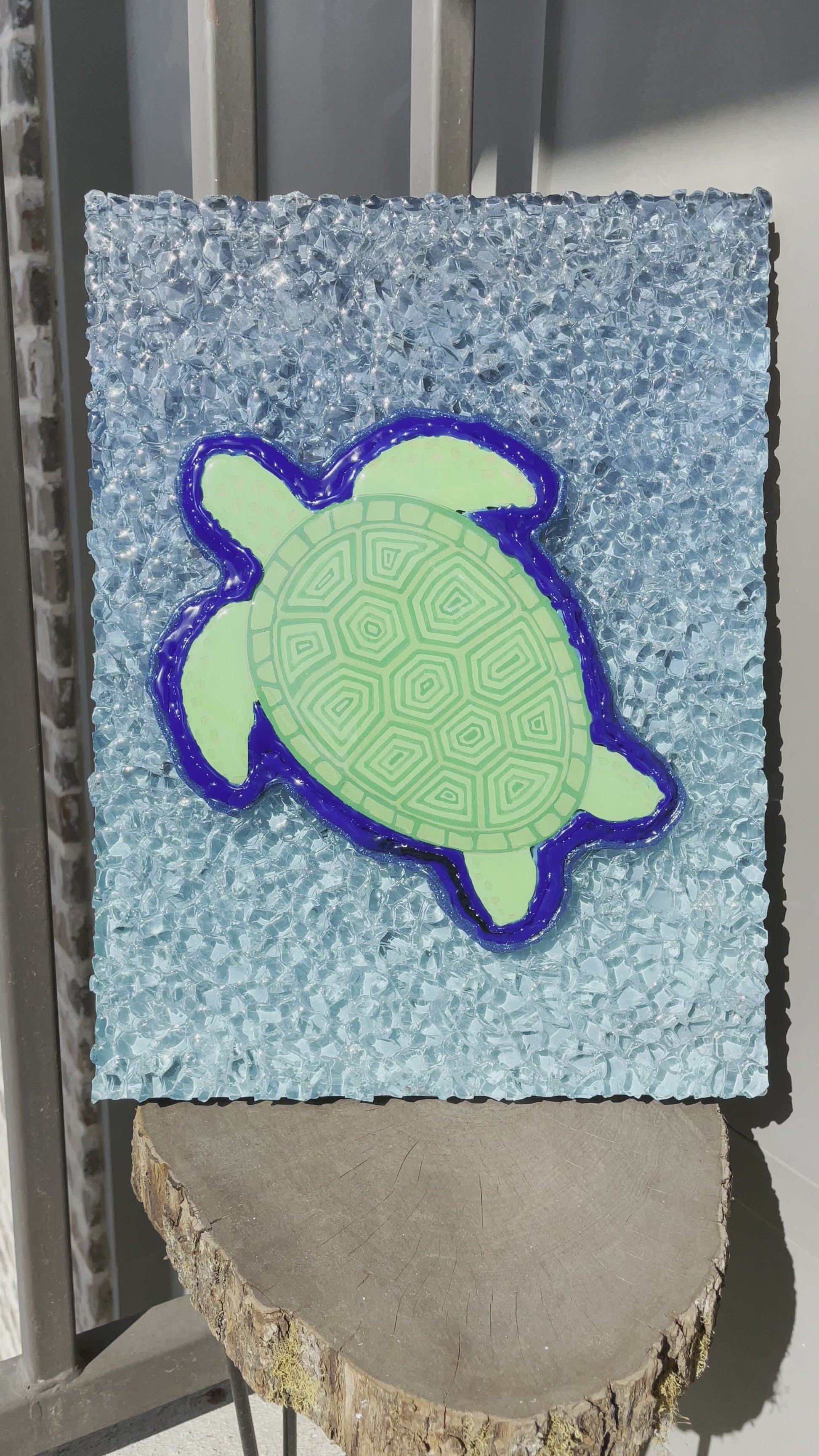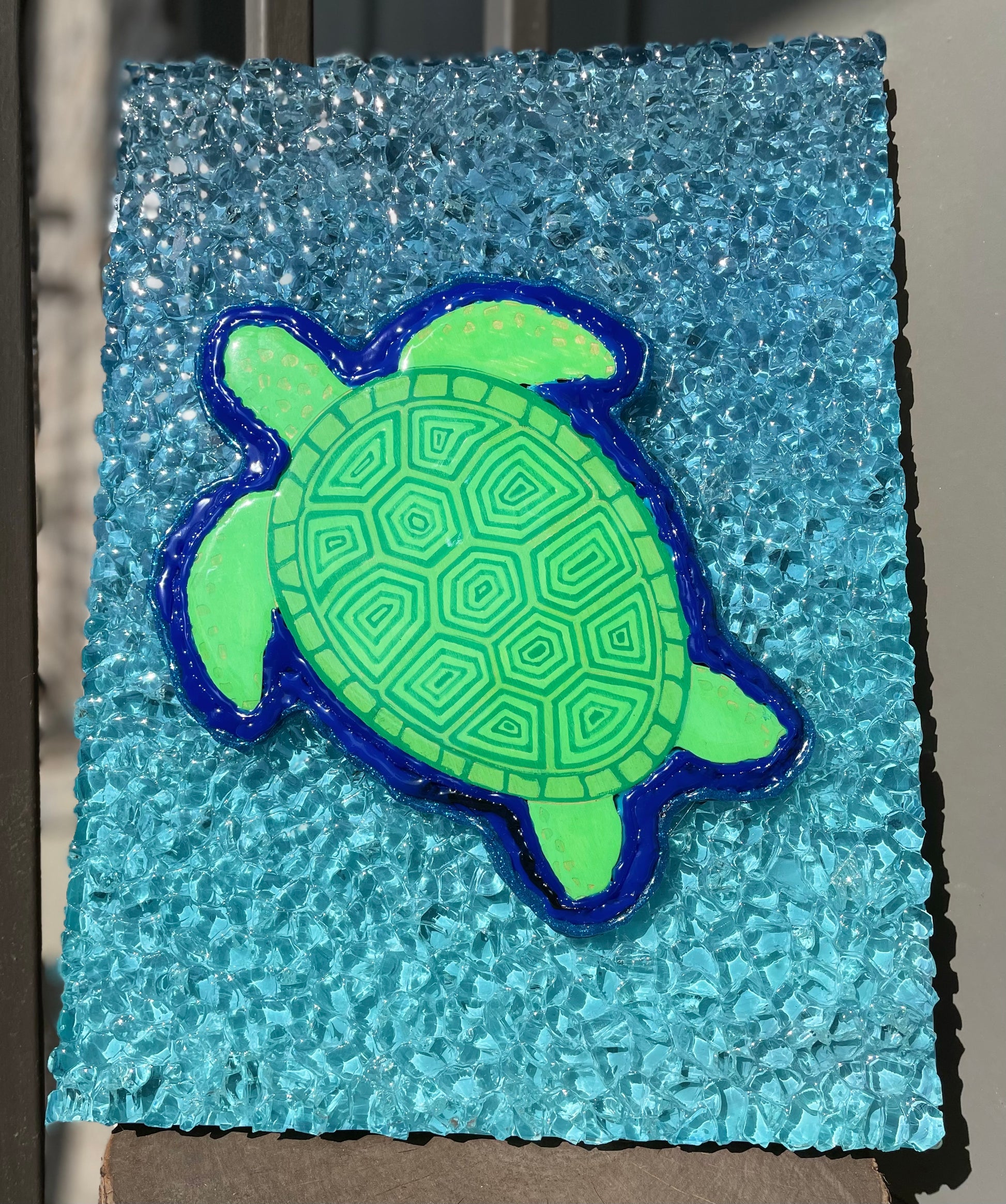 This piece has a painted ocean colored background with clear crushed (mosaic styled) glass shards laying on top. At the top of the glass there is a turtle with hand drawn shapes, rimmed in blue.