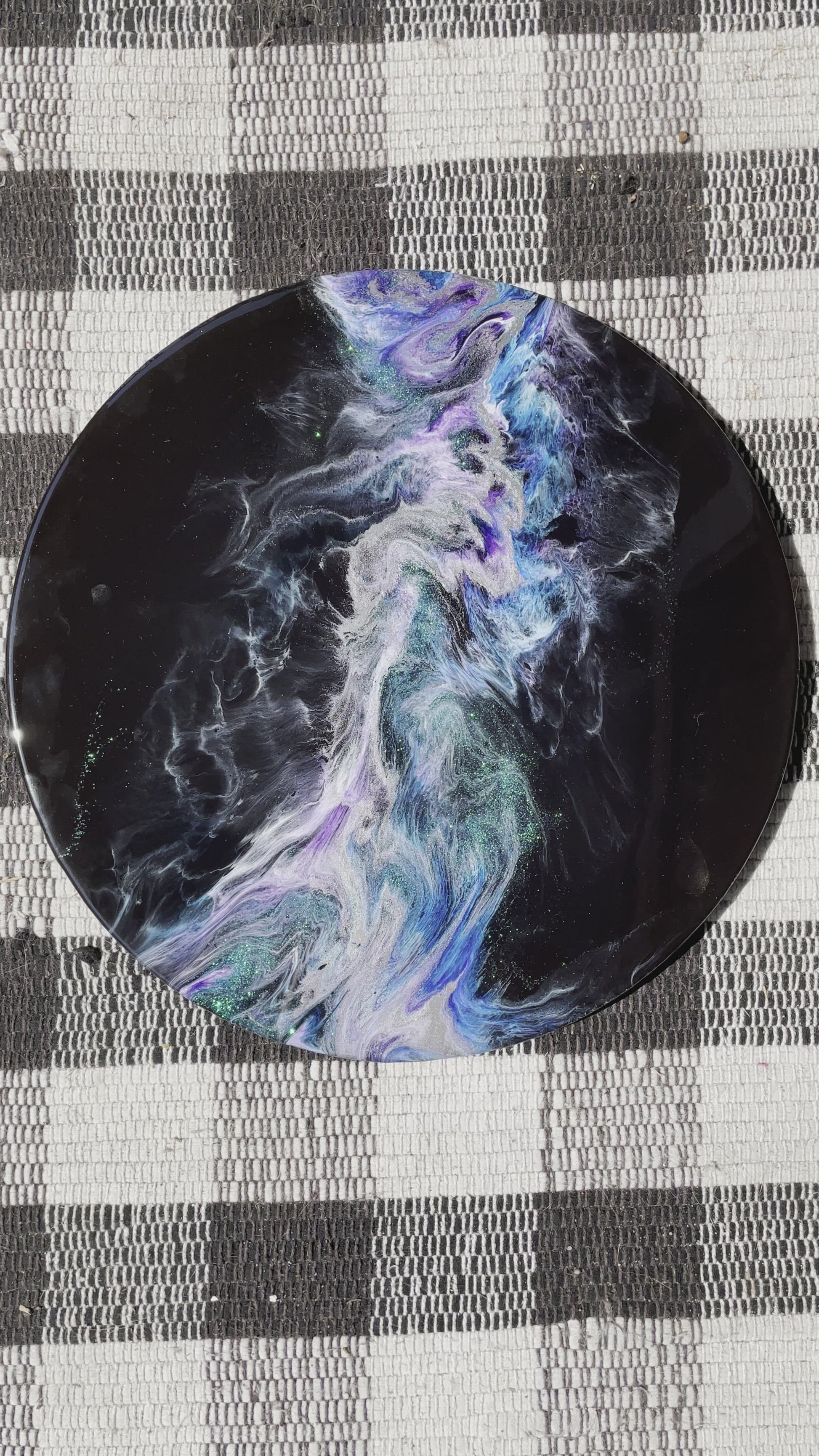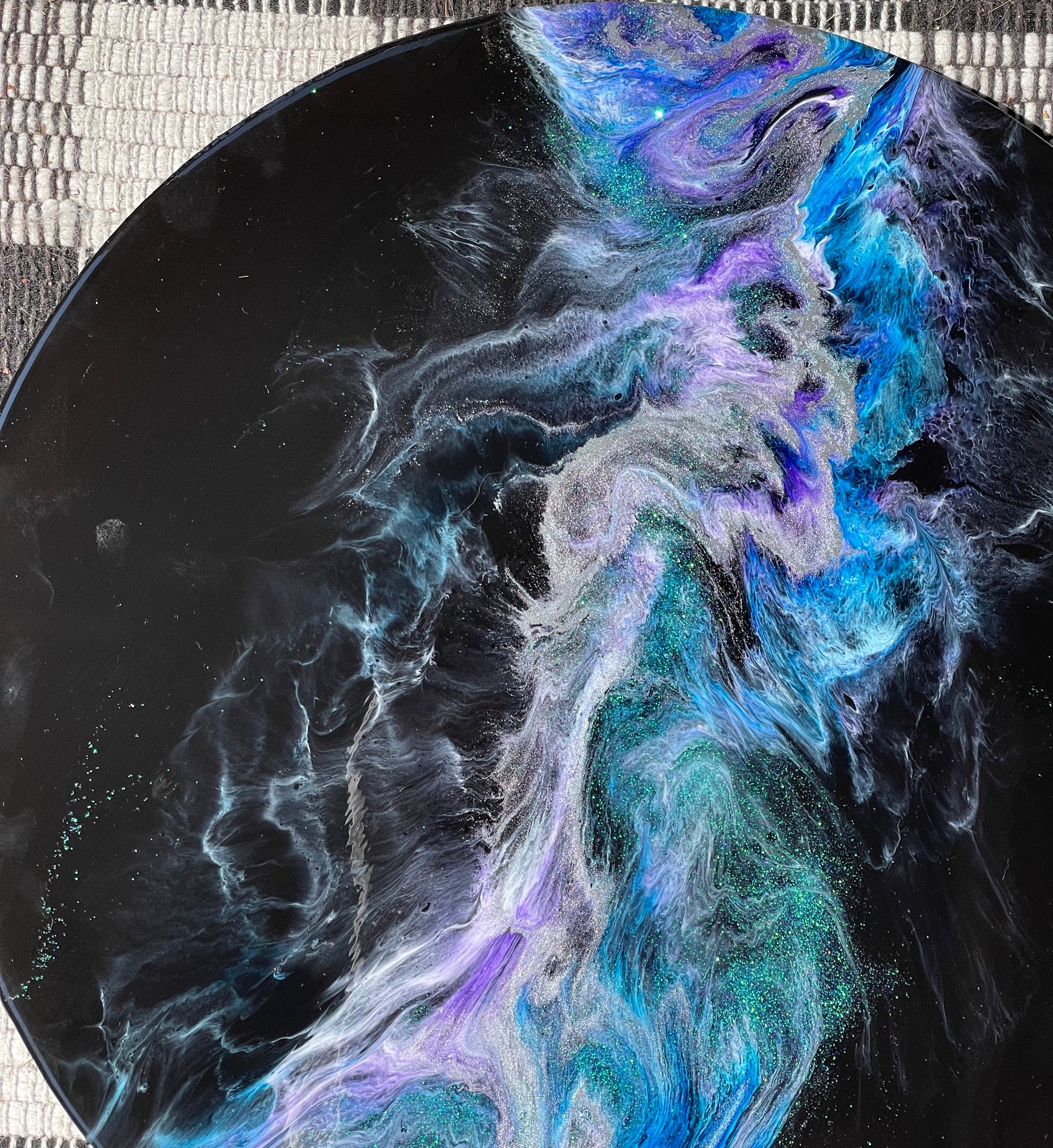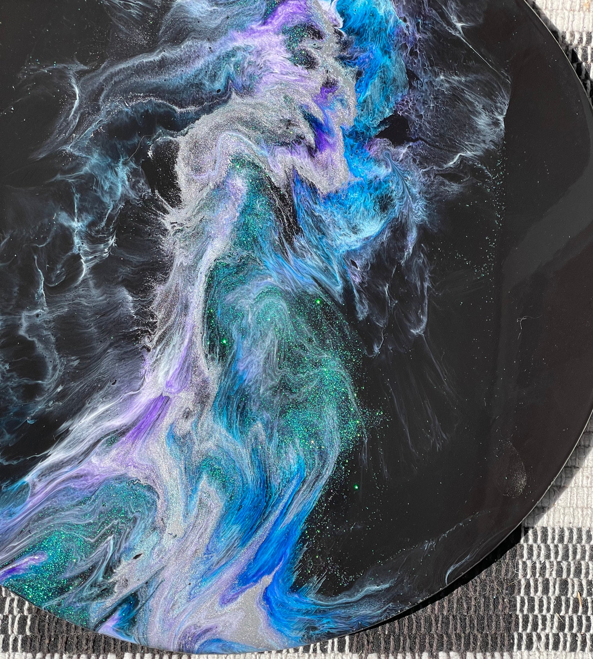 This abstract piece is on a 14” round wood canvas with 1/2 inch sides (painted black). On top of the black painted background there is a wispy layer of blue, purple, white, metallic silver and glitter.