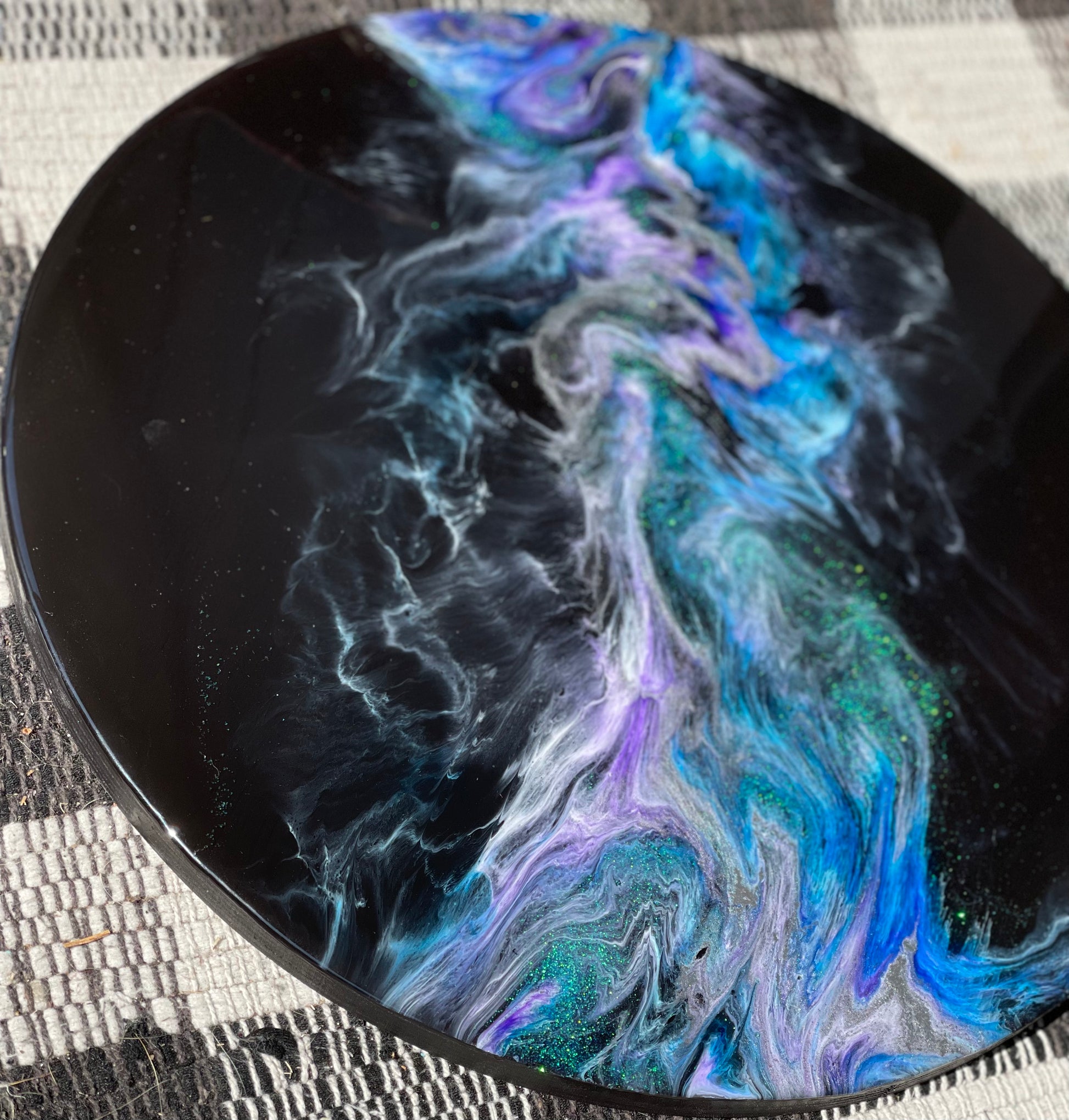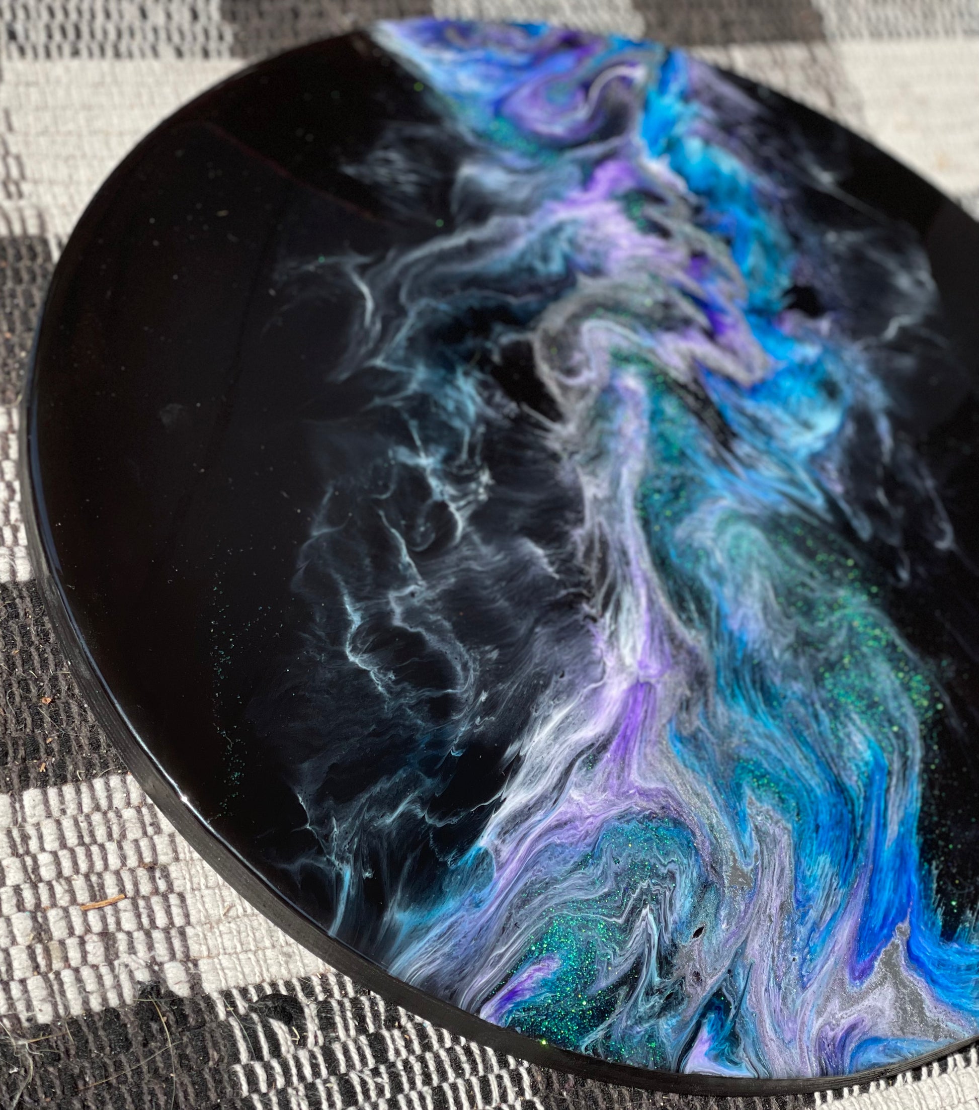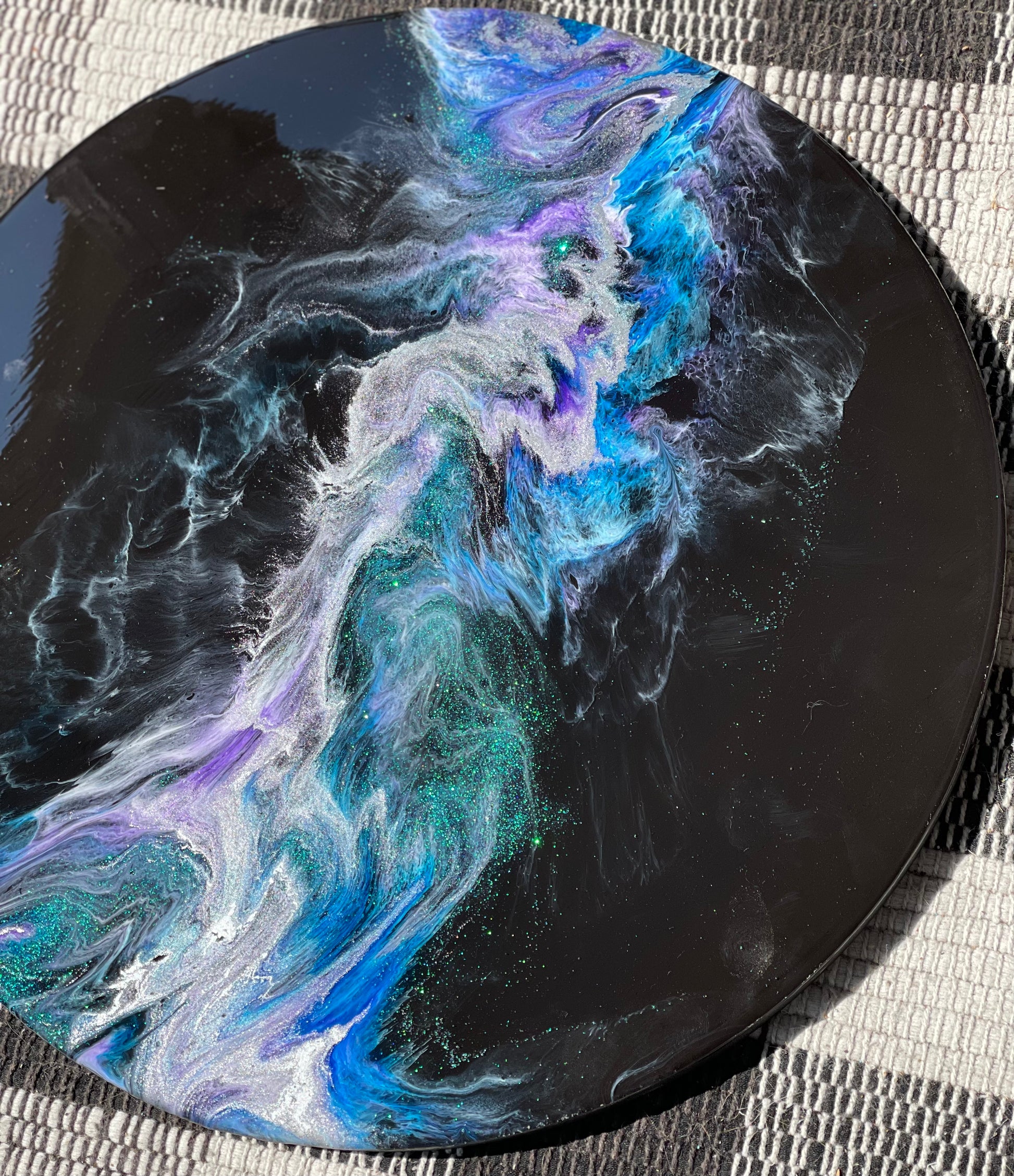 This abstract piece is on a 14” round wood canvas with 1/2 inch sides (painted black). On top of the black painted background there is a wispy layer of blue, purple, white, metallic silver and glitter.