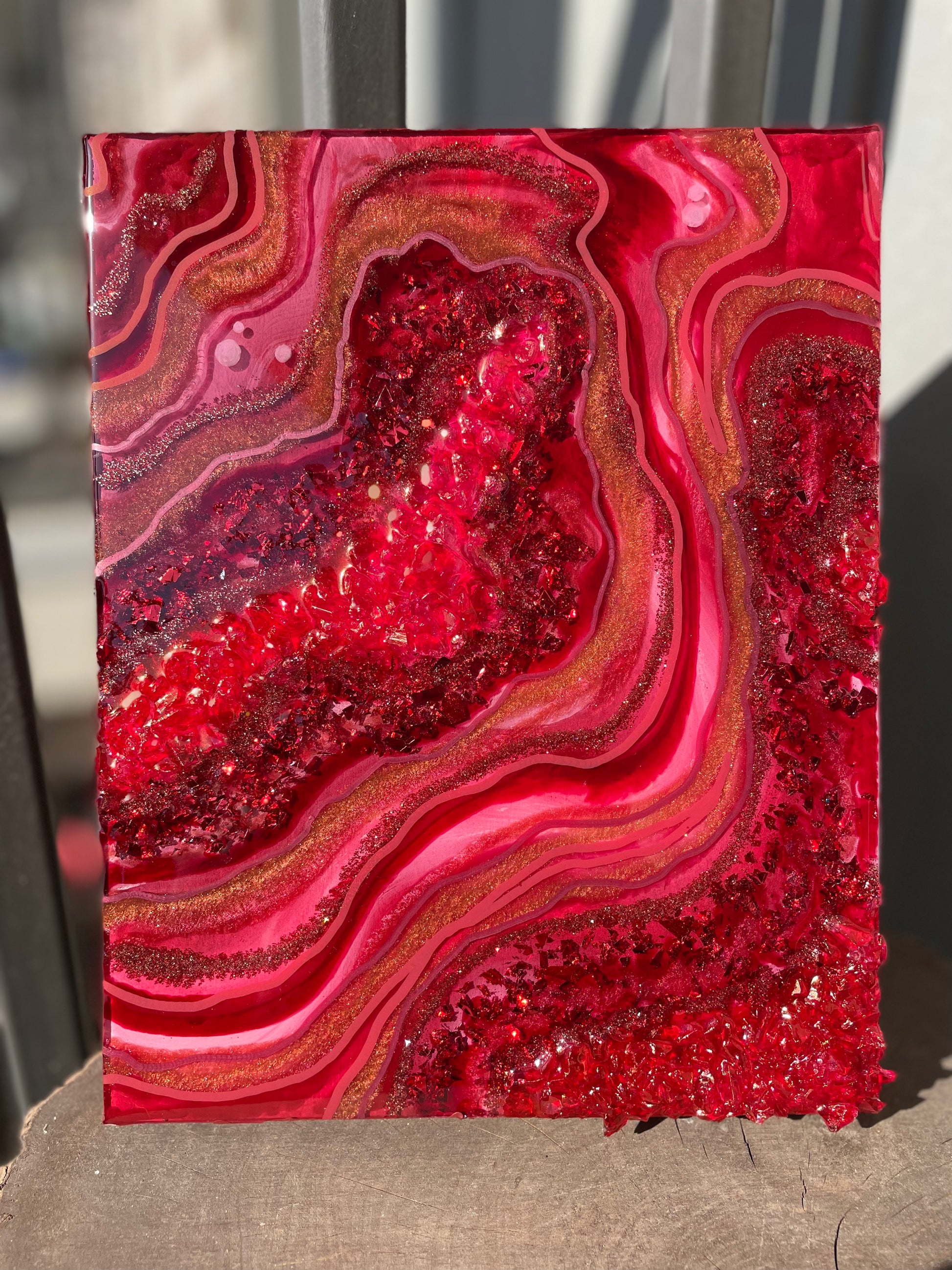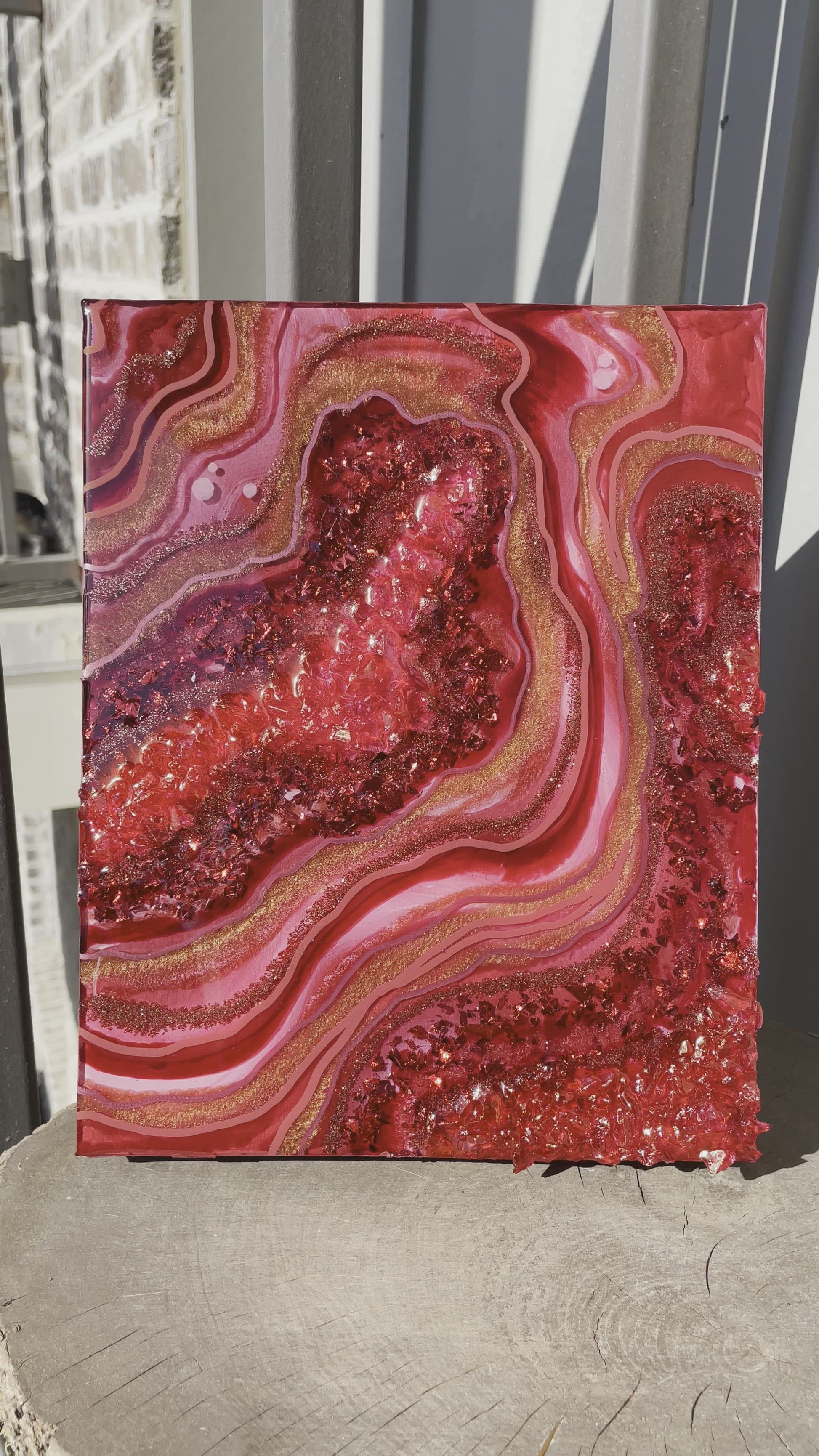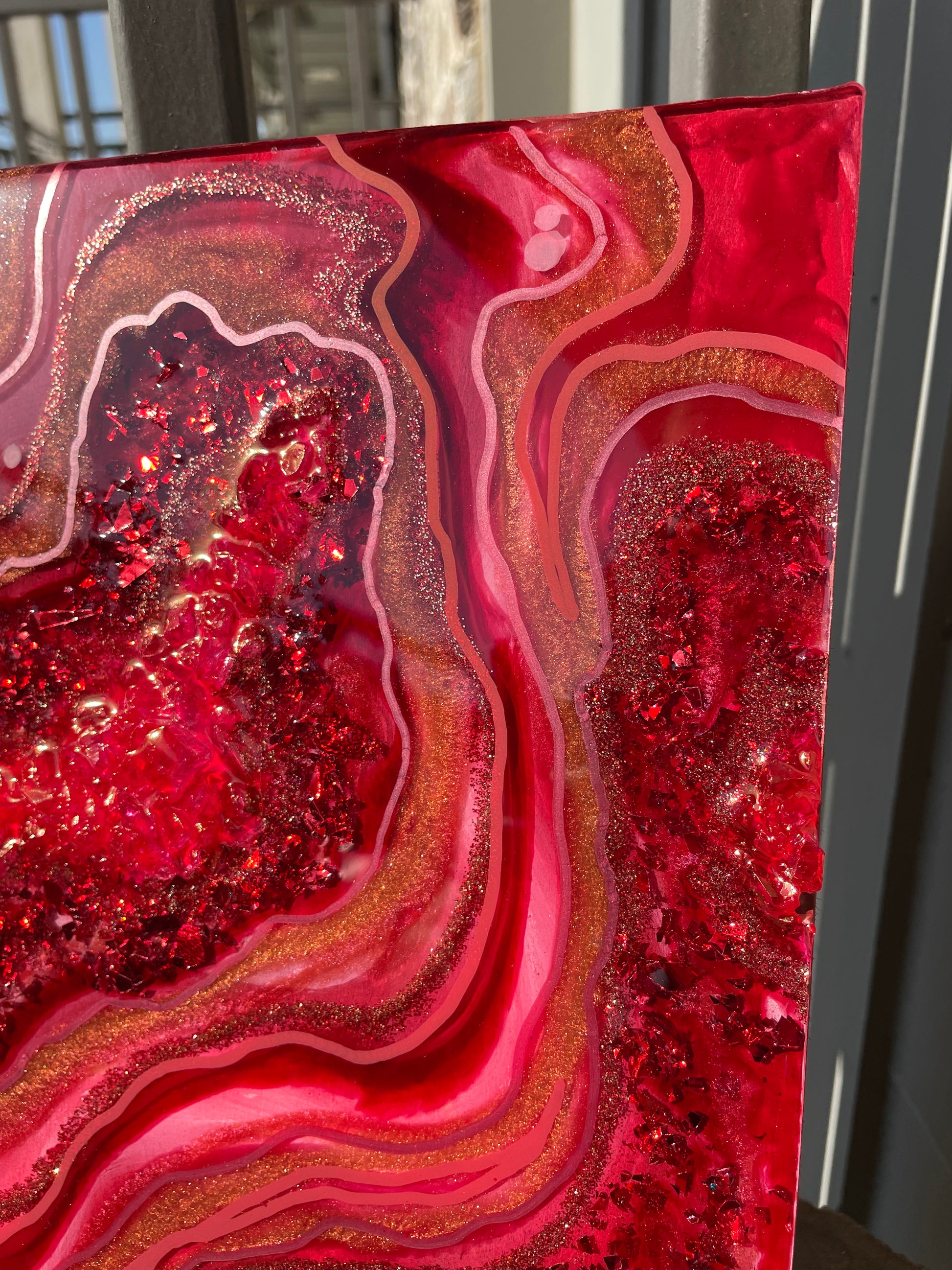 A ruby red geode slice recreation on an 8x10 inch canvas with 1/2 inch red painted sides. This piece has a painted geode background in the first layer to give additional depth underneath the resin layer.