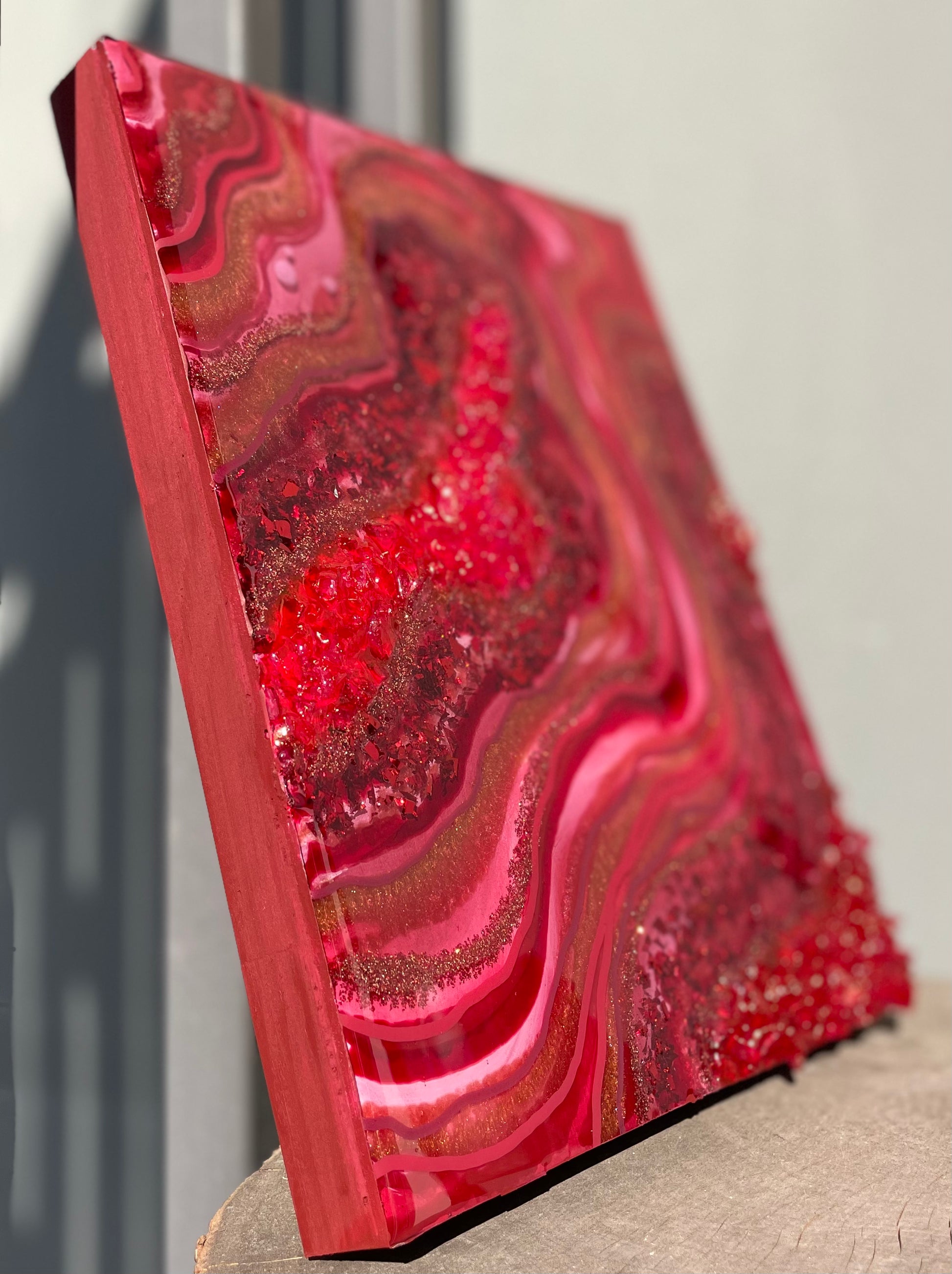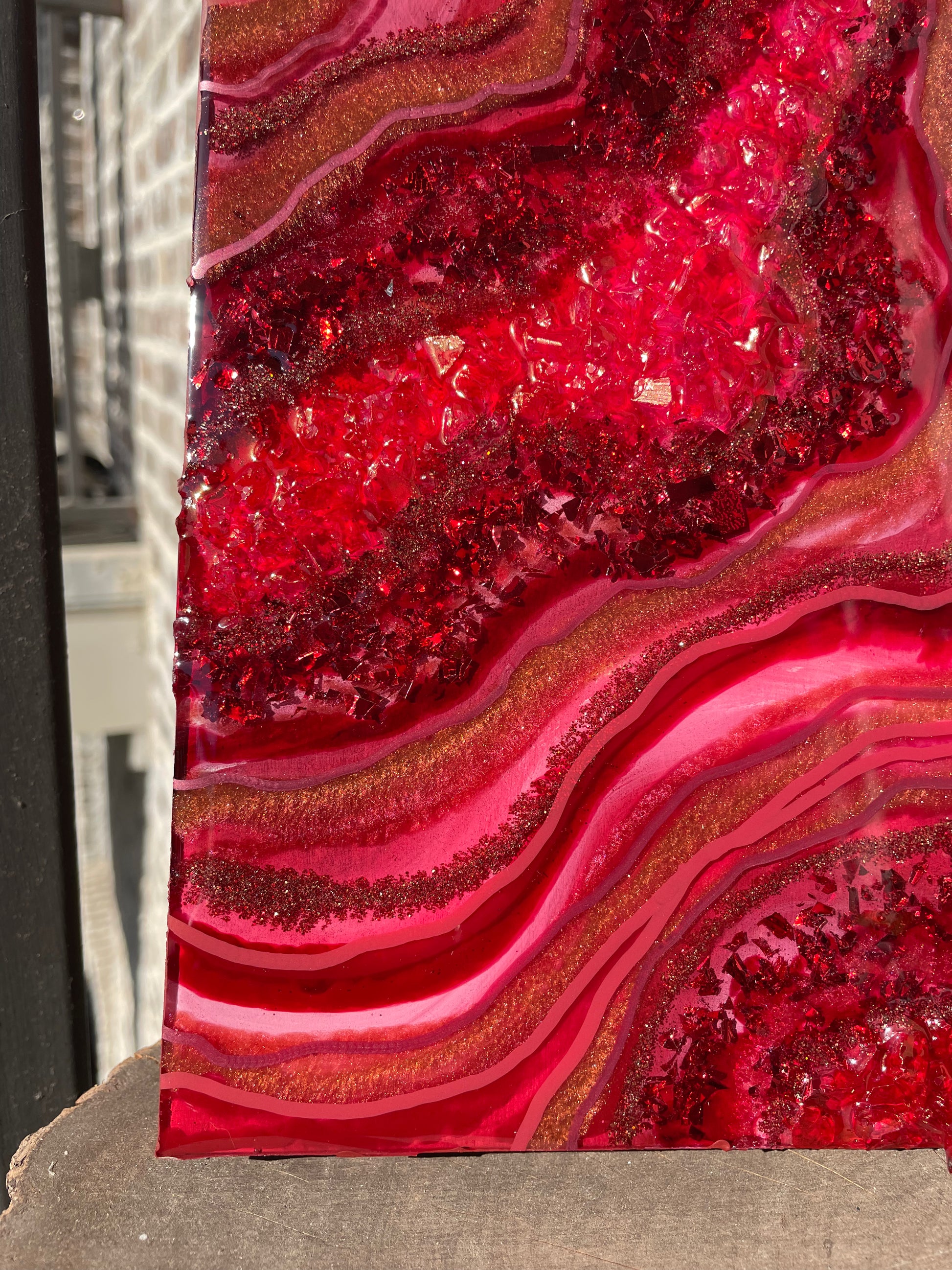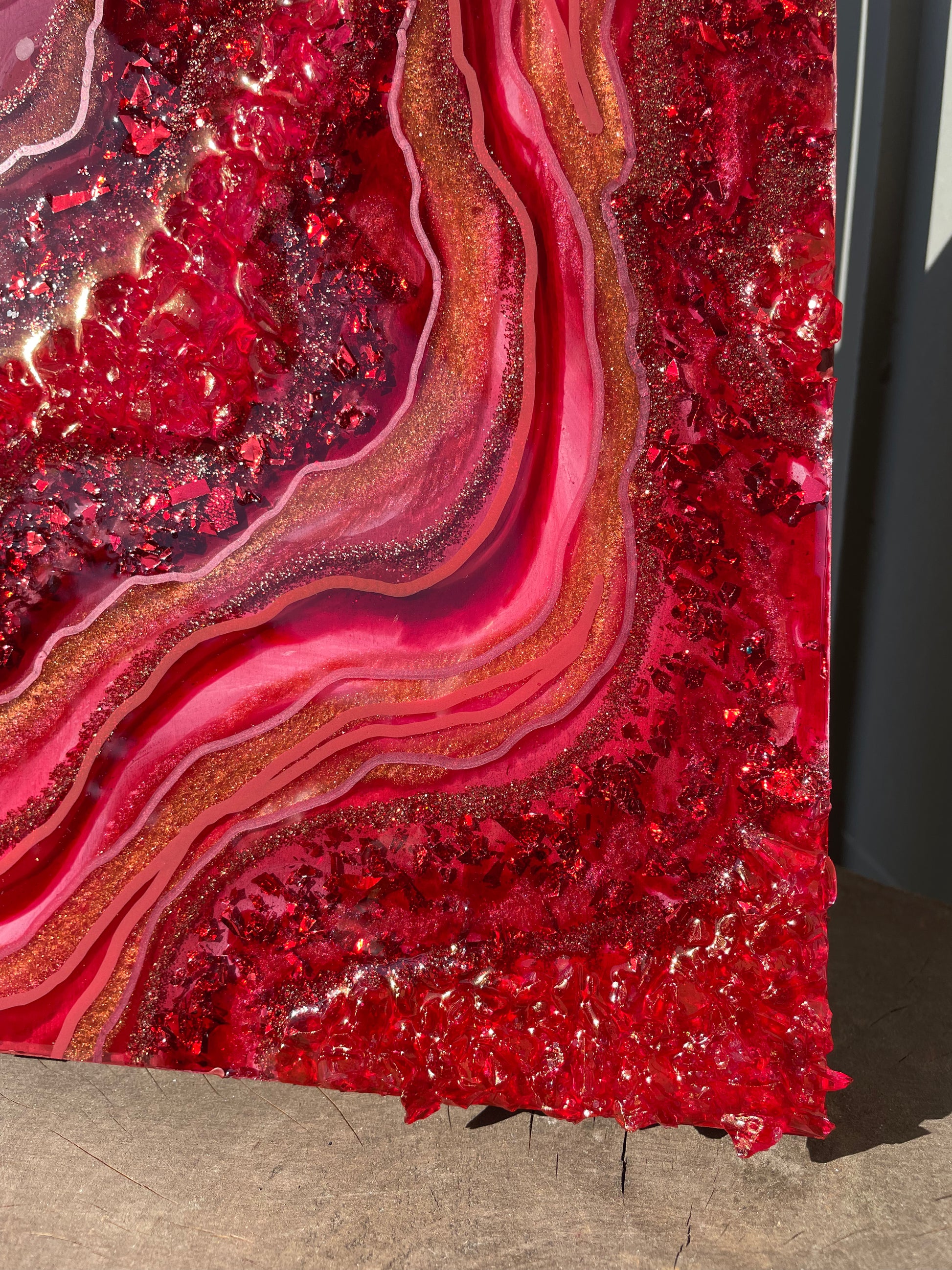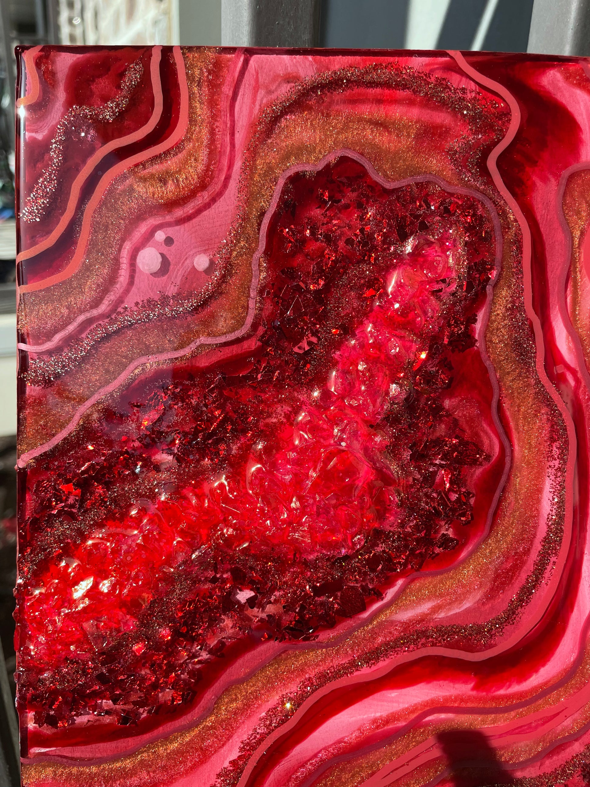 A ruby red geode slice recreation on an 8x10 inch canvas with 1/2 inch red painted sides. This piece has a painted geode background in the first layer to give additional depth underneath the resin layer.