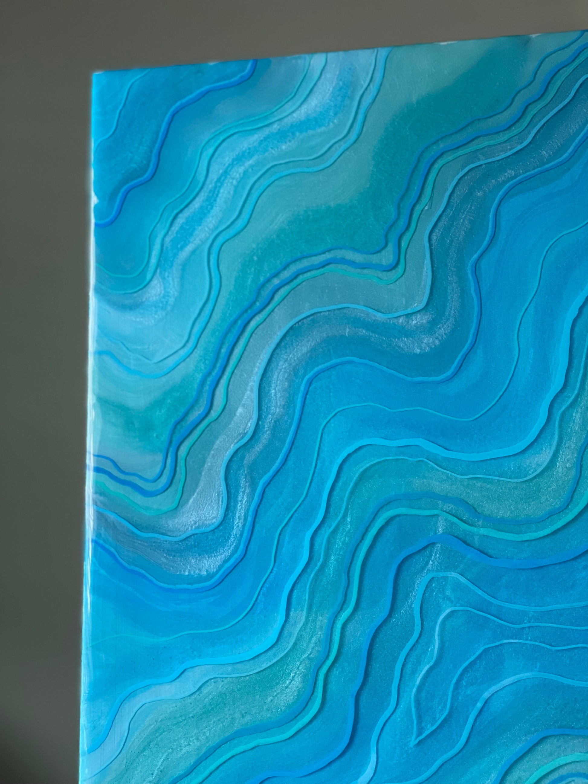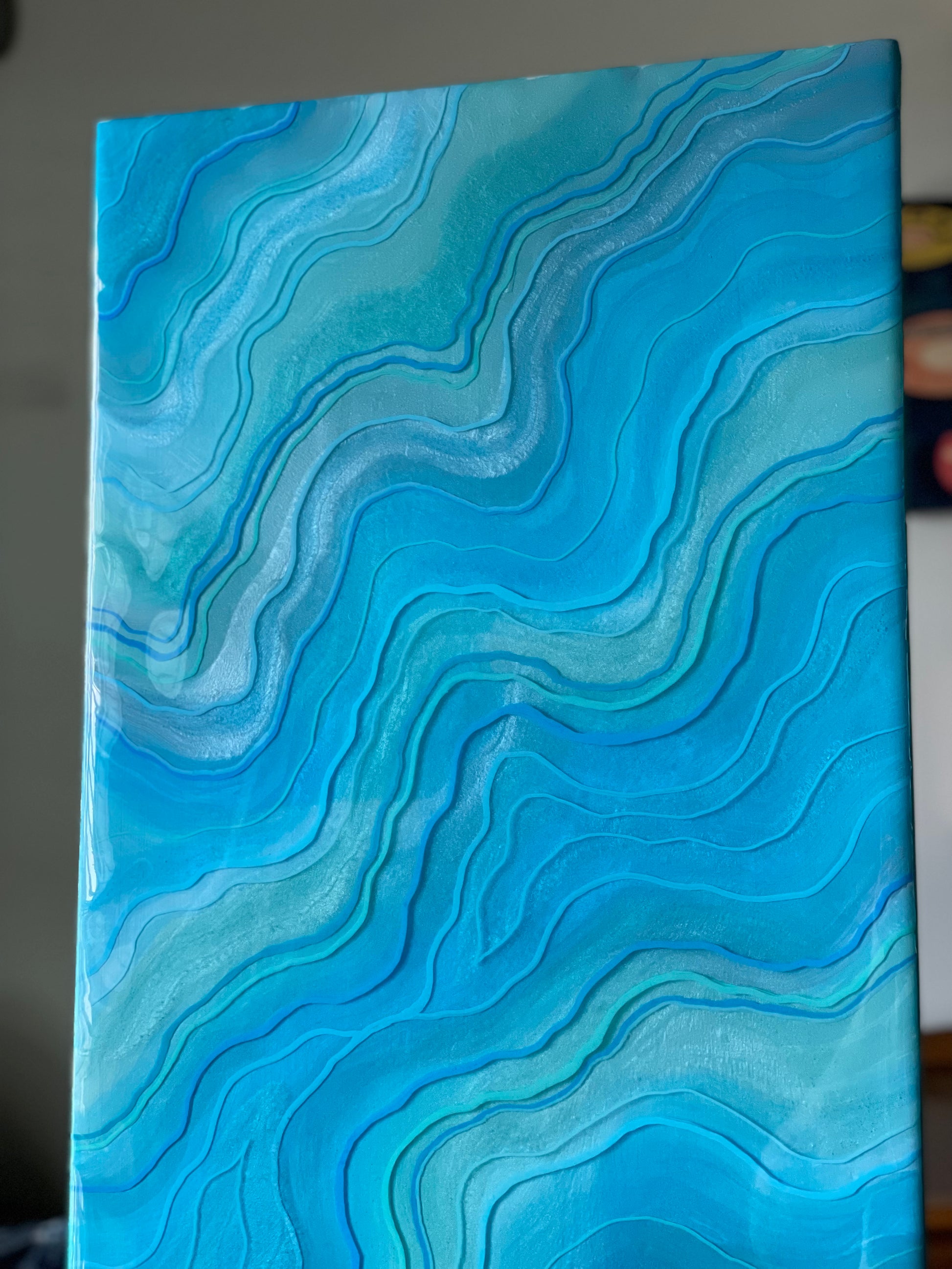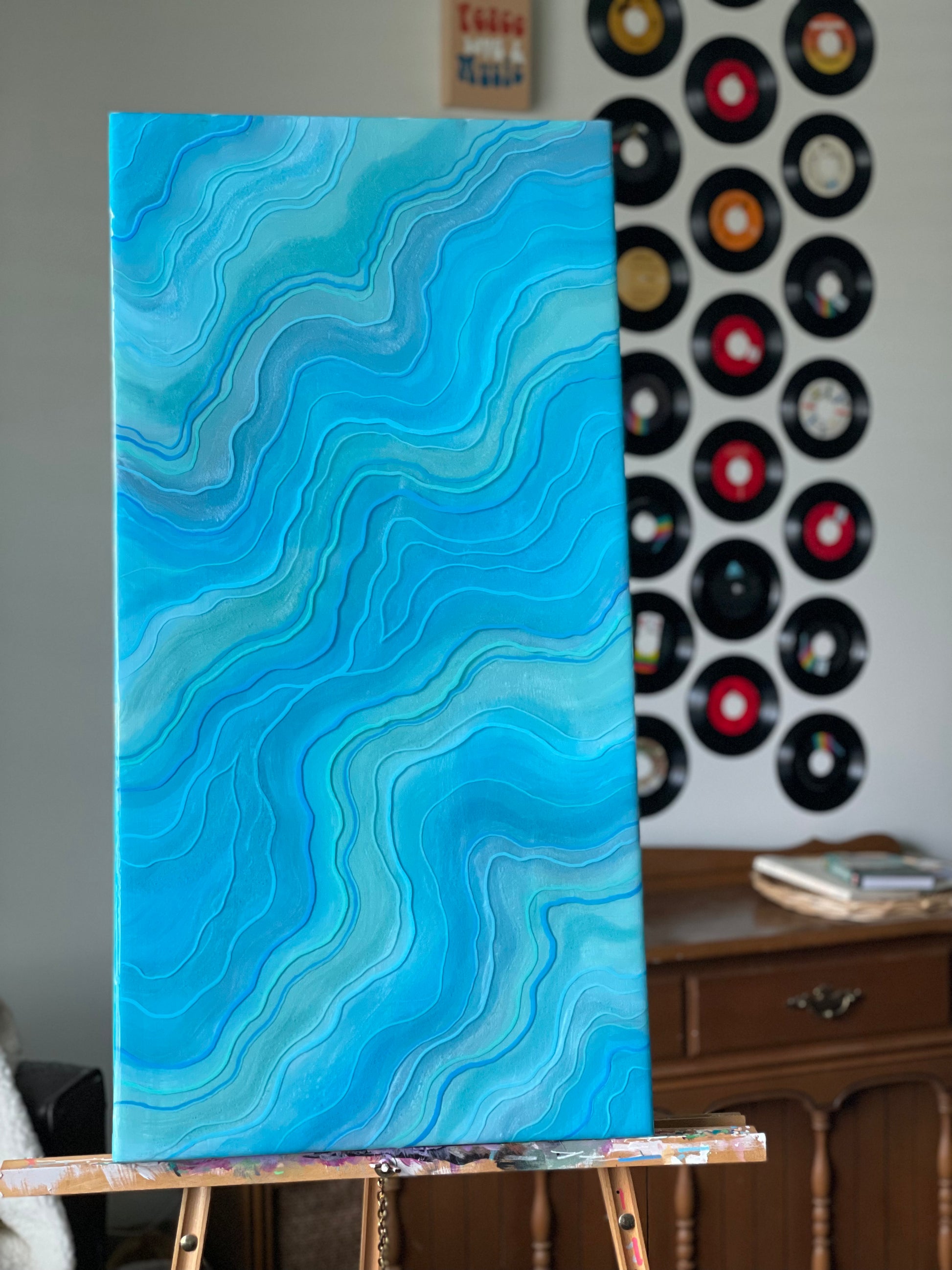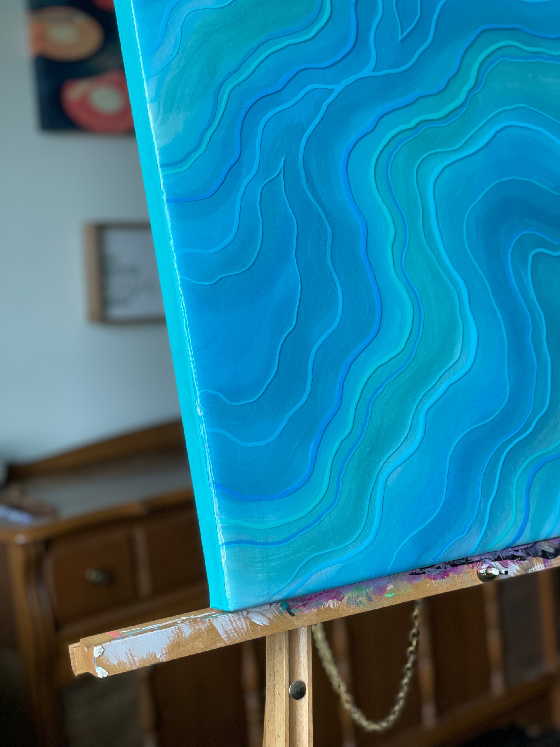15x30in. mixed media wall art; made with a painted geode background and pigmented resin on top to increase the amount of depth within this piece.