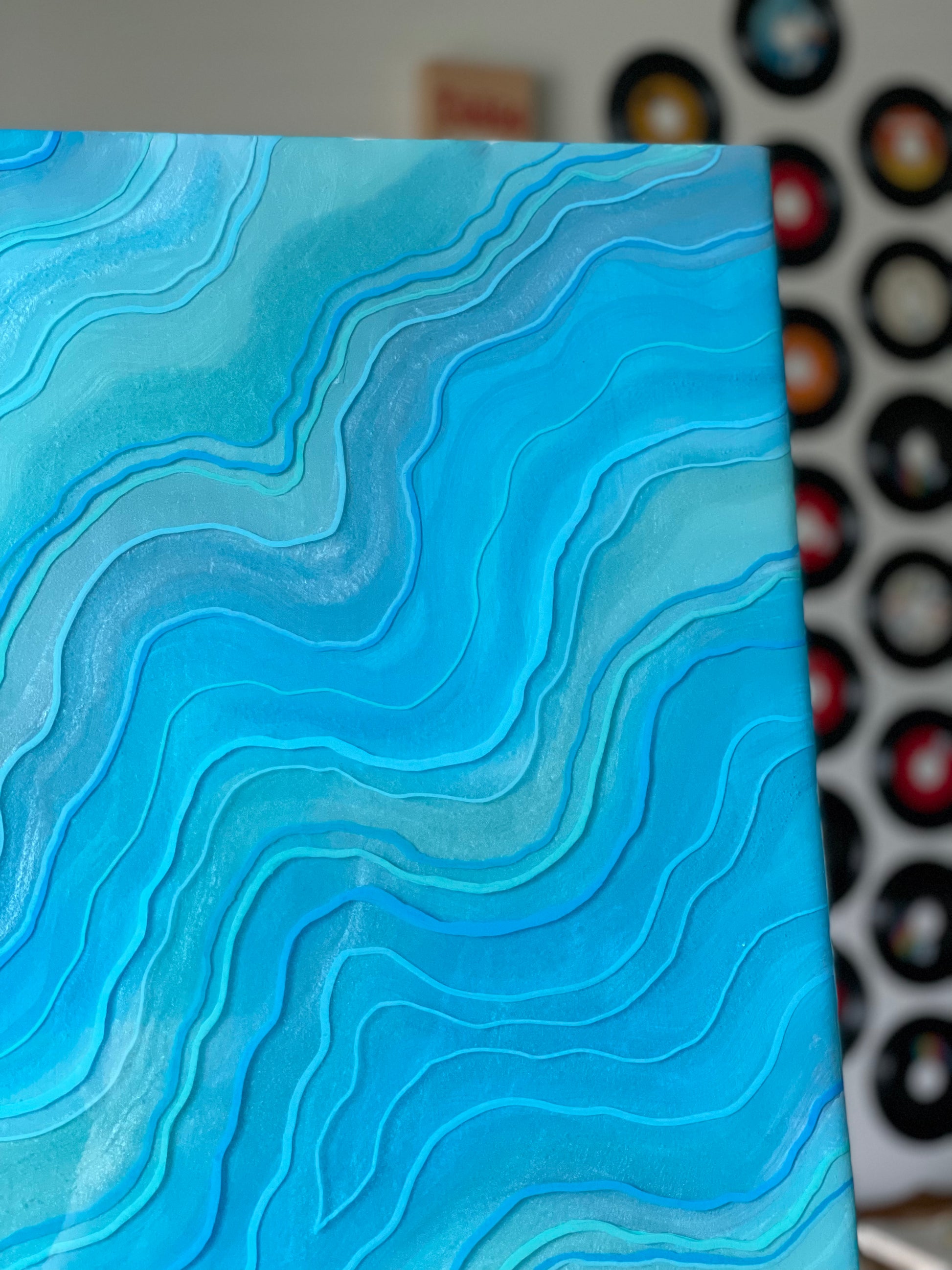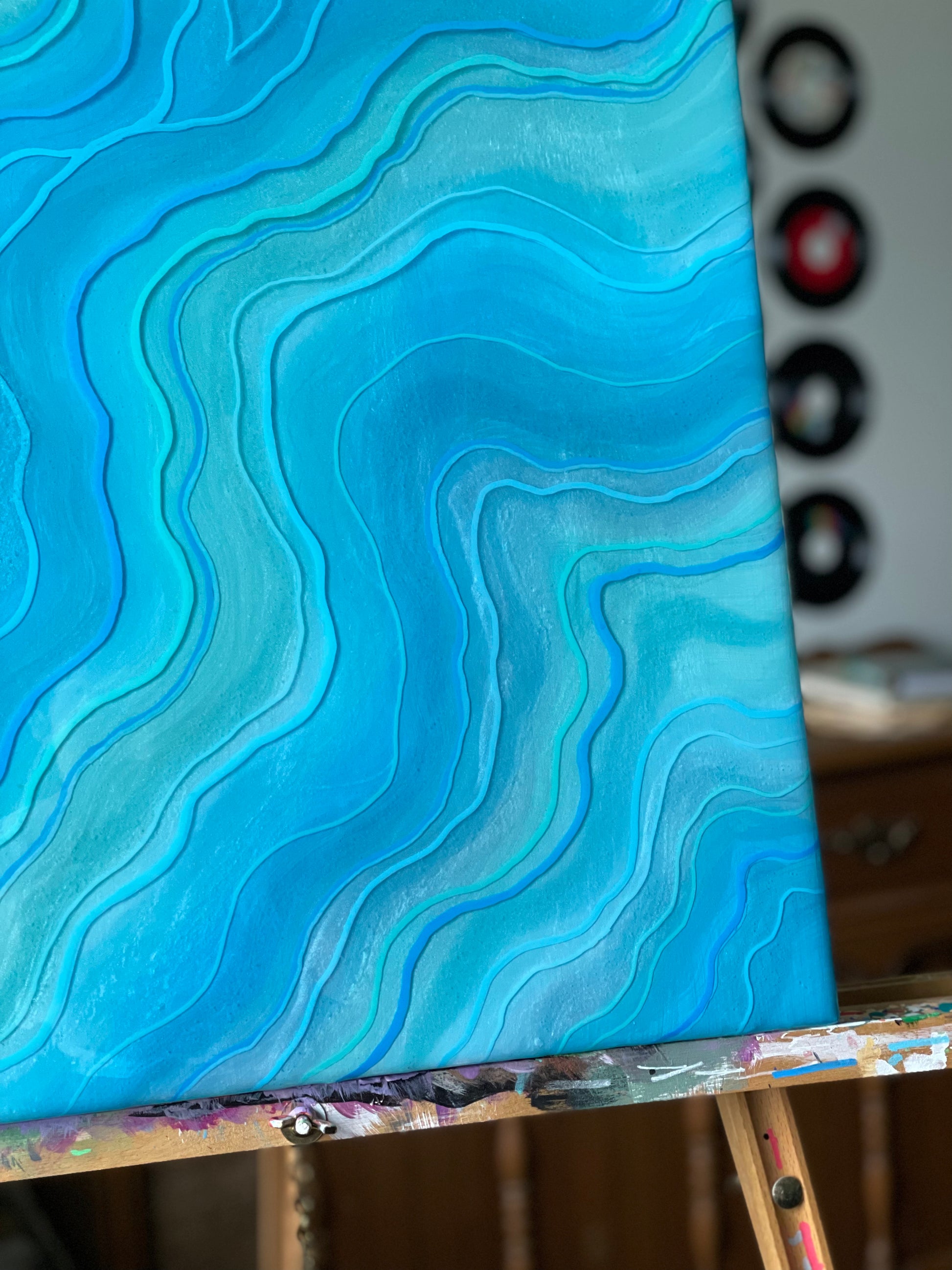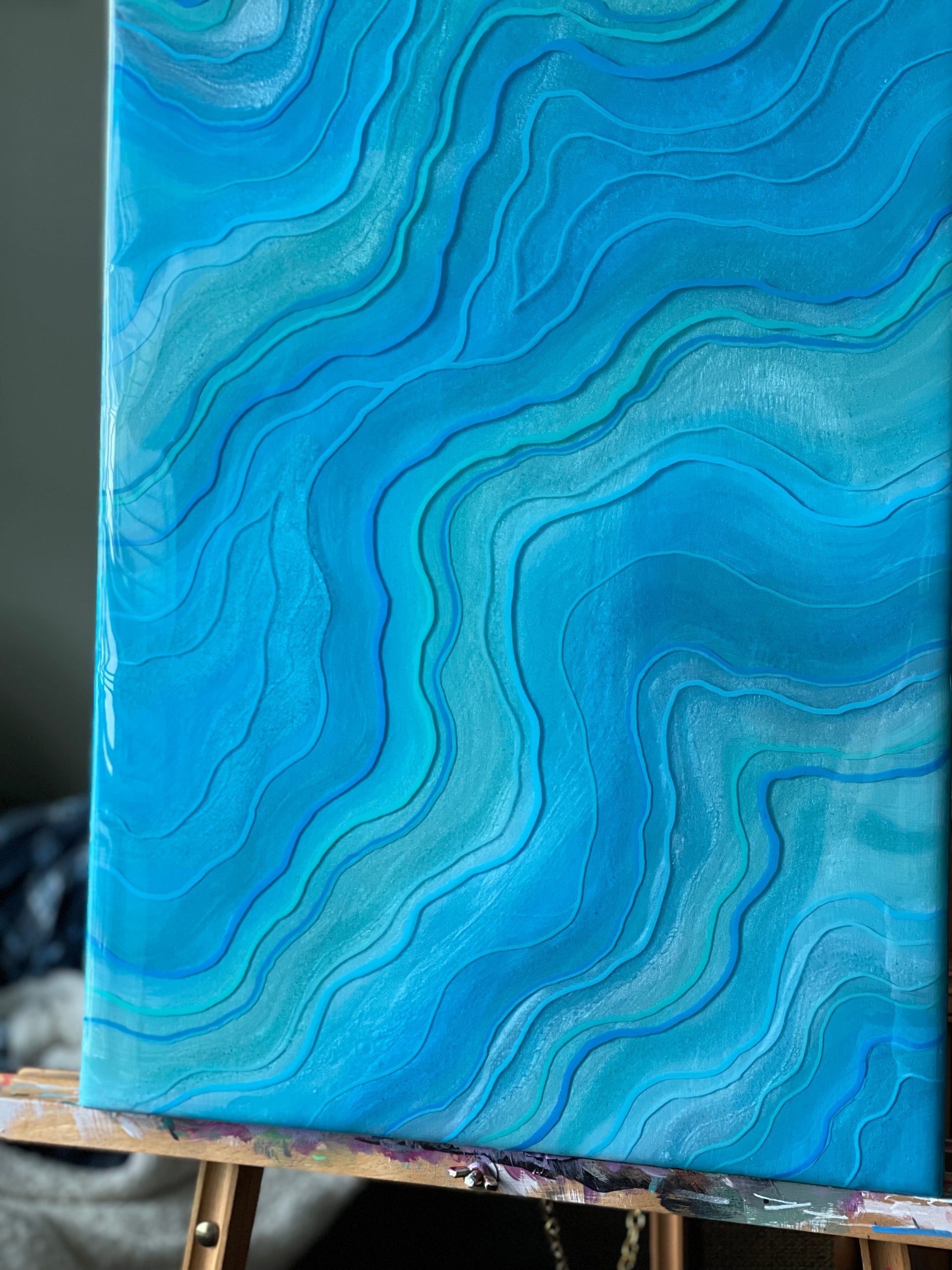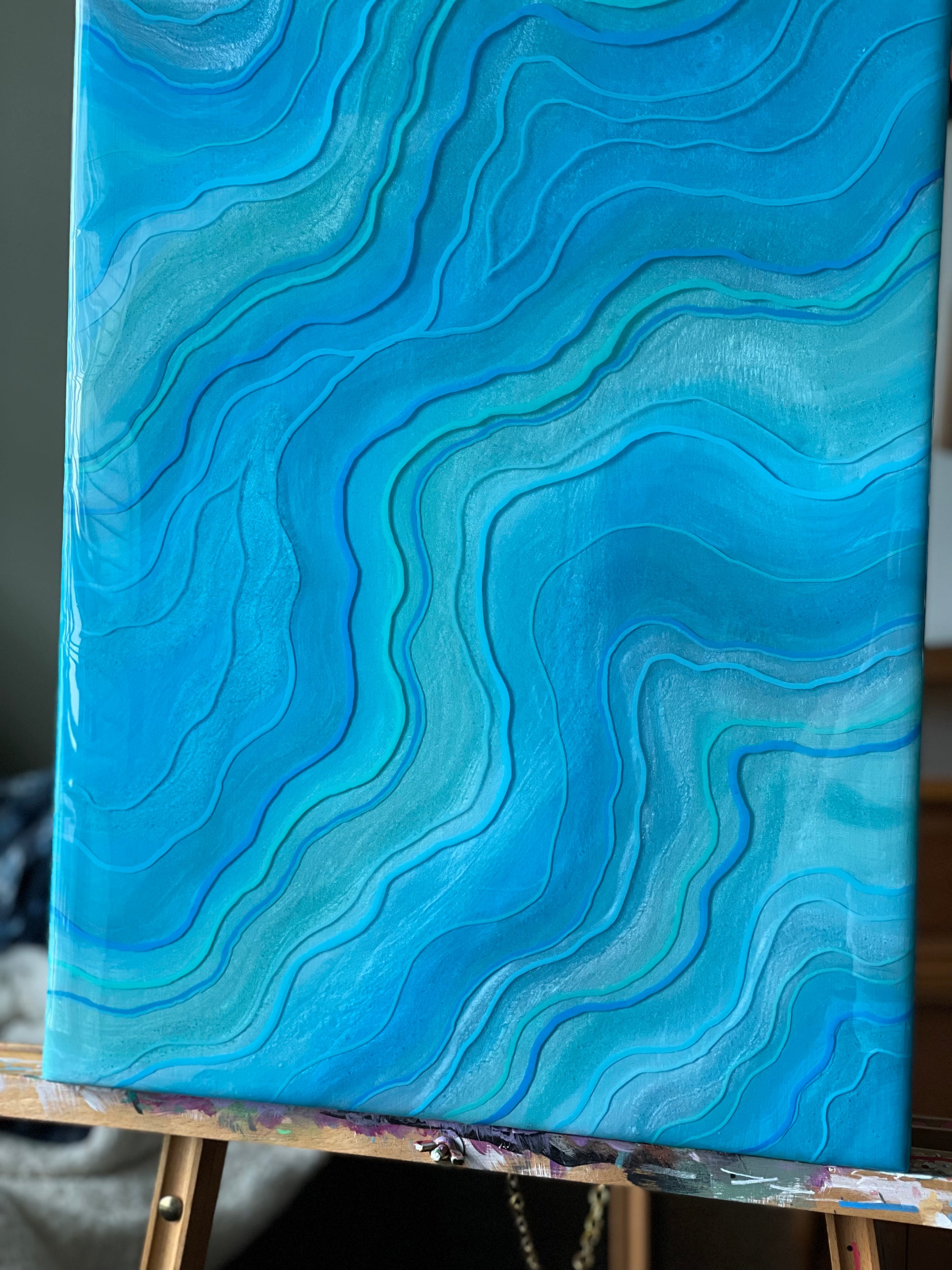 15x30in. mixed media wall art; made with a painted geode background and pigmented resin on top to increase the amount of depth within this piece.