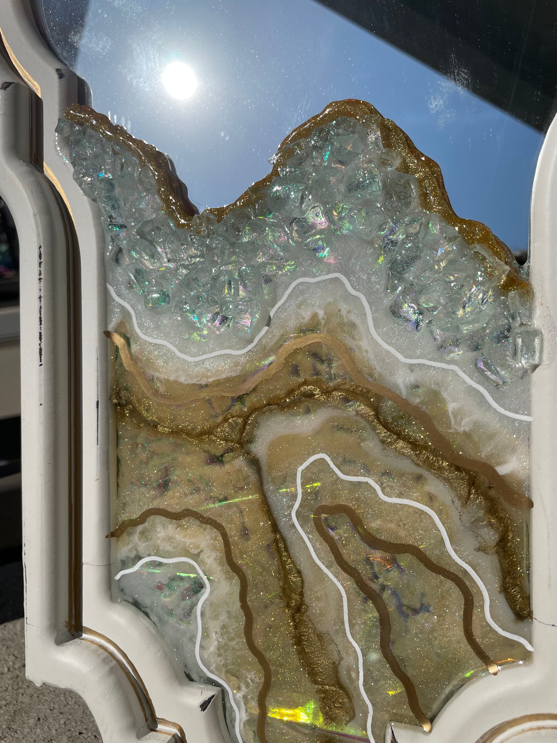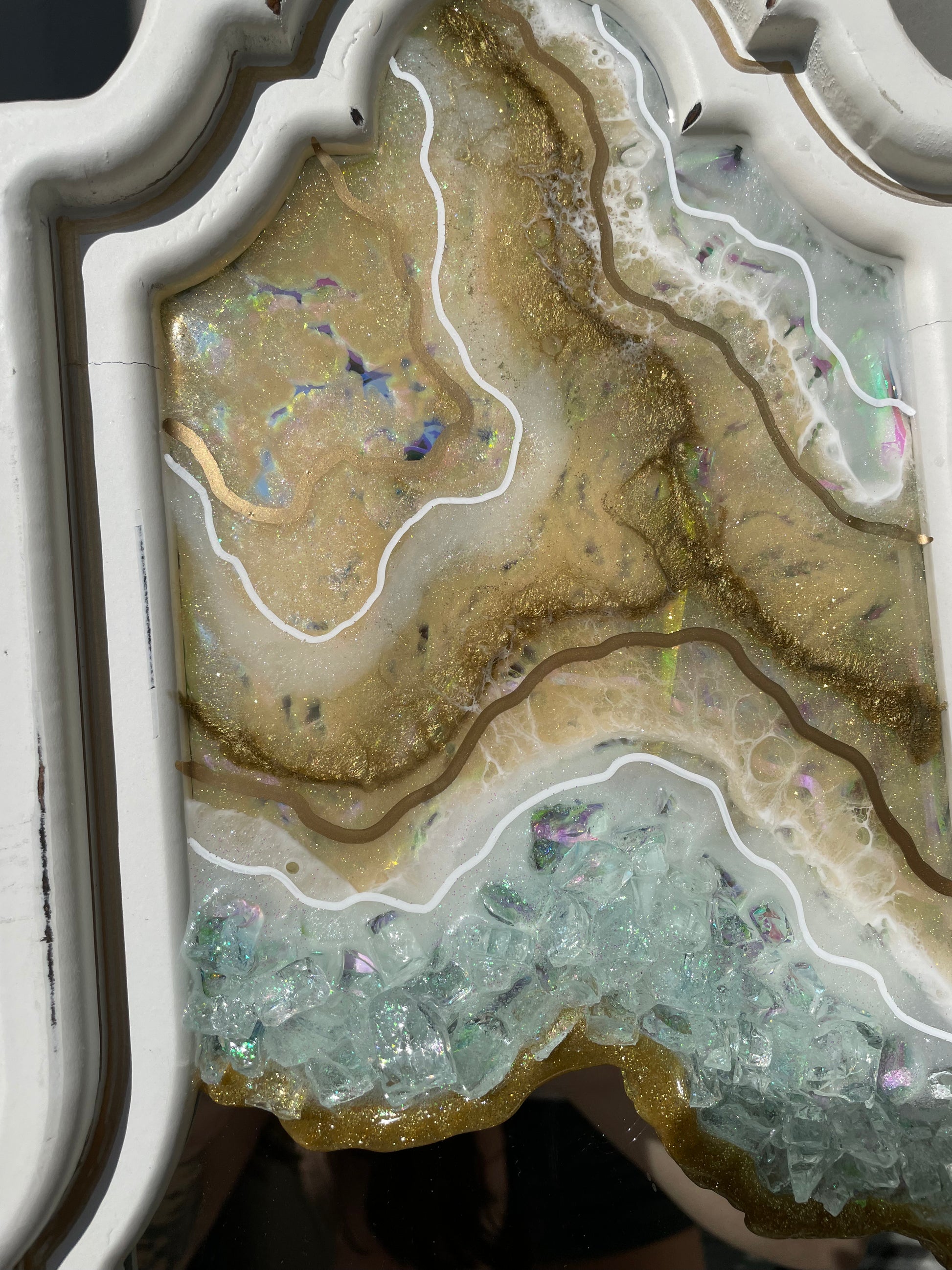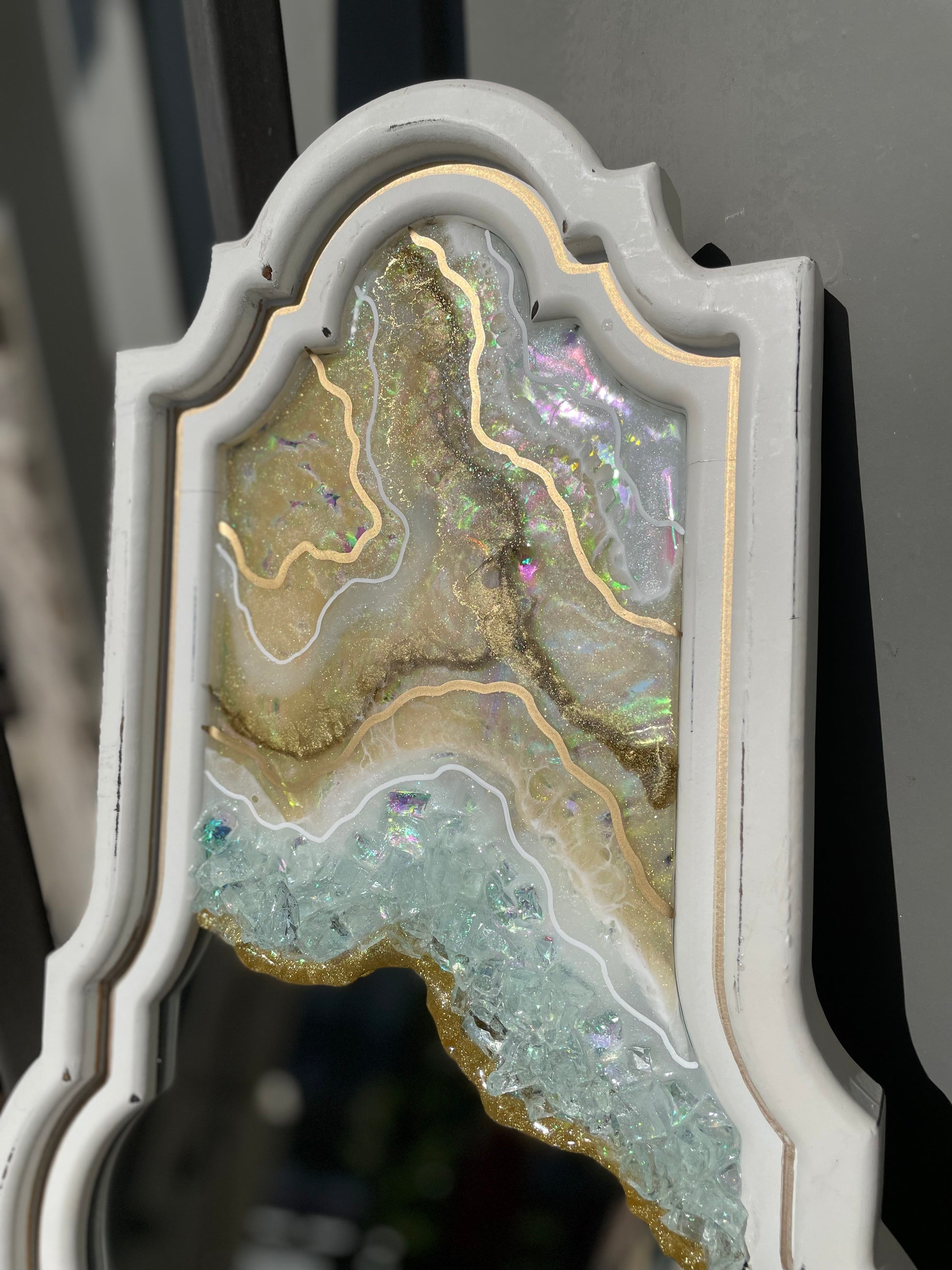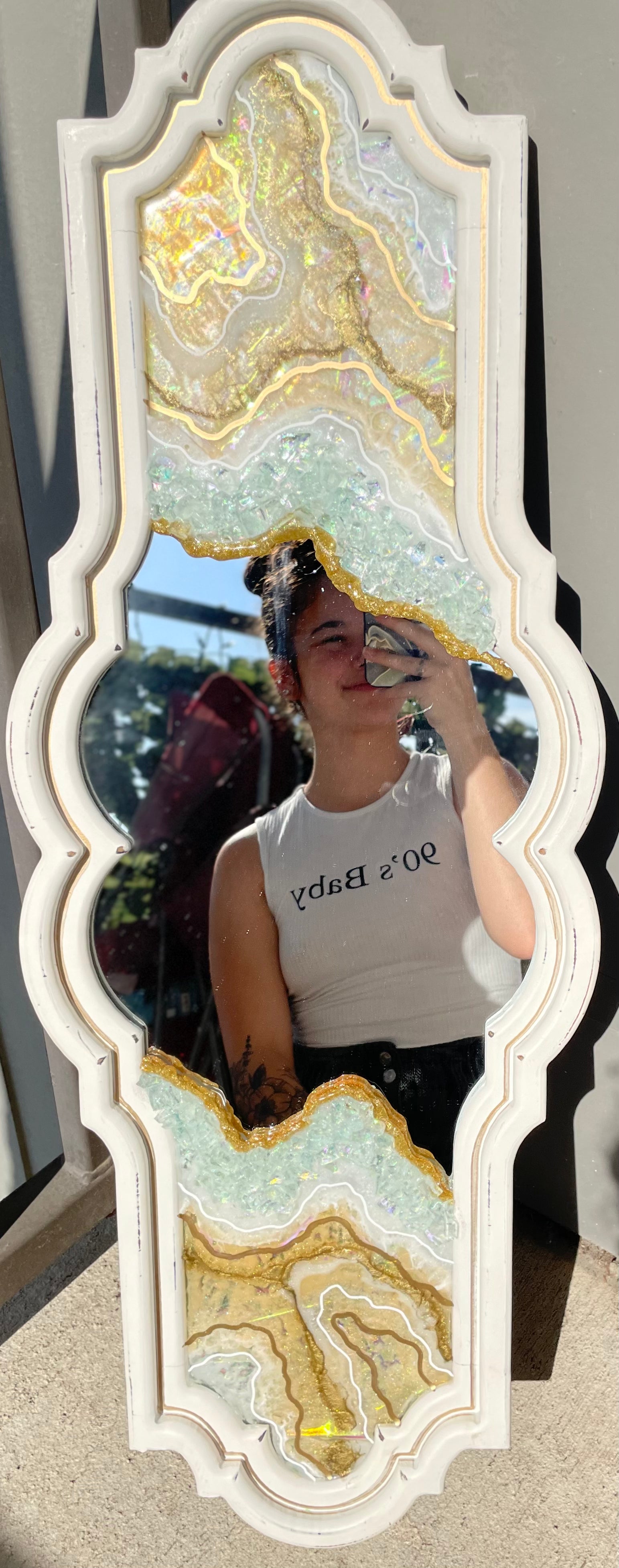 A neutral mirror for any household to add a simple elegance. This mirror is created with gold & white pigmented resin, and hints of holographic peeking through. The mirror has a distressed look along the rim making it almost look antique.