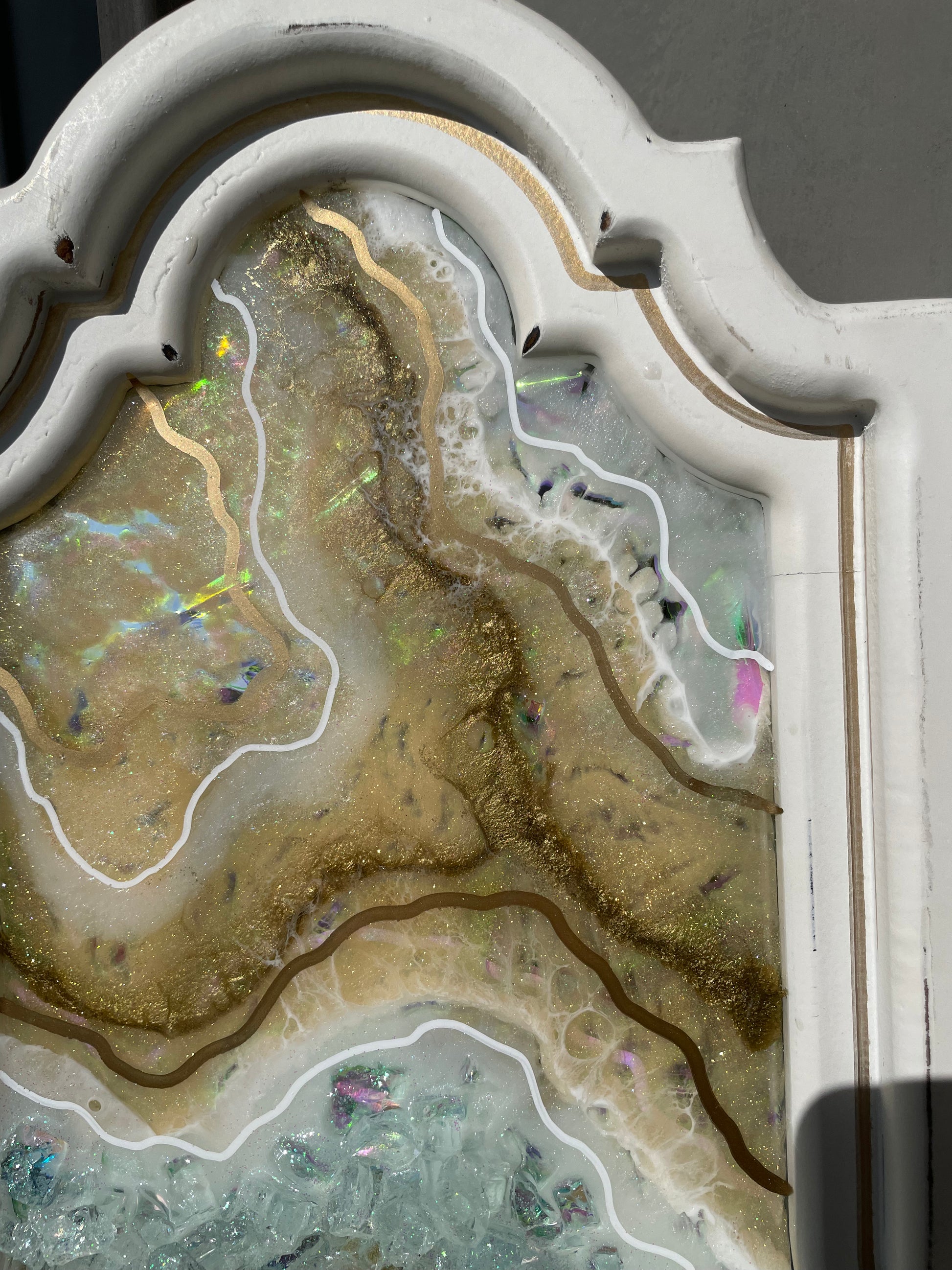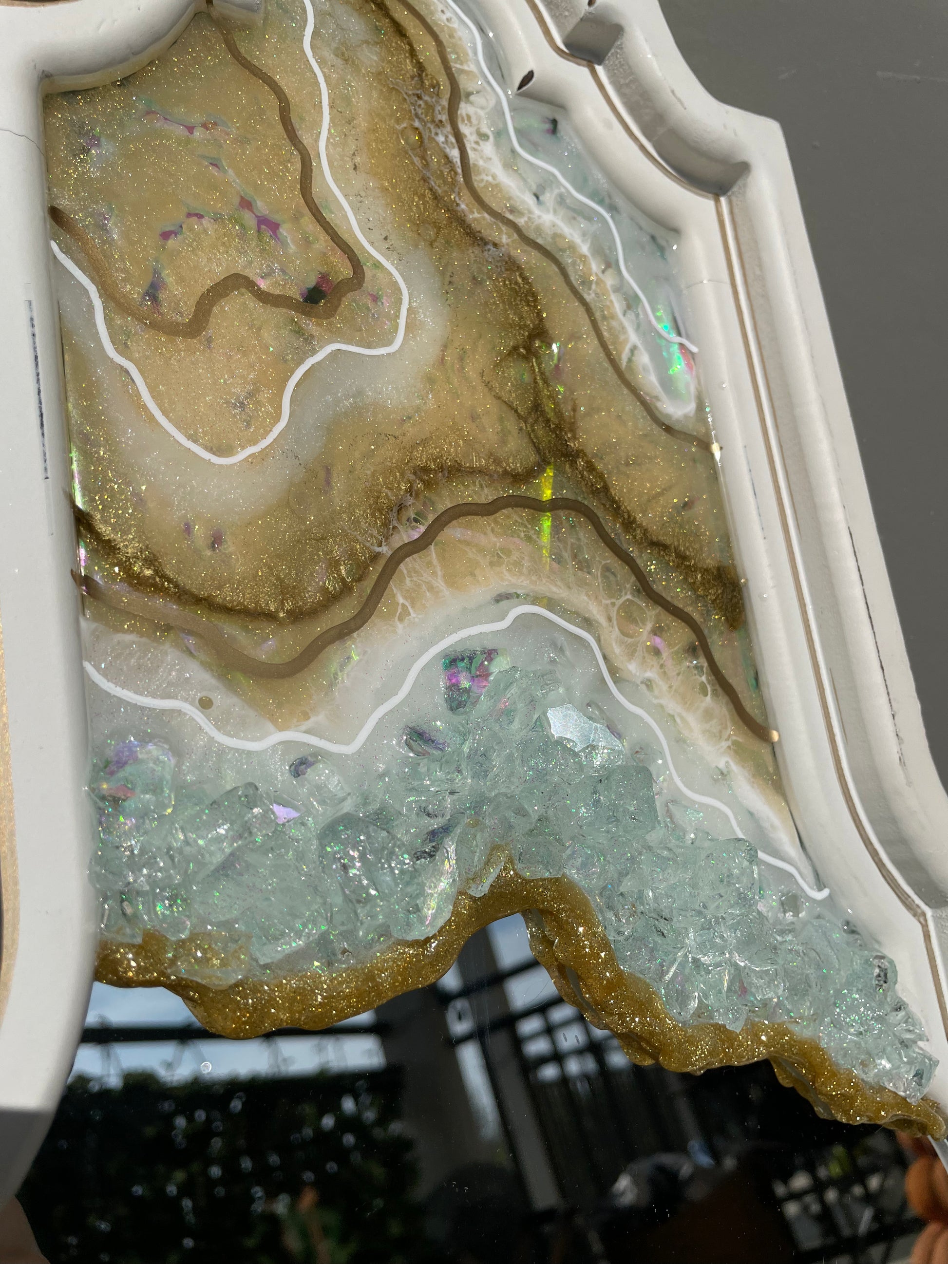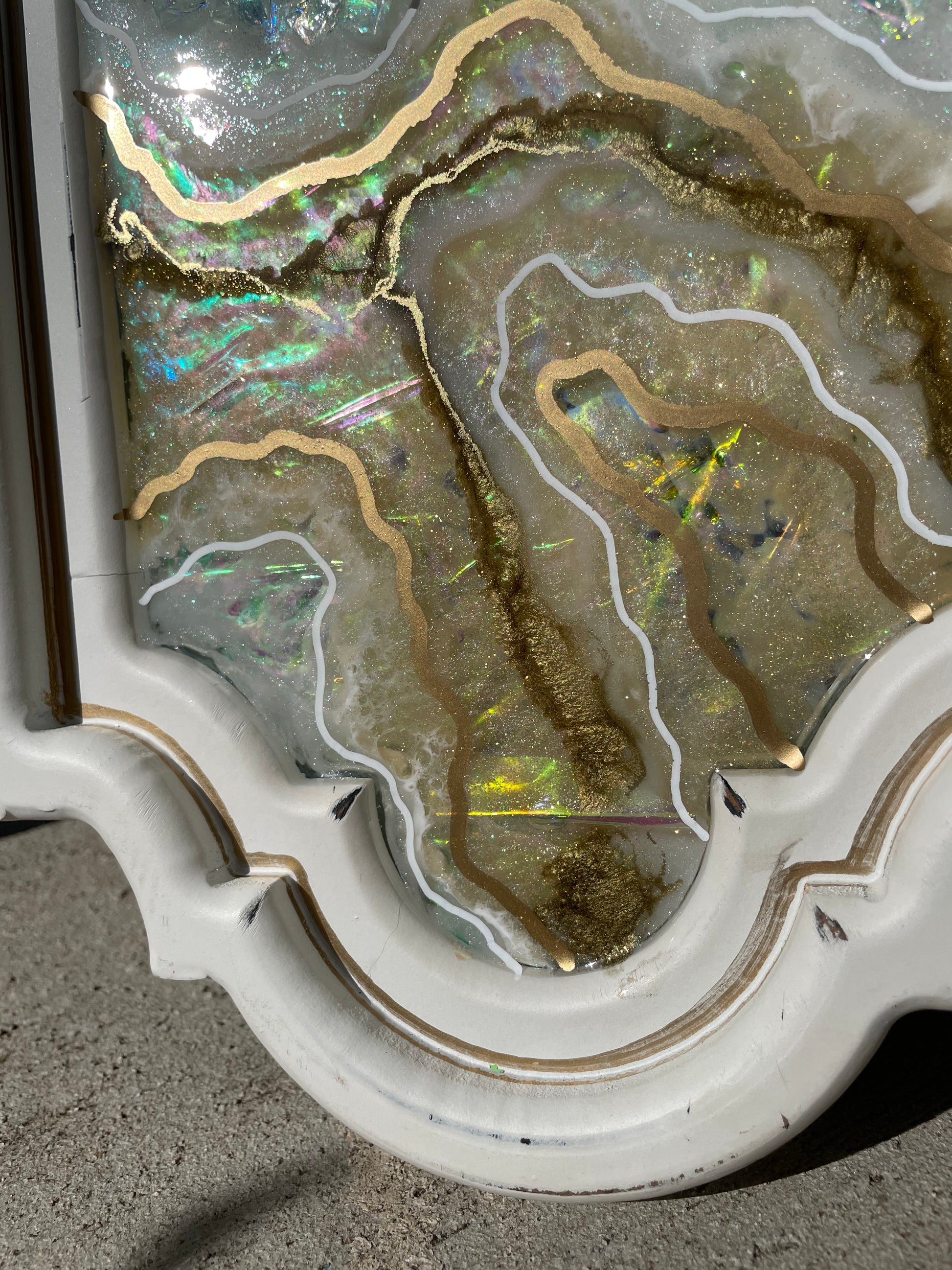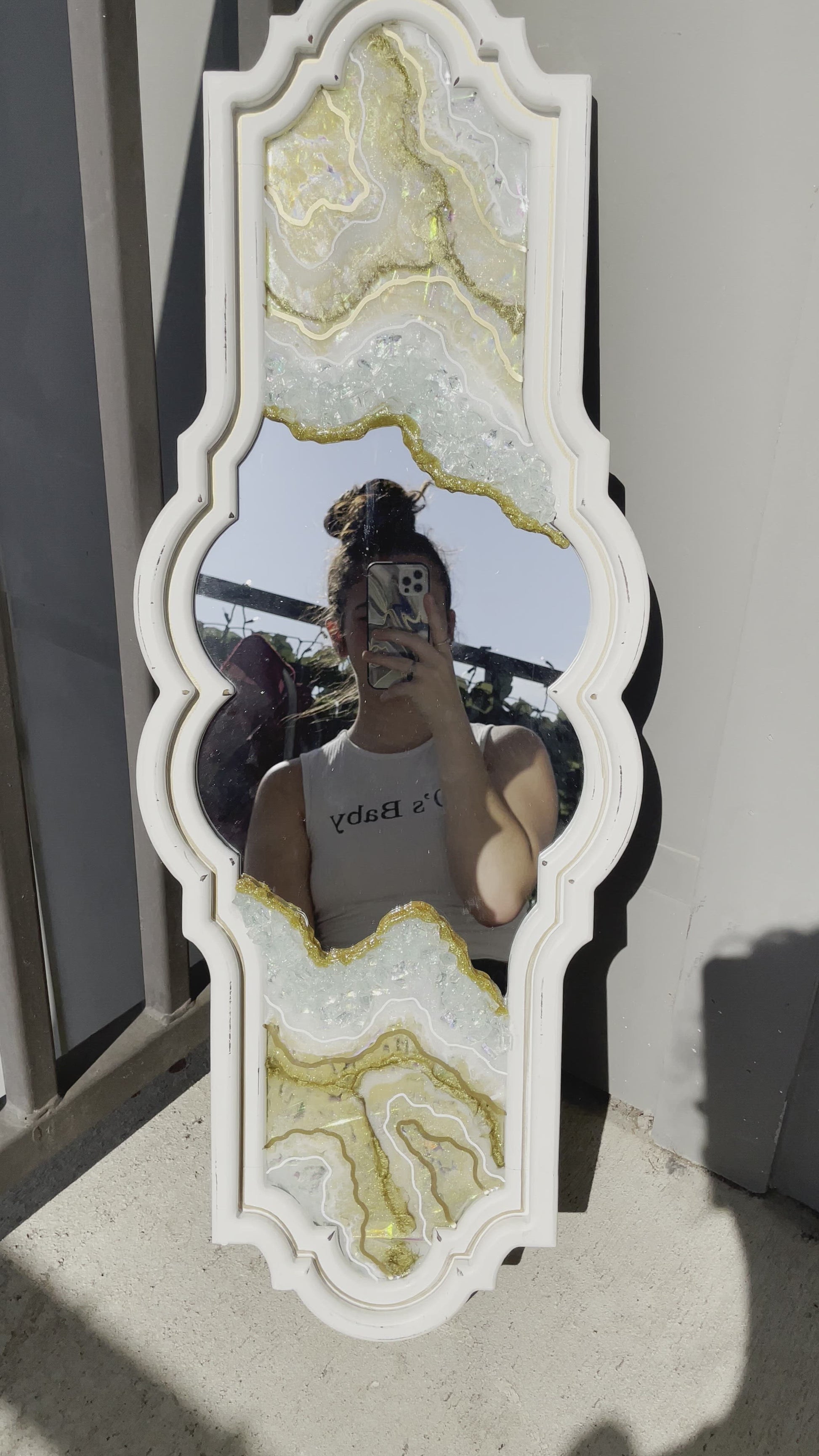 A neutral mirror for any household to add a simple elegance. This mirror is created with gold & white pigmented resin, and hints of holographic peeking through. The mirror has a distressed look along the rim making it almost look antique.